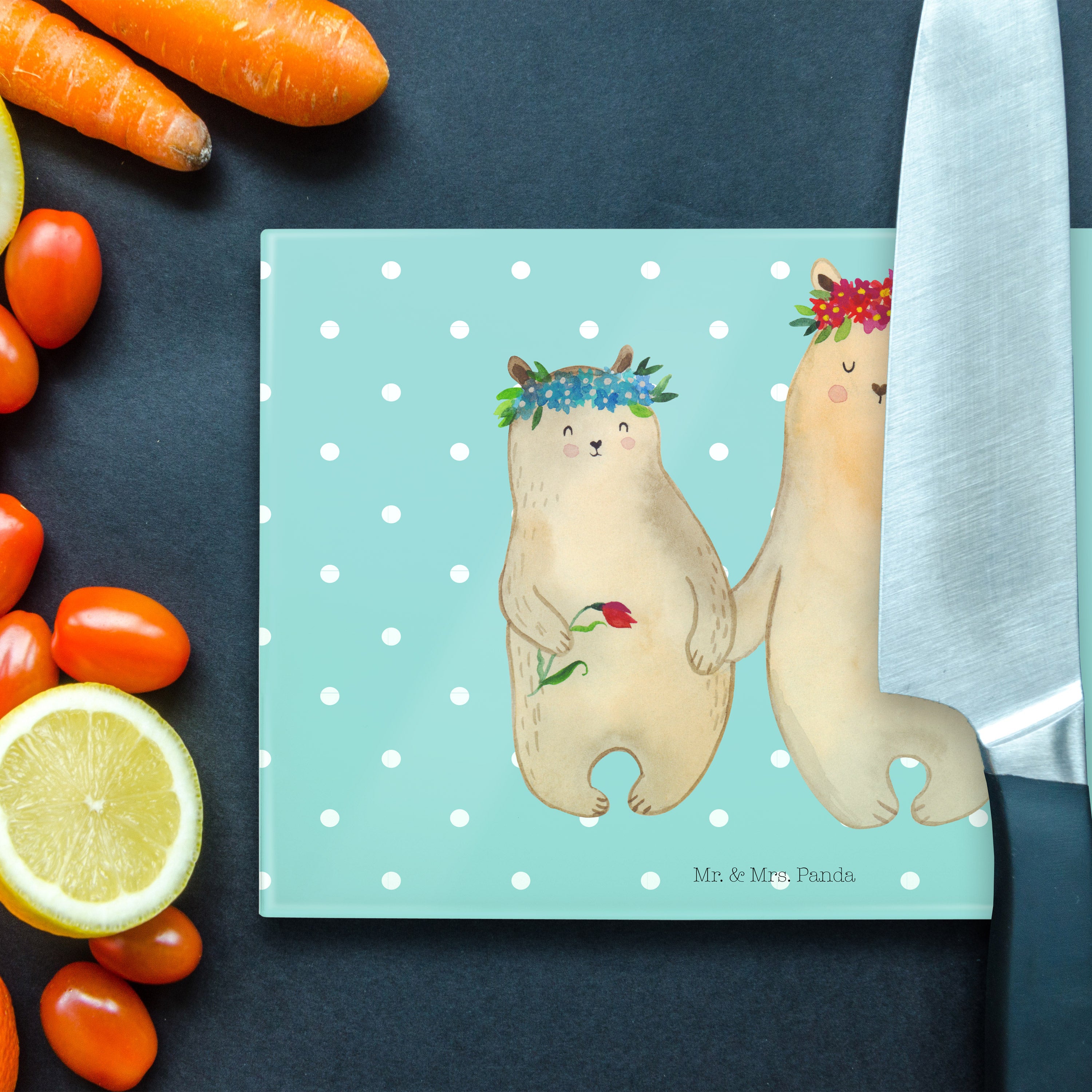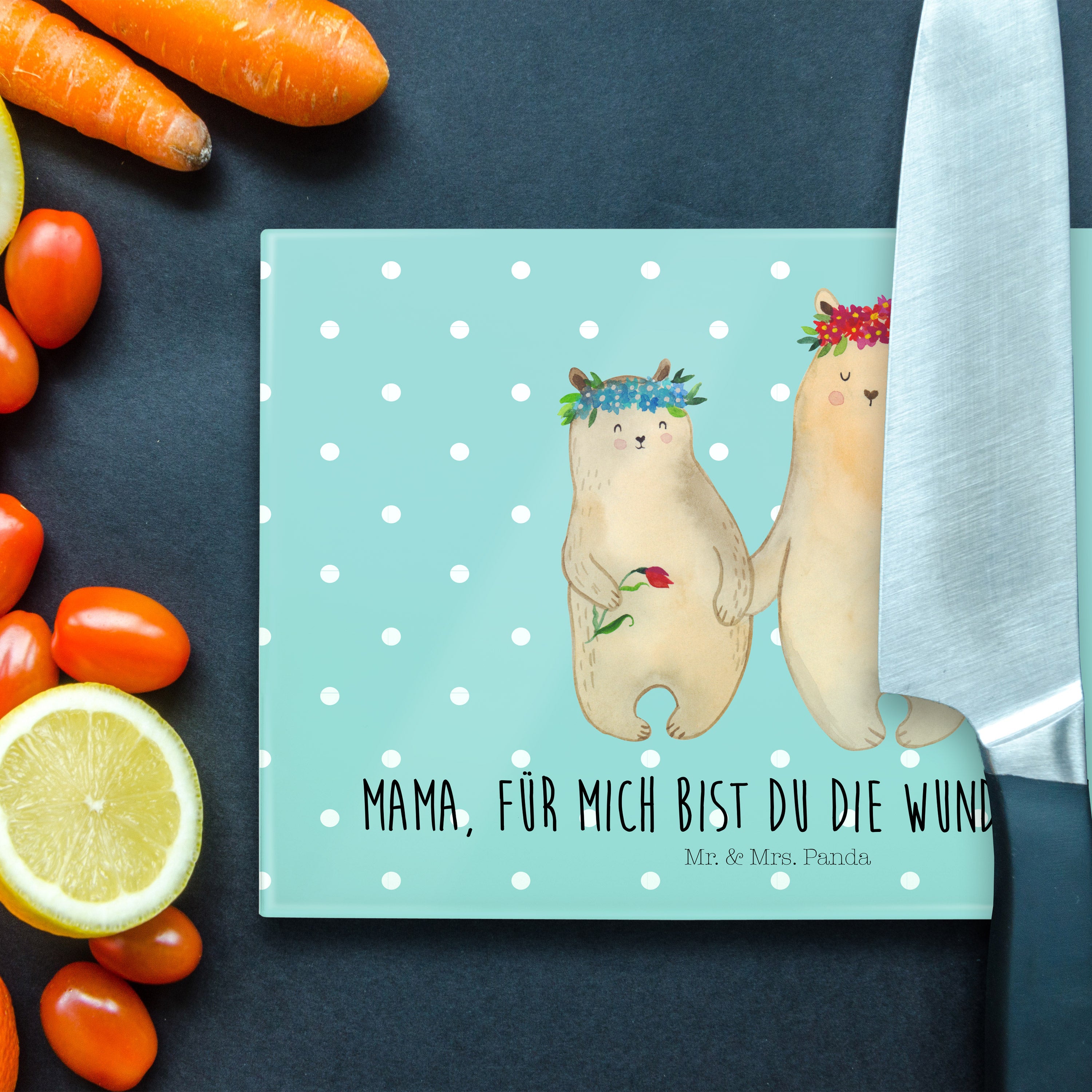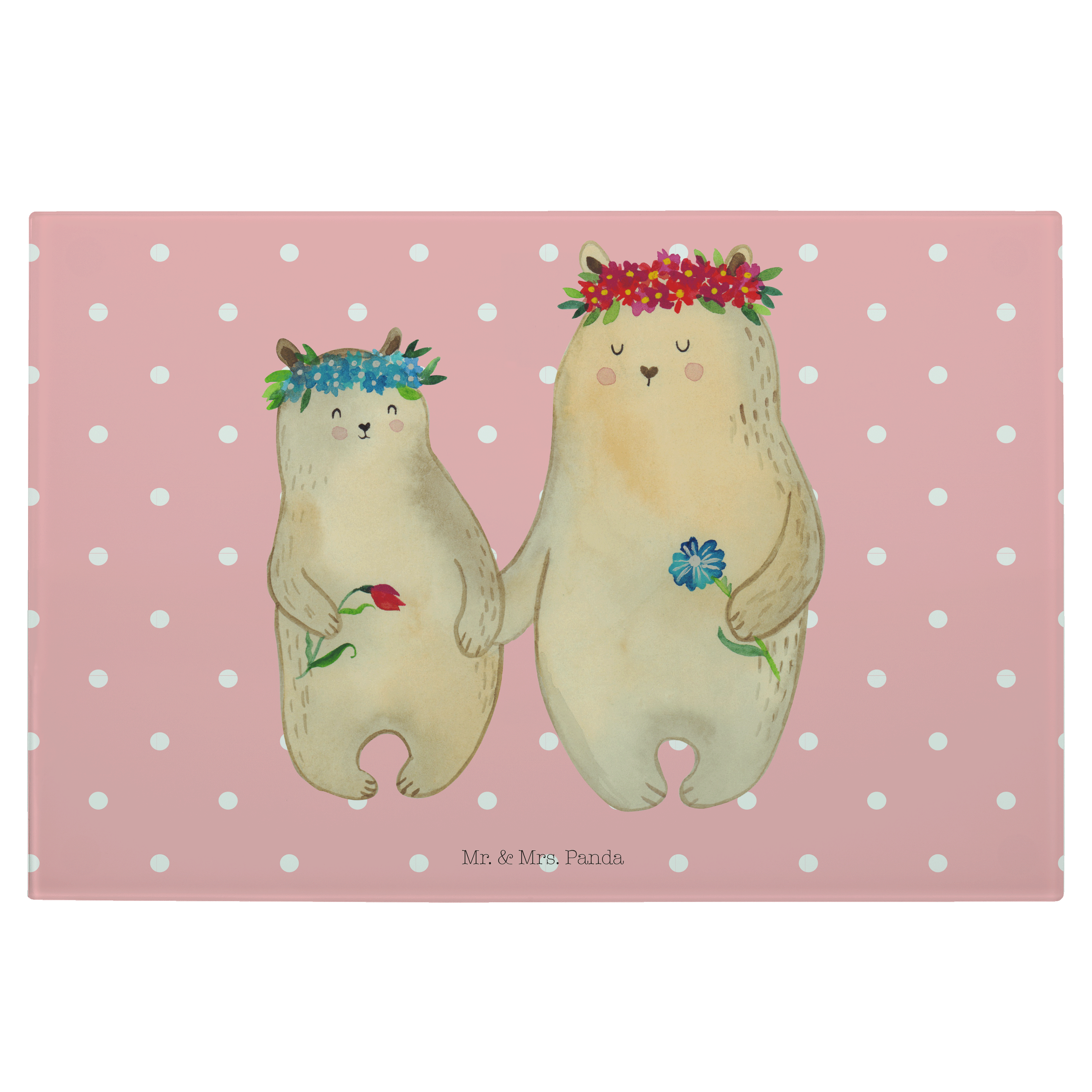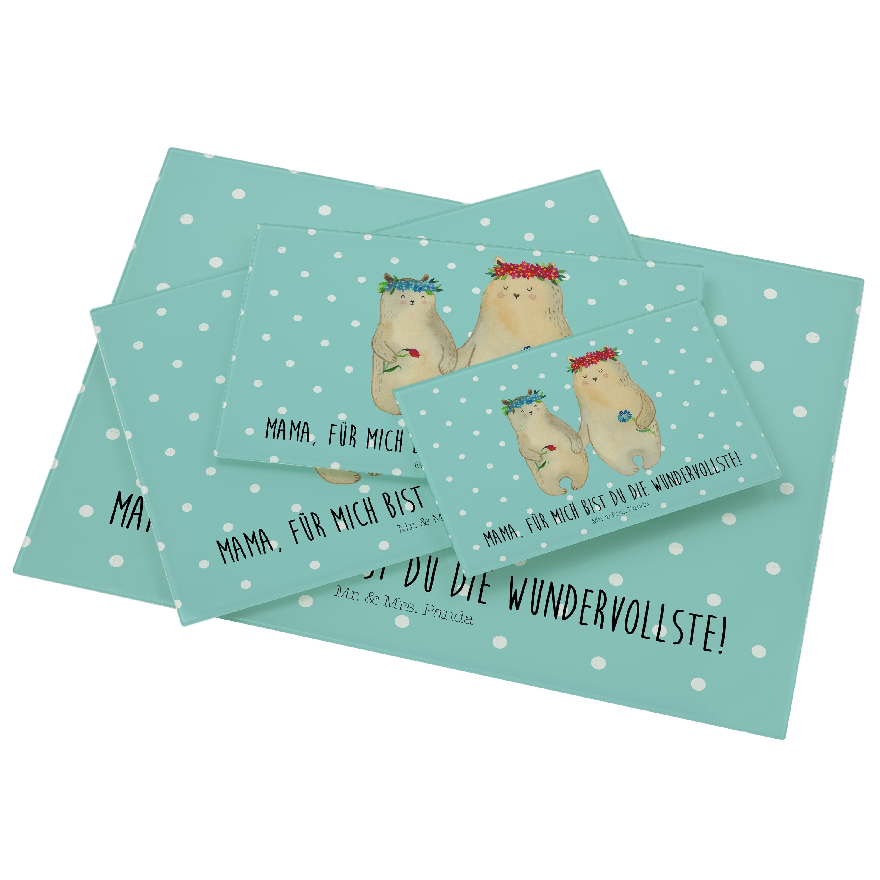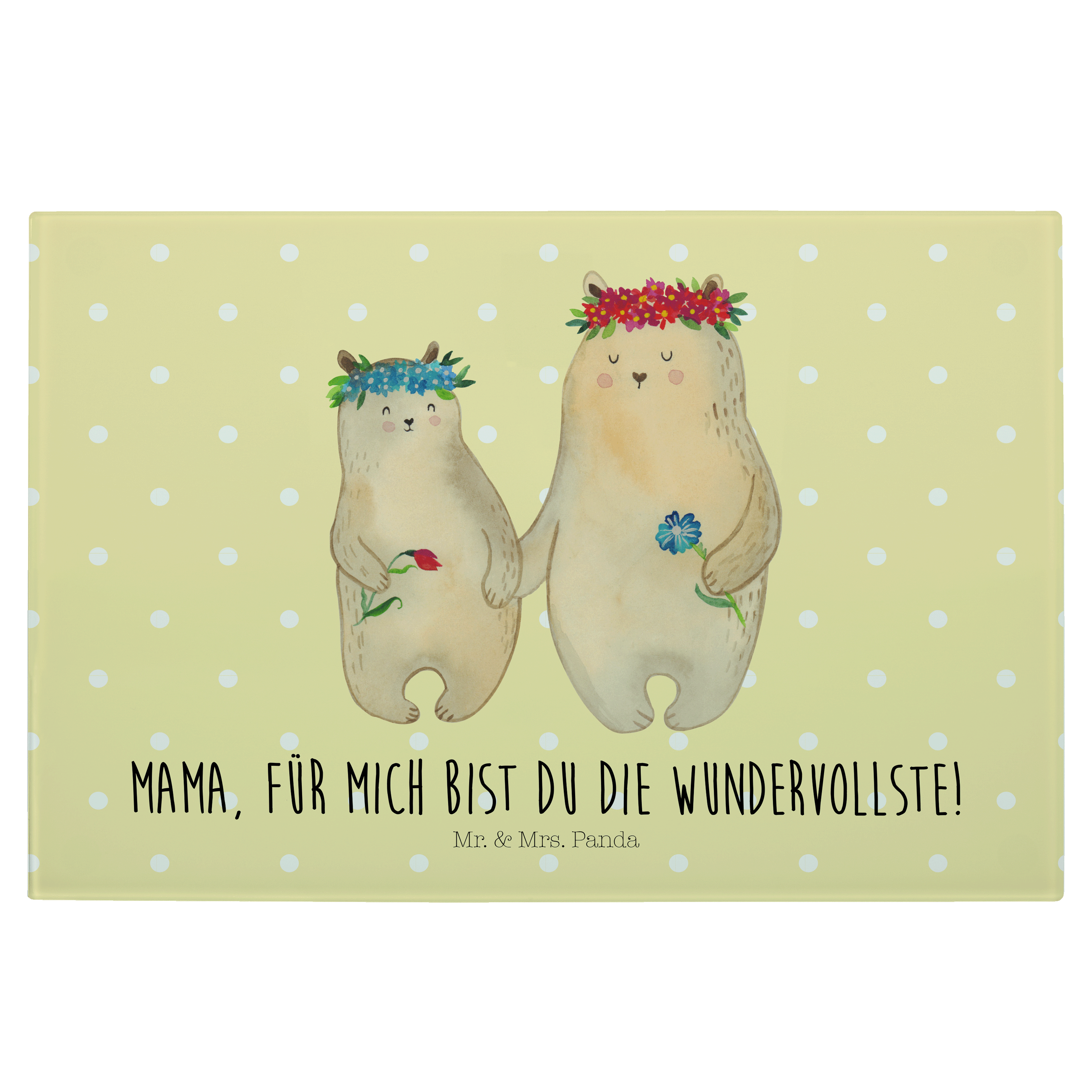 Medium Glas Schneidbrett Bären mit Blumenkranz - mit Spruch - Blau Pastell