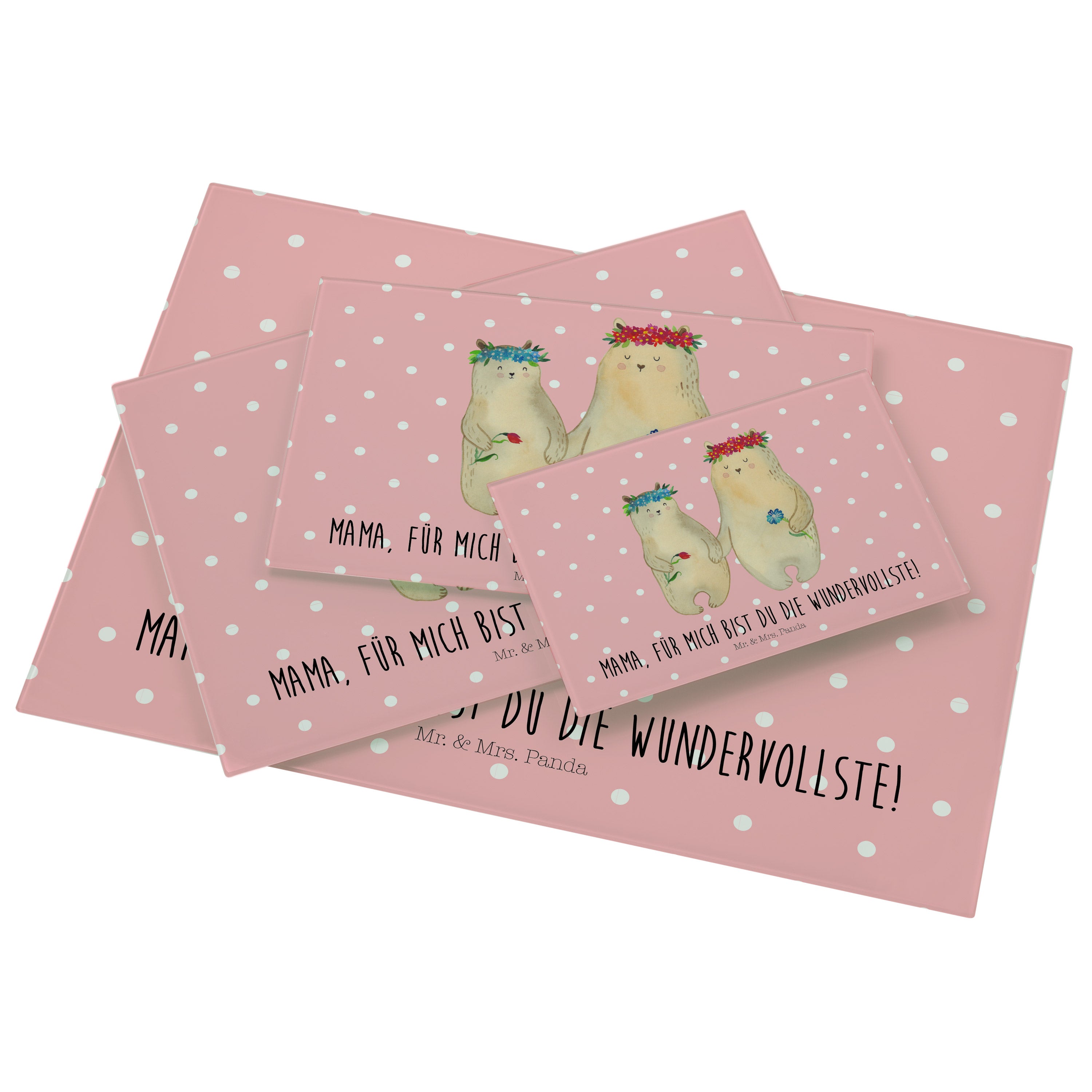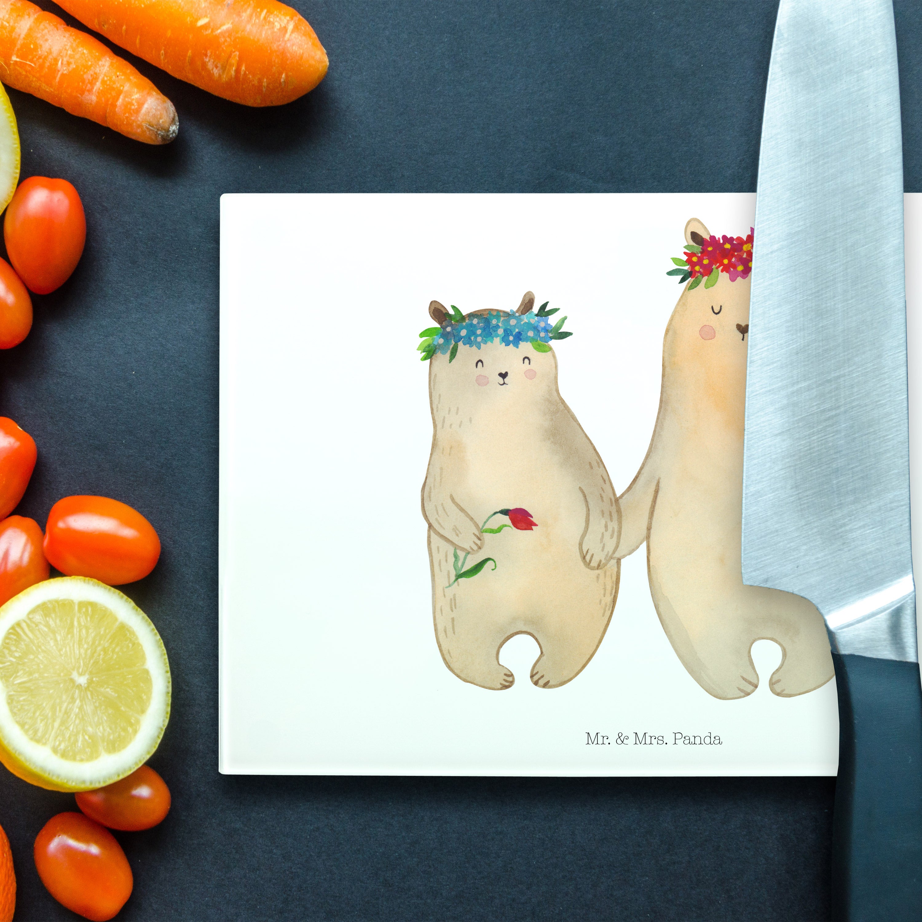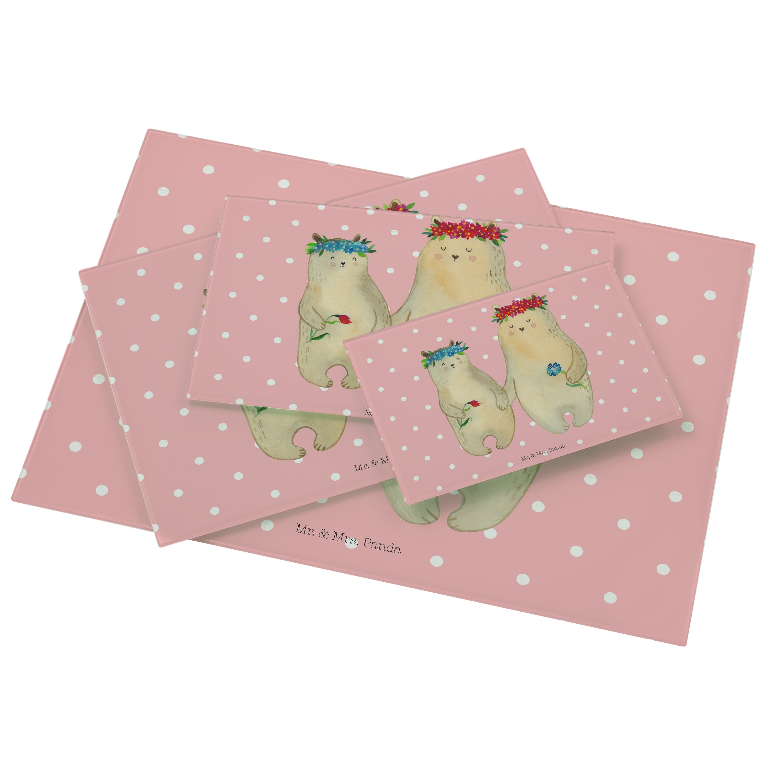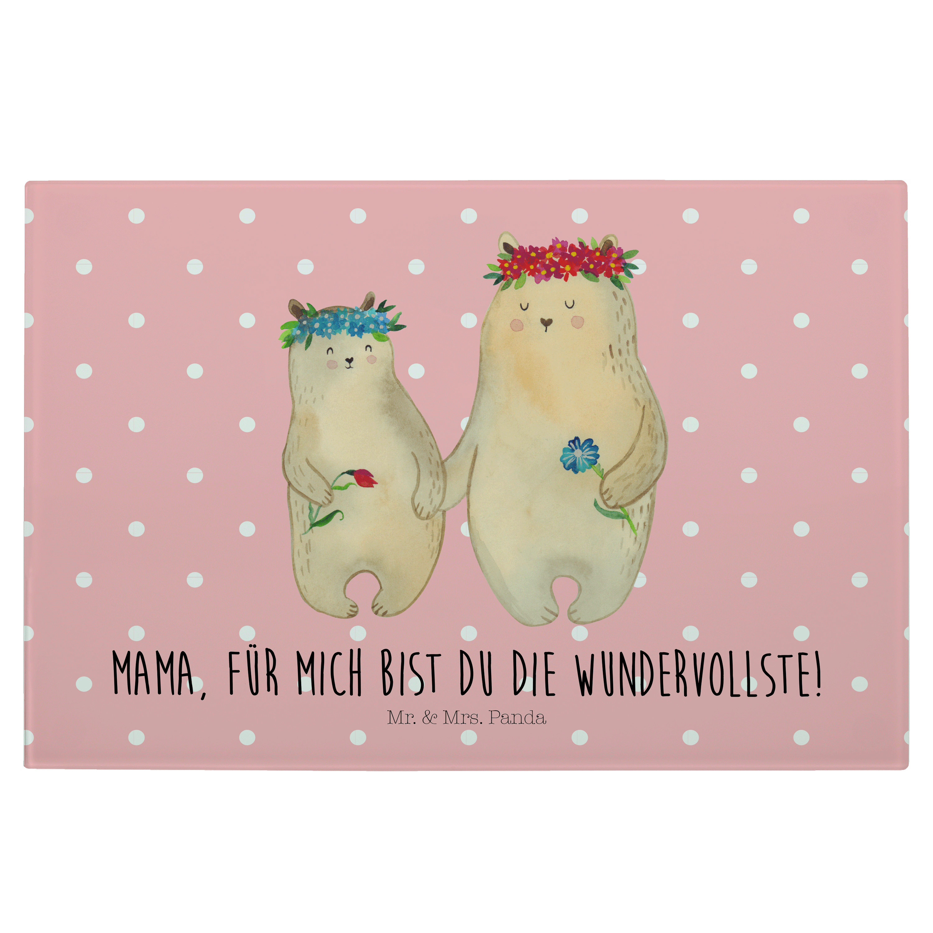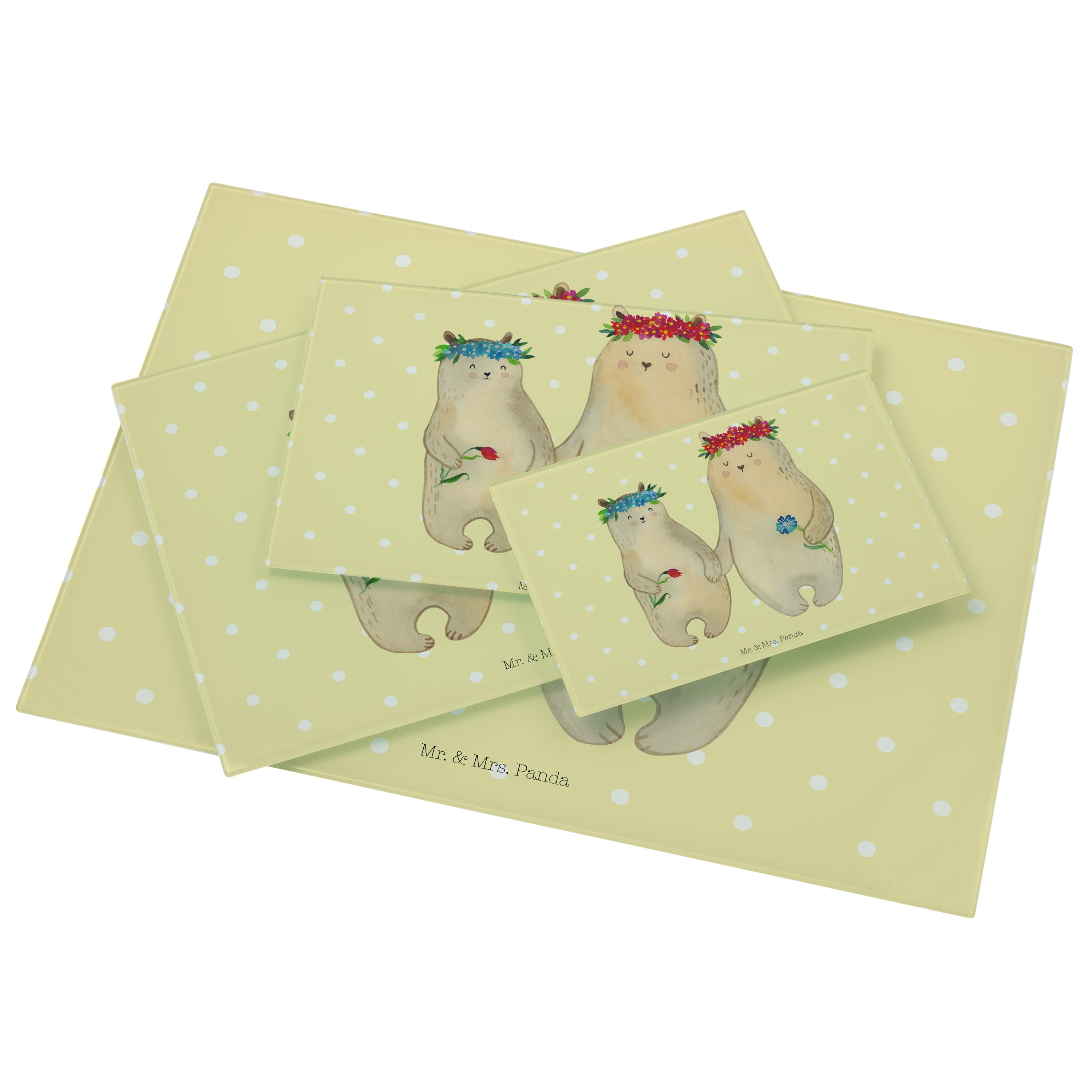 Medium Glas Schneidbrett Bären mit Blumenkranz - mit Spruch - Blau Pastell