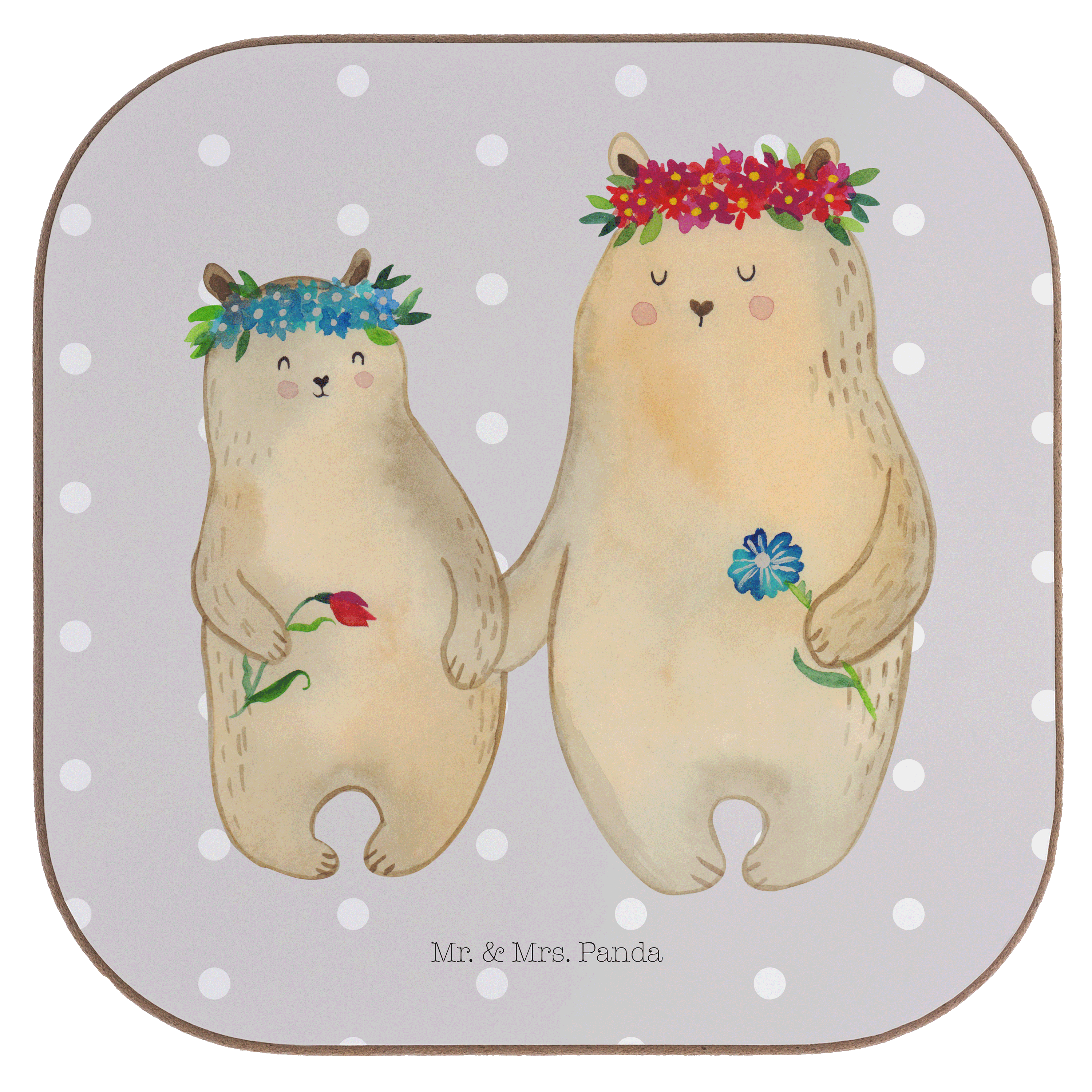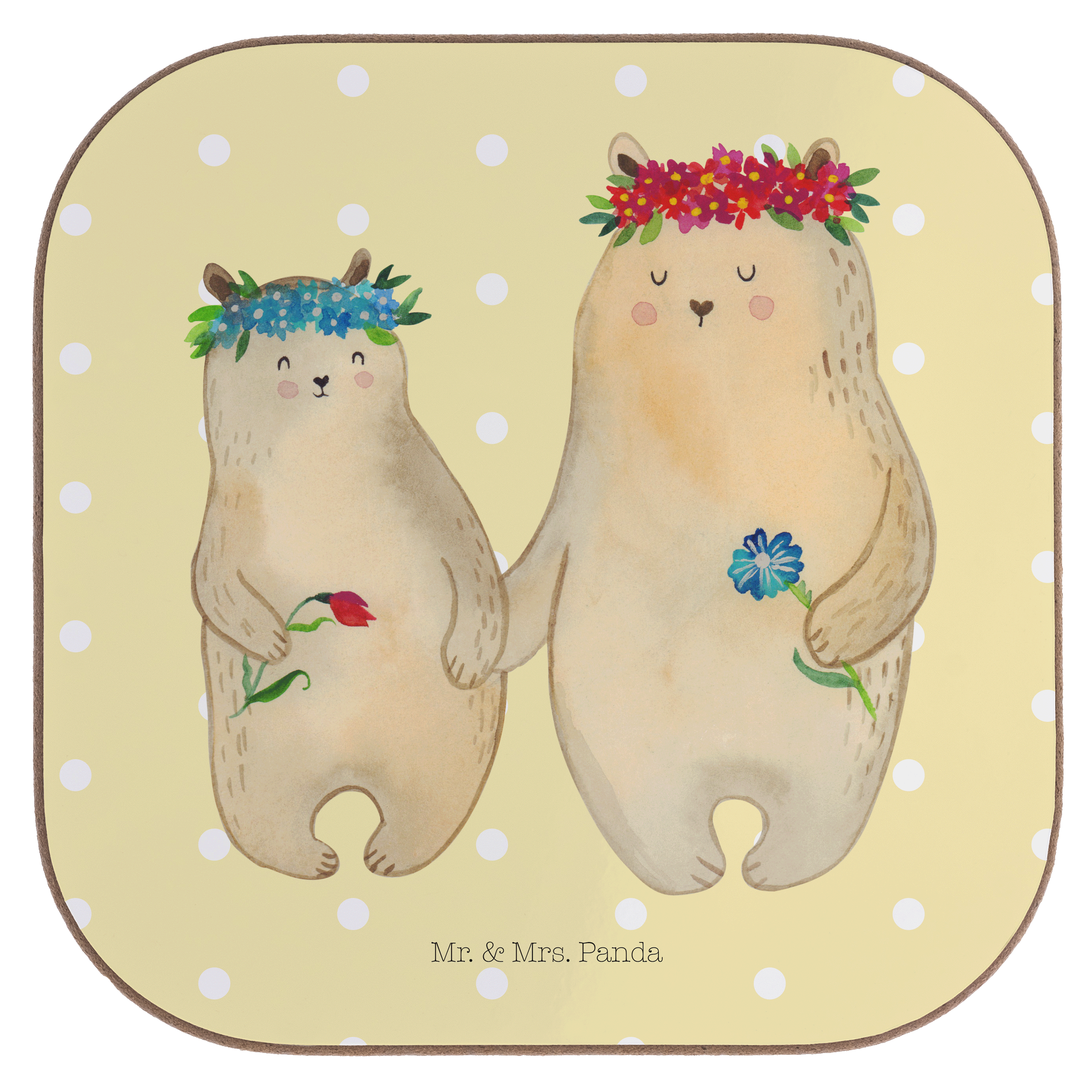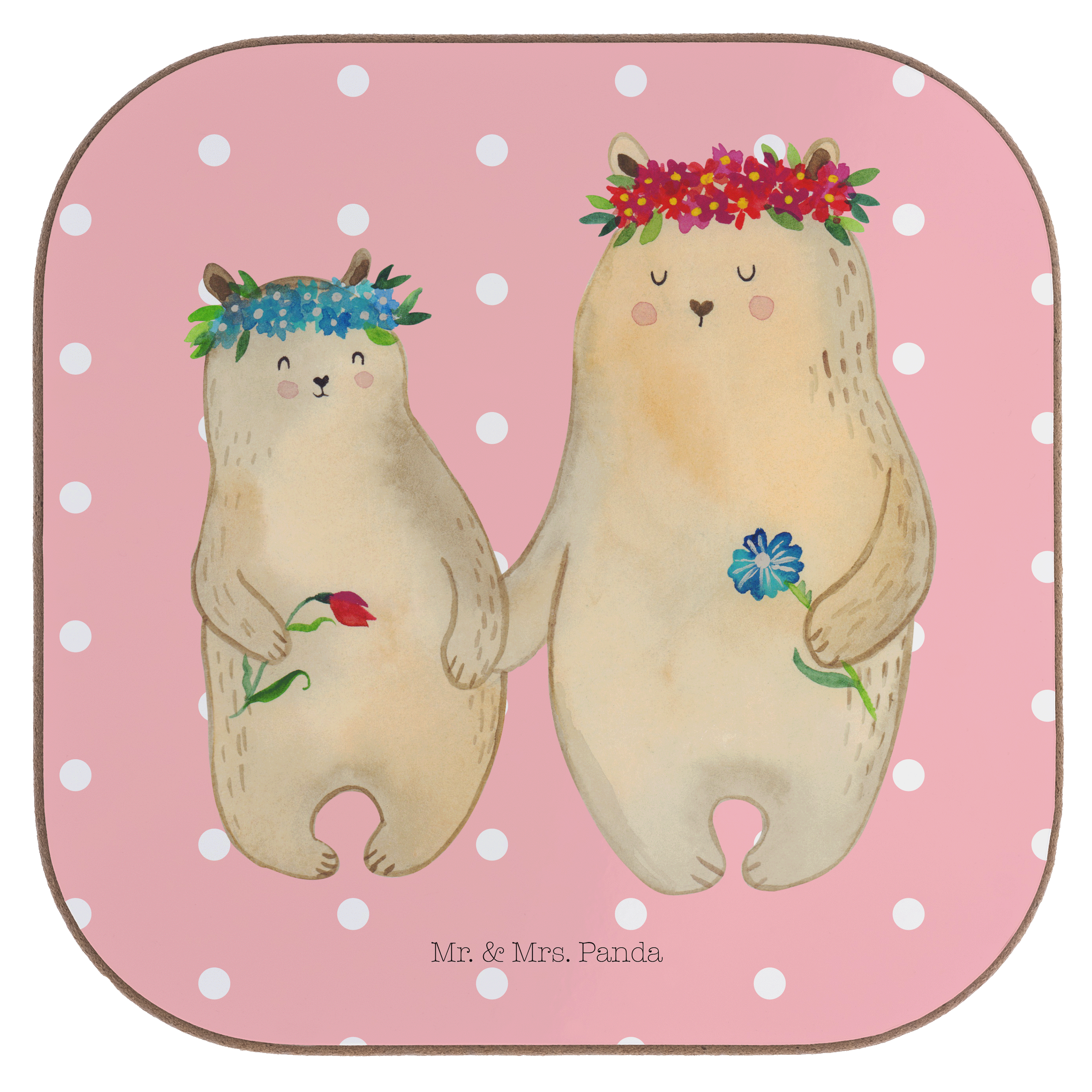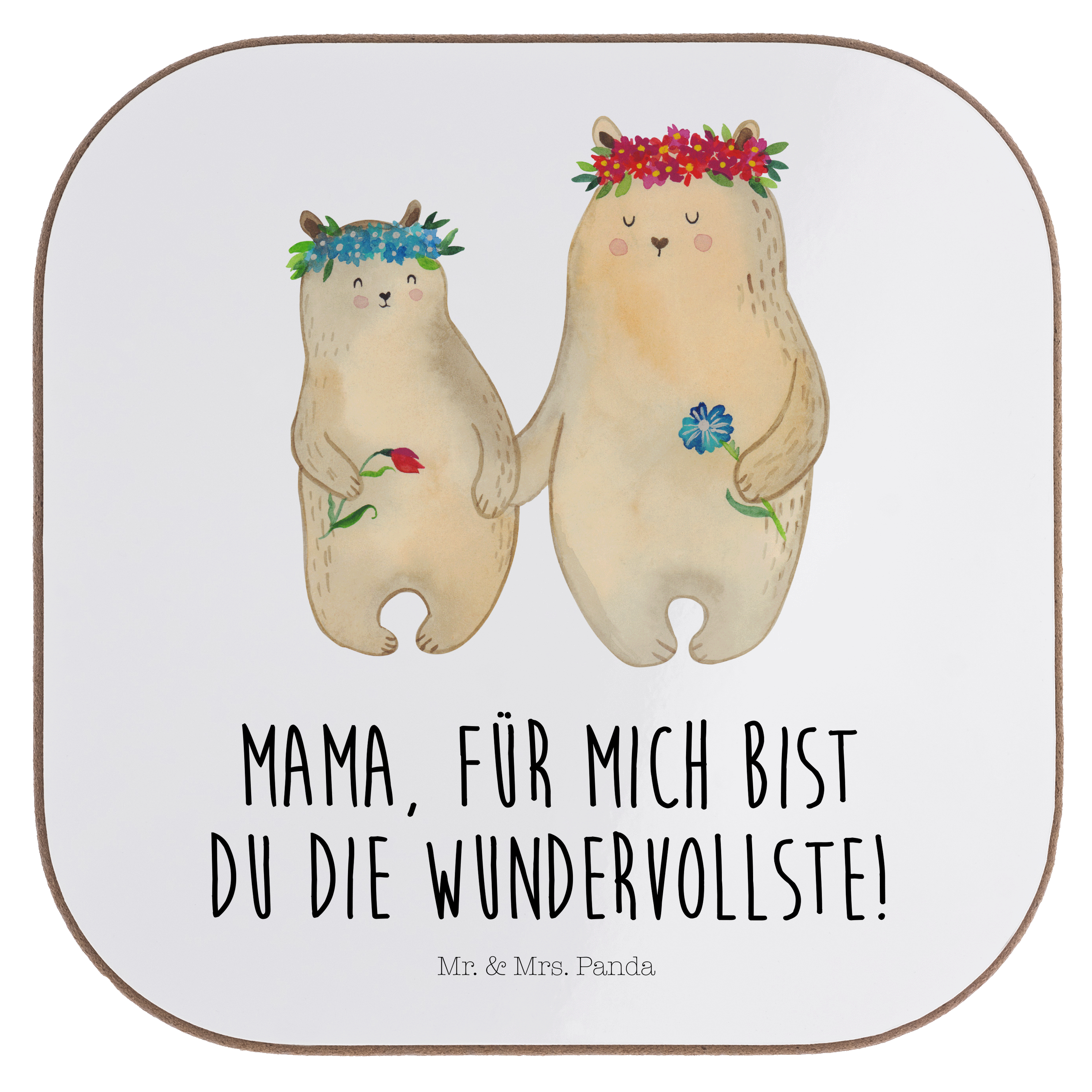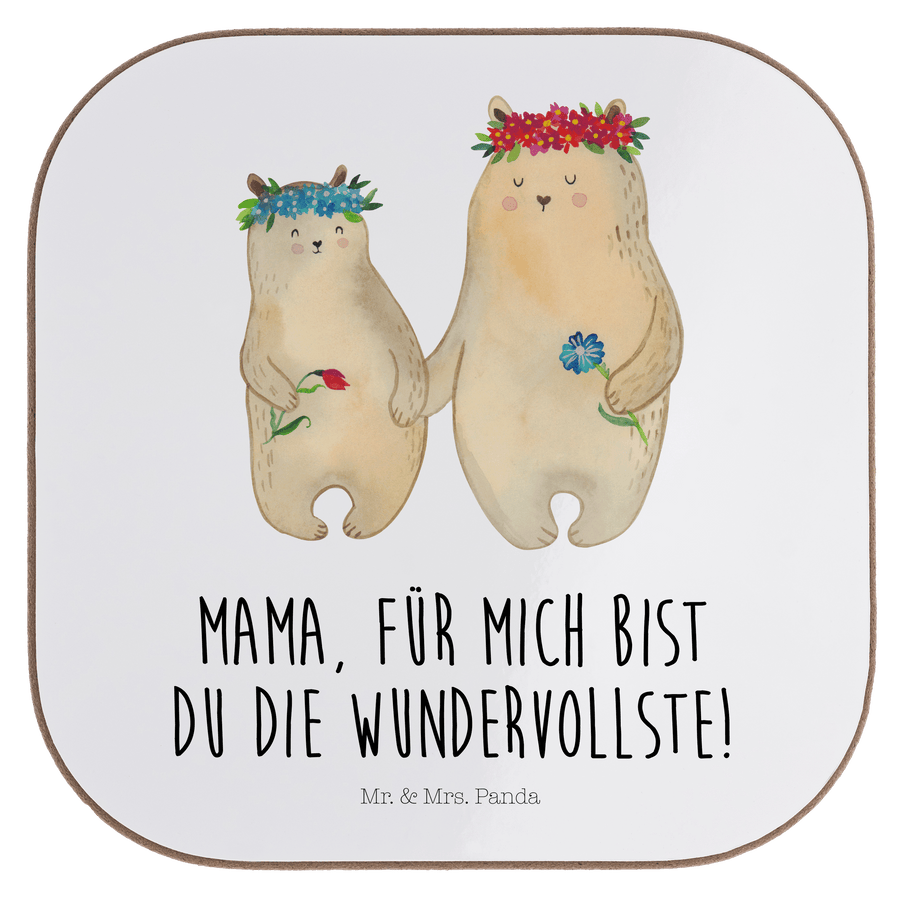 Quadratische Untersetzer Bären mit Blumenkranz - mit Spruch - Weiß