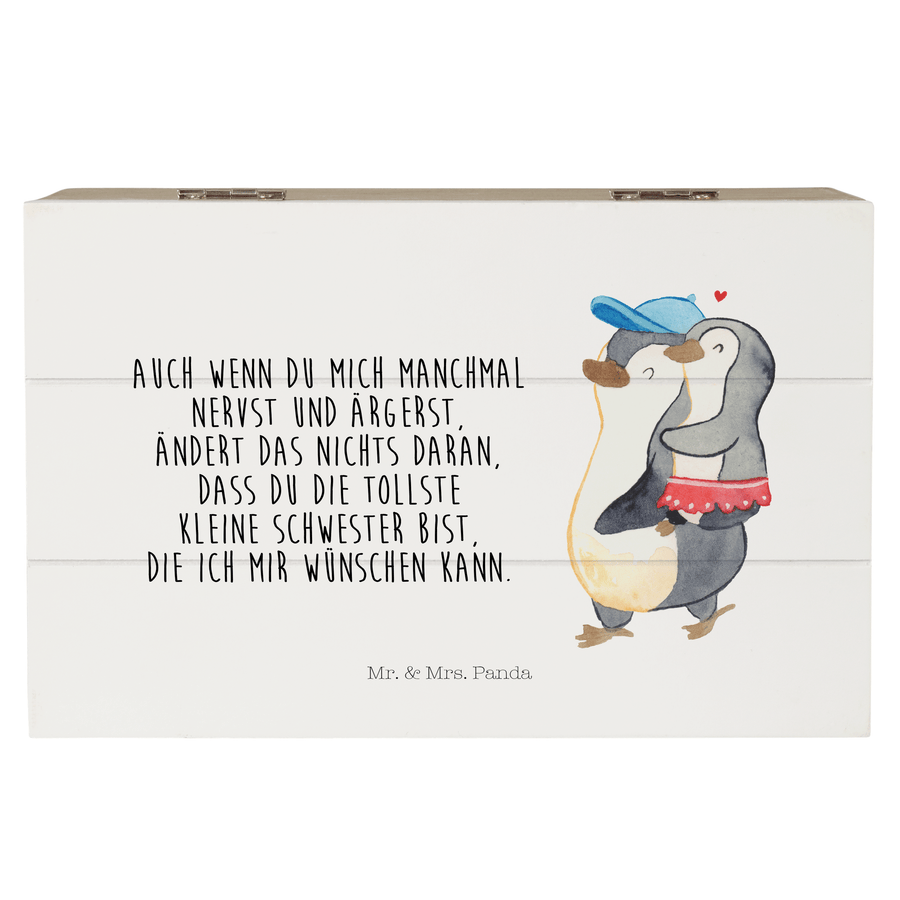 Holzkiste Pinguin Kleine Schwester - 19 x 12 cm - mit Spruch - Weiß