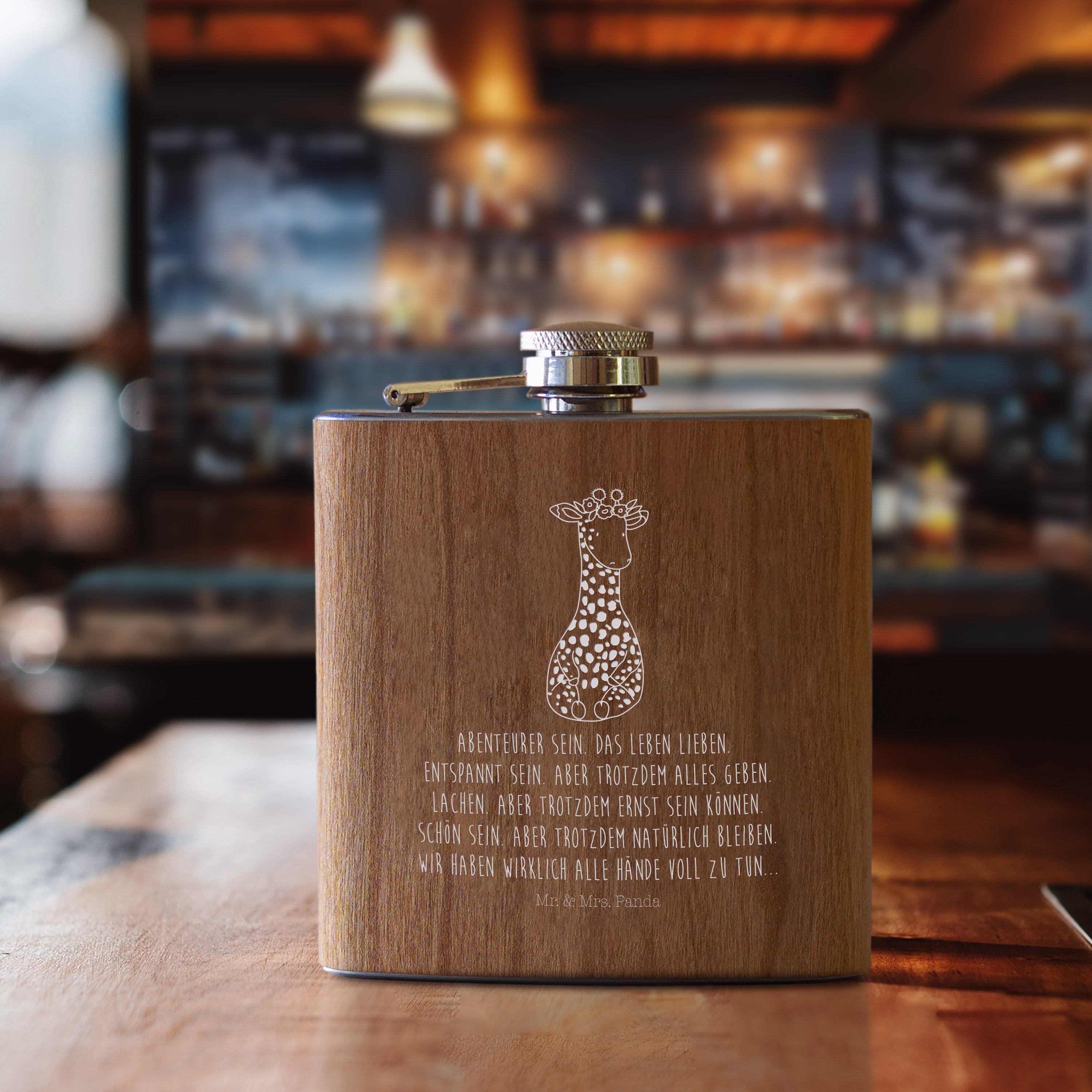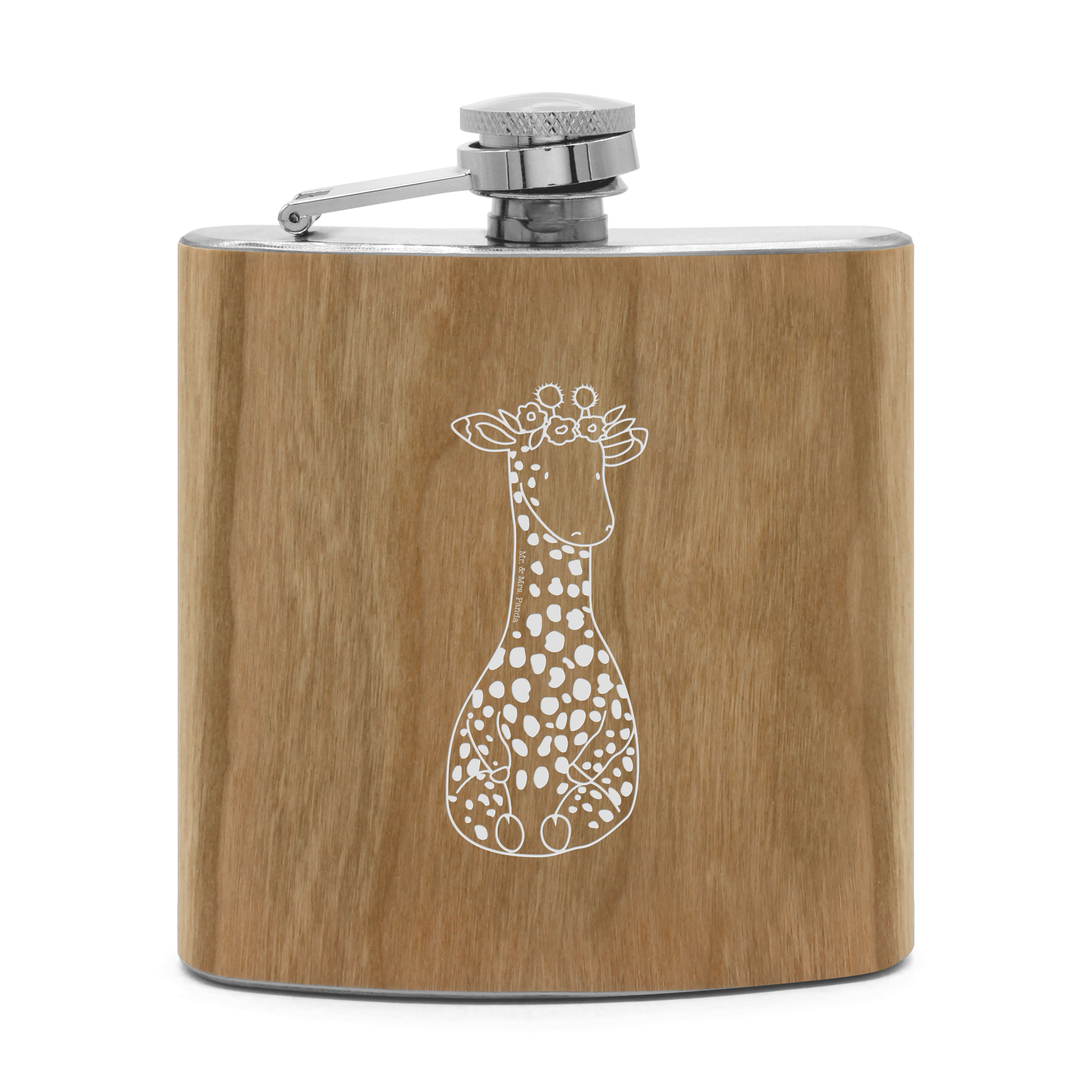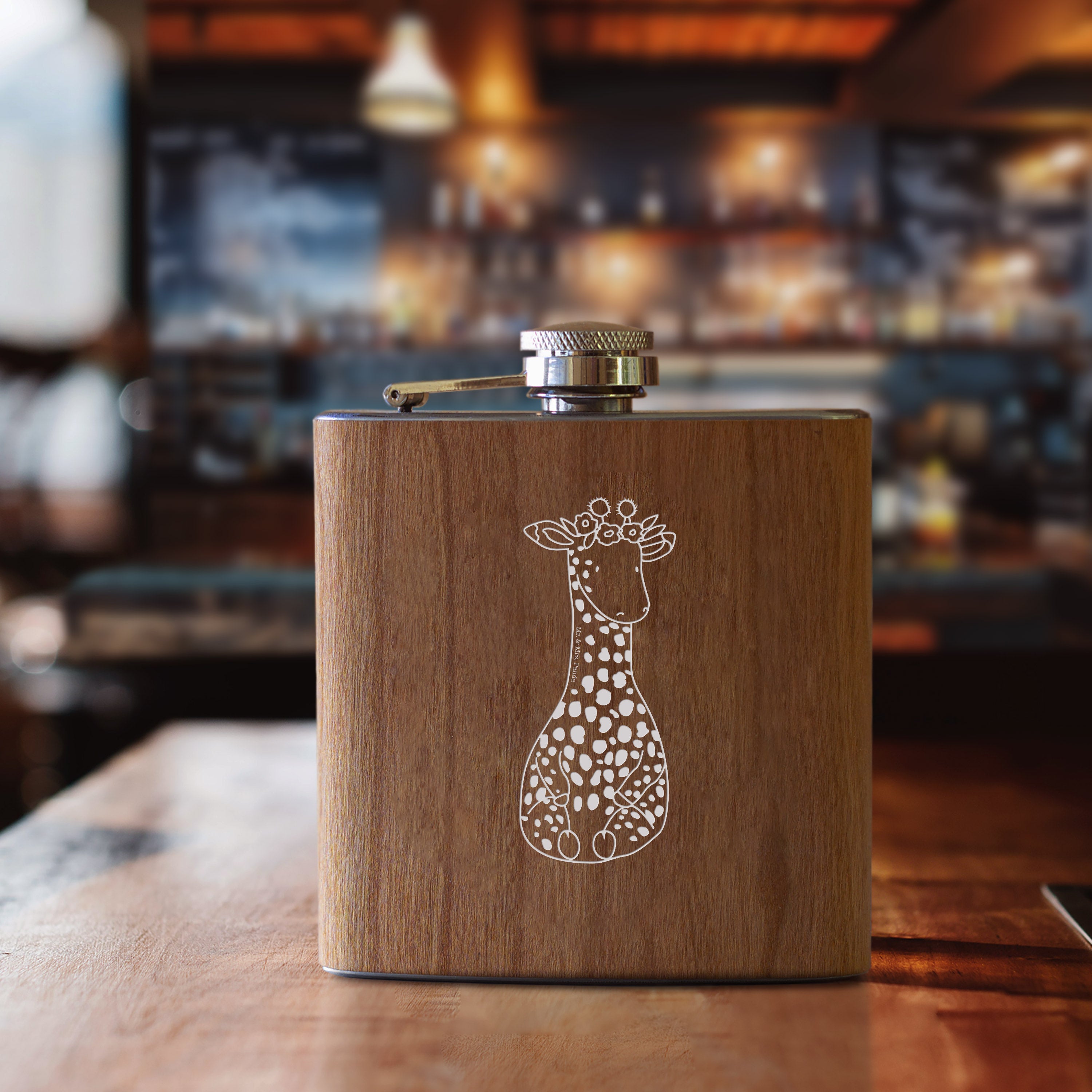 Flachmann Giraffe Blumenkranz Flachmann, Edelstahl, hochwertig, Gravur, Taschenflasche, Frauen, Afrika, Wildtiere, Giraffe, Blumenkranz, Abenteurer, Selbstliebe, Freundin