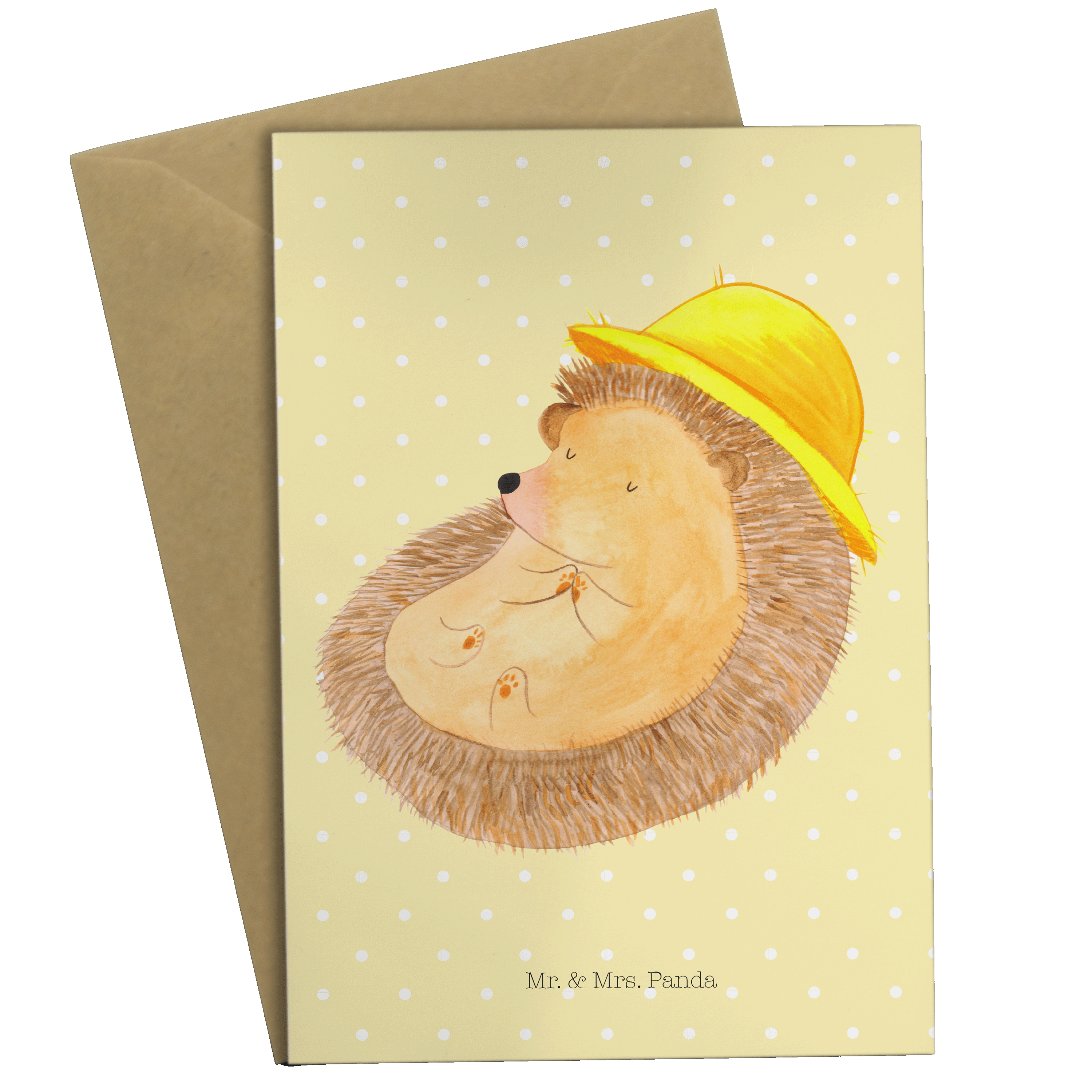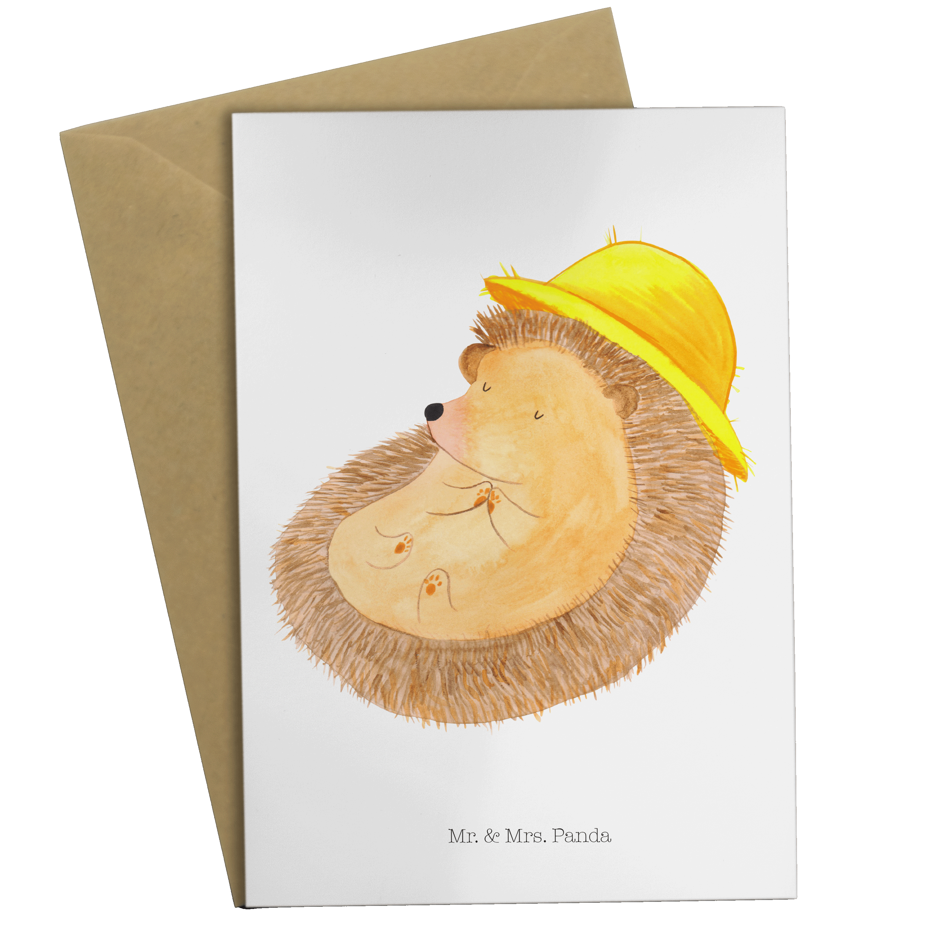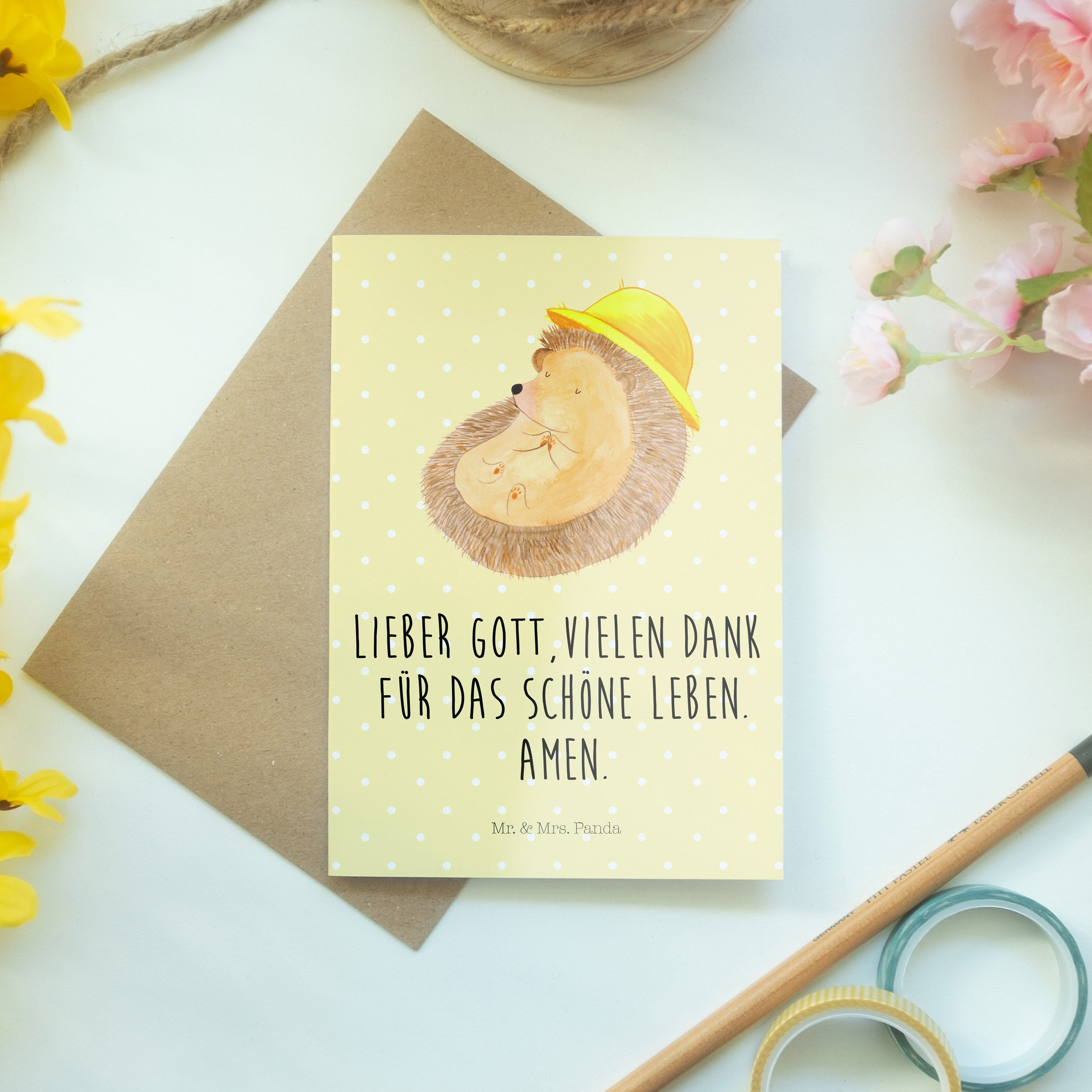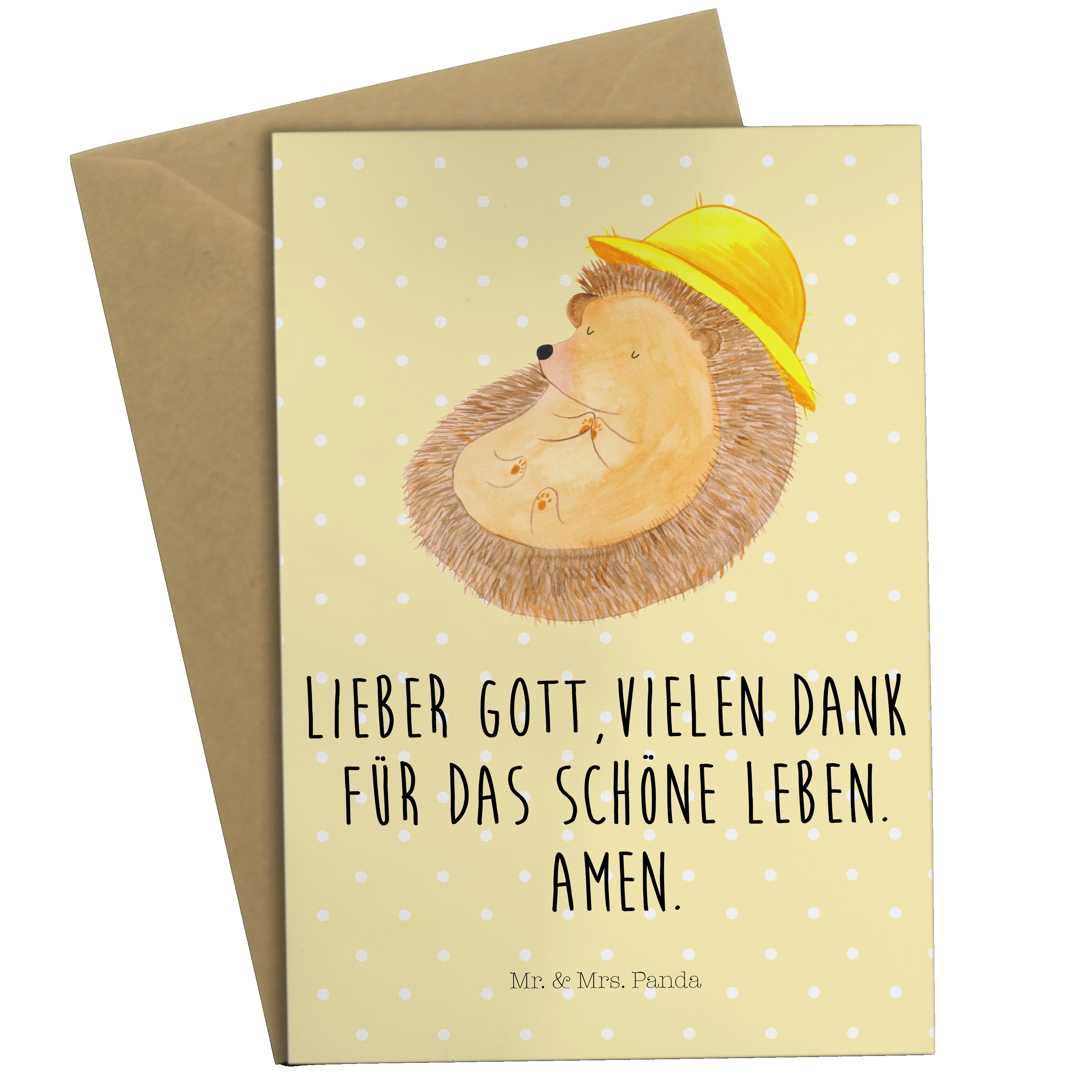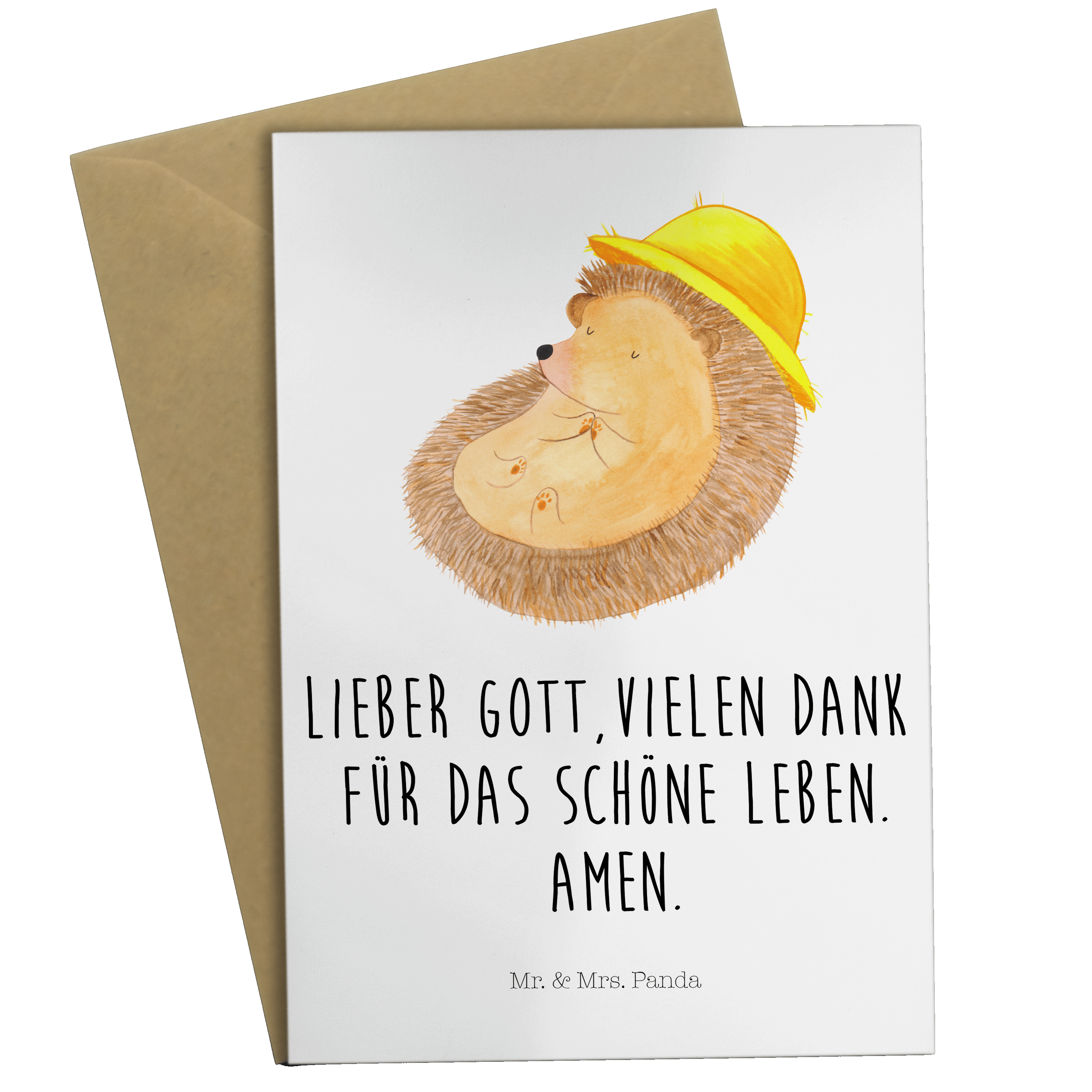 Grußkarte Igel betet Klappkarte, Einladungskarte, Glückwunschkarte, Hochzeitskarte, Geburtstagskarte, Karte, Tiermotive, Gute Laune, lustige Sprüche, Tiere, Igel, Igel mit Hut, Sonnenhut, Gott, Amen, beten, Leben, Dankbarkeit, Dankbar sein, dankbar, genießen