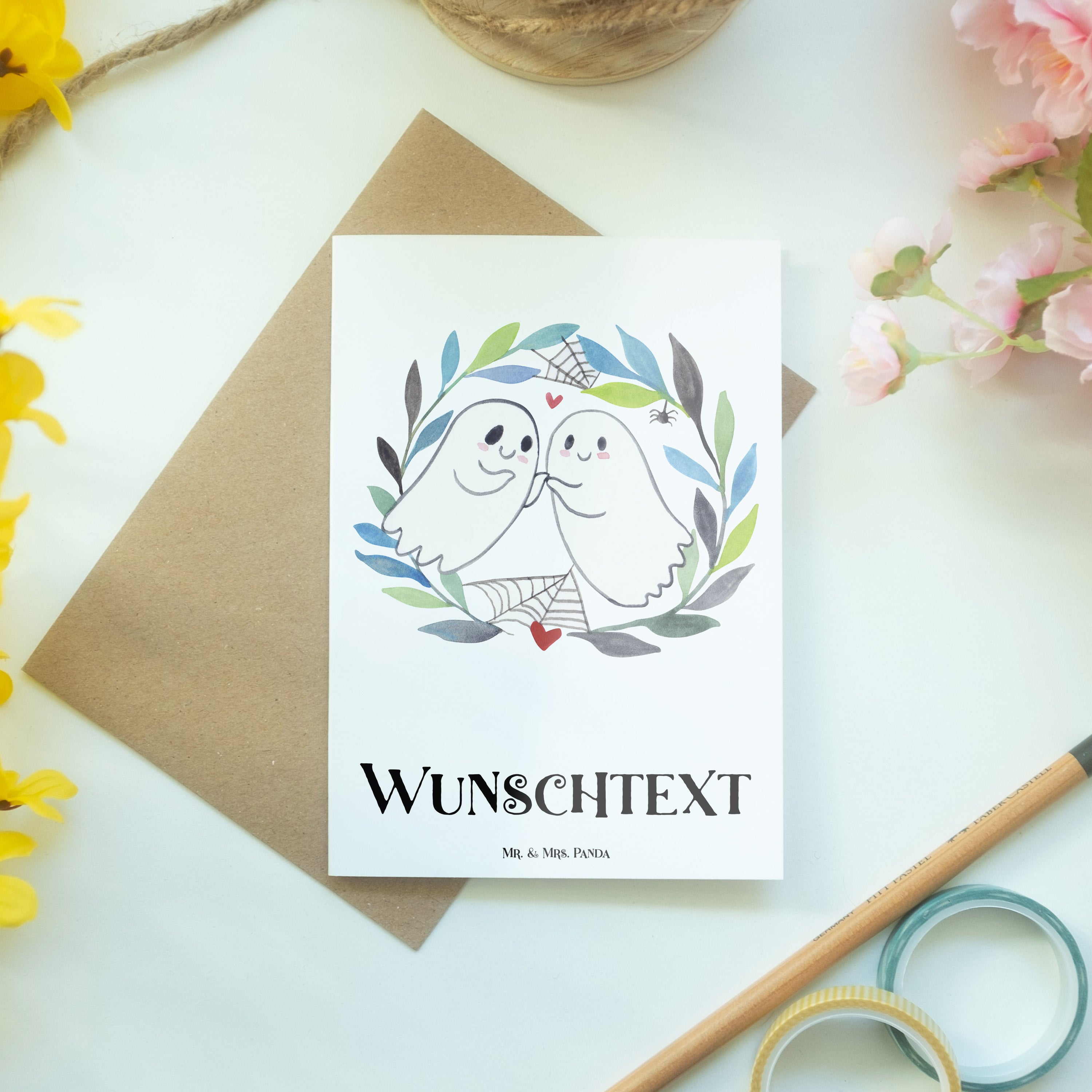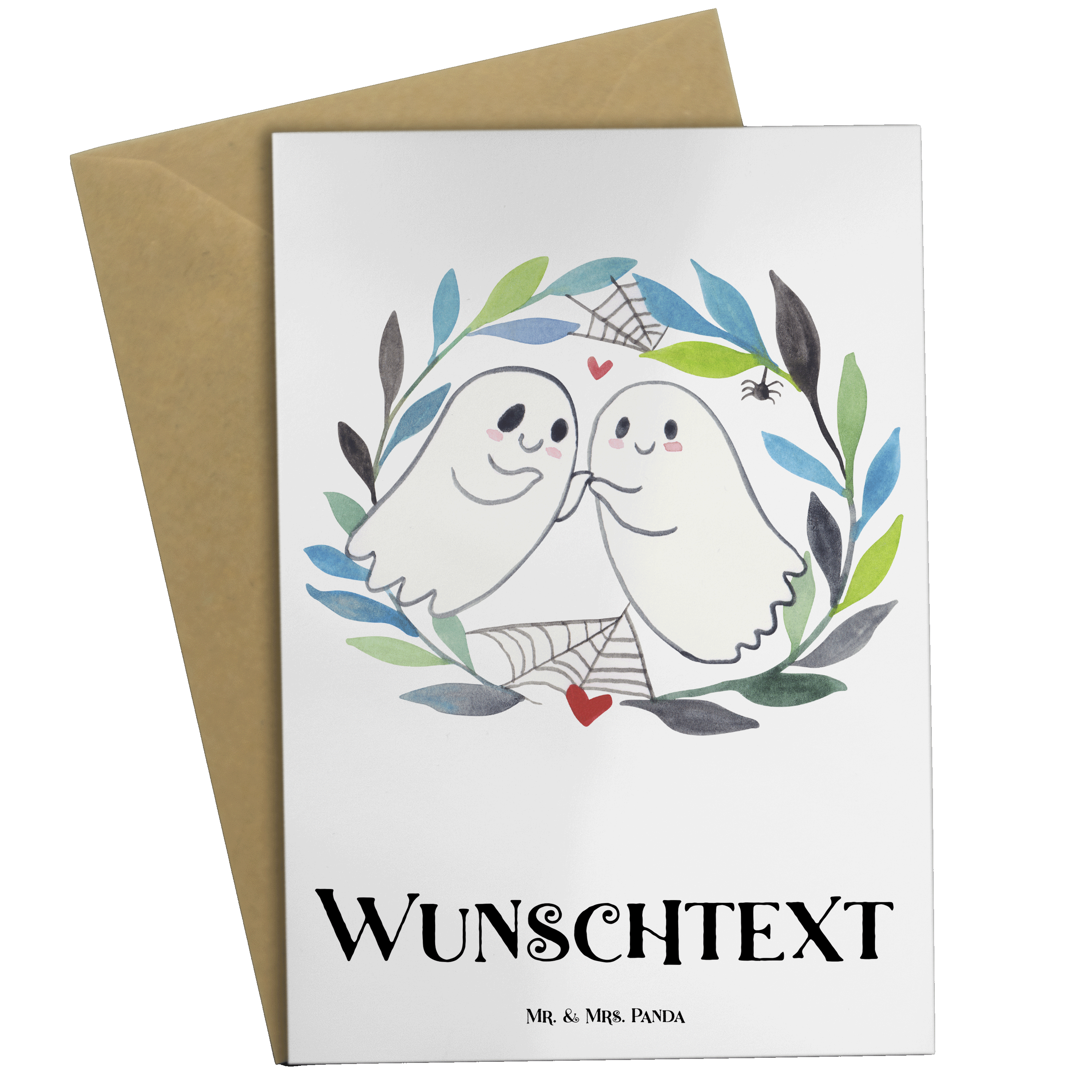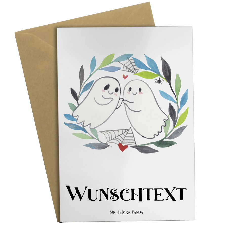 Tauche in eine Szene voller Romantik und Fantasie ein. Du siehst ein bezauberndes Gespensterpaar, händchenhaltend und verliebt in die Augen schauend. Lass dich verzaubern vom grünen und blauen Farbton der Blättergirlande, die das Paar umrahmt und den feinen Spinnweben, die ihre Liebe noch mysteriöser machen.
