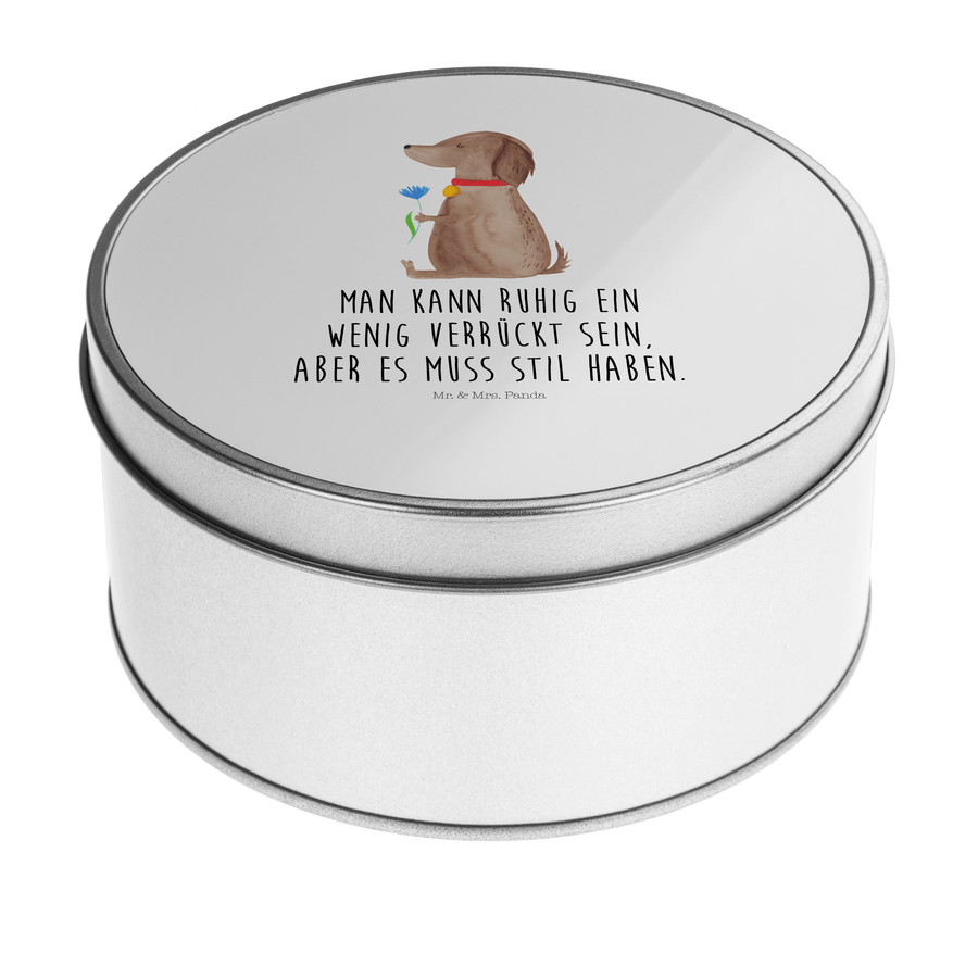 Blechdose rund Hund Blume - mit Spruch - Weiß