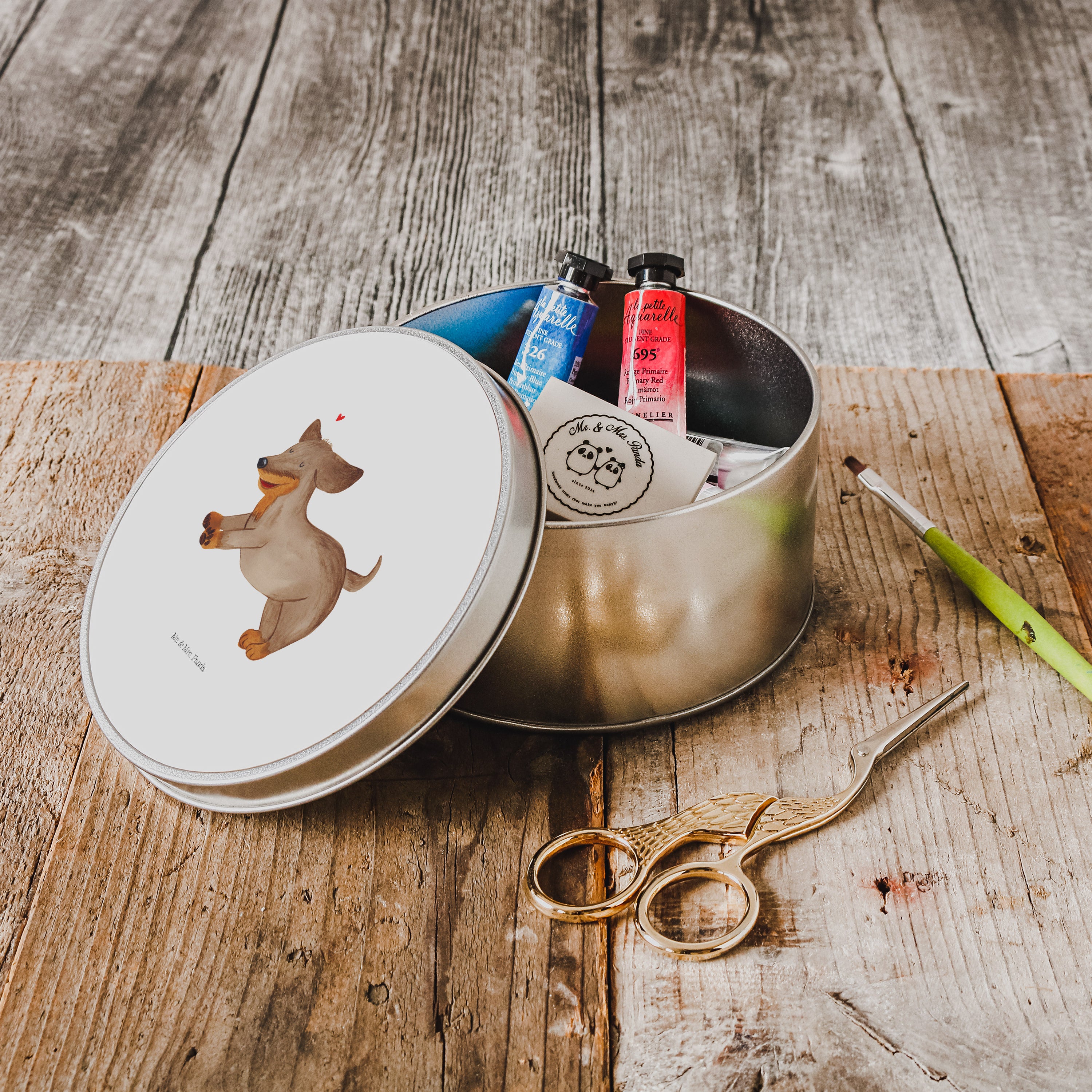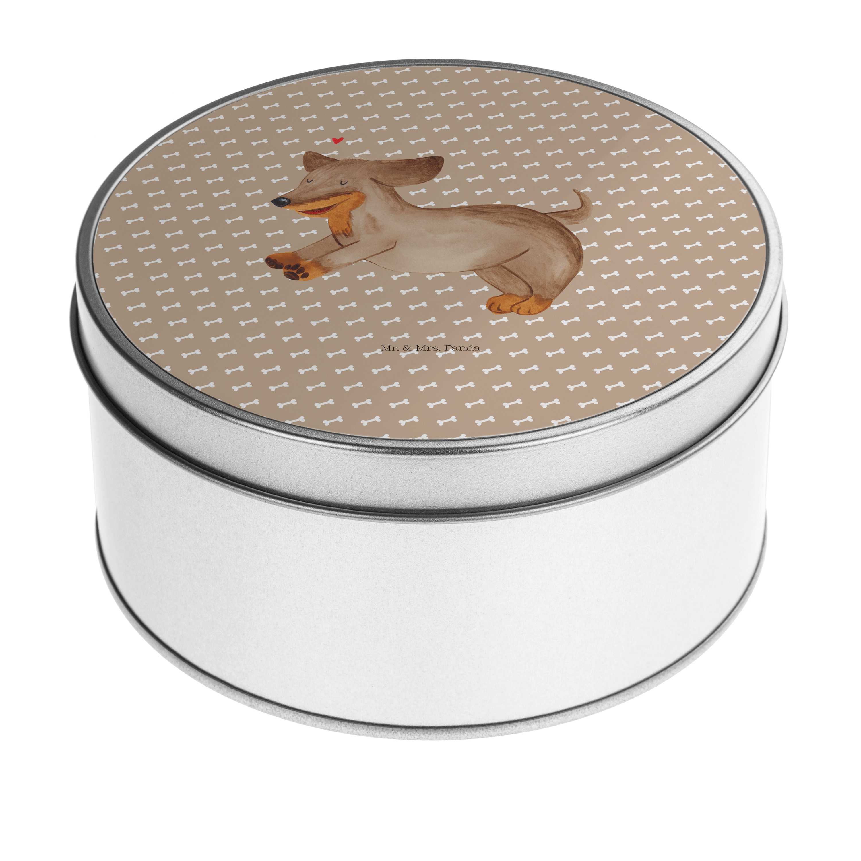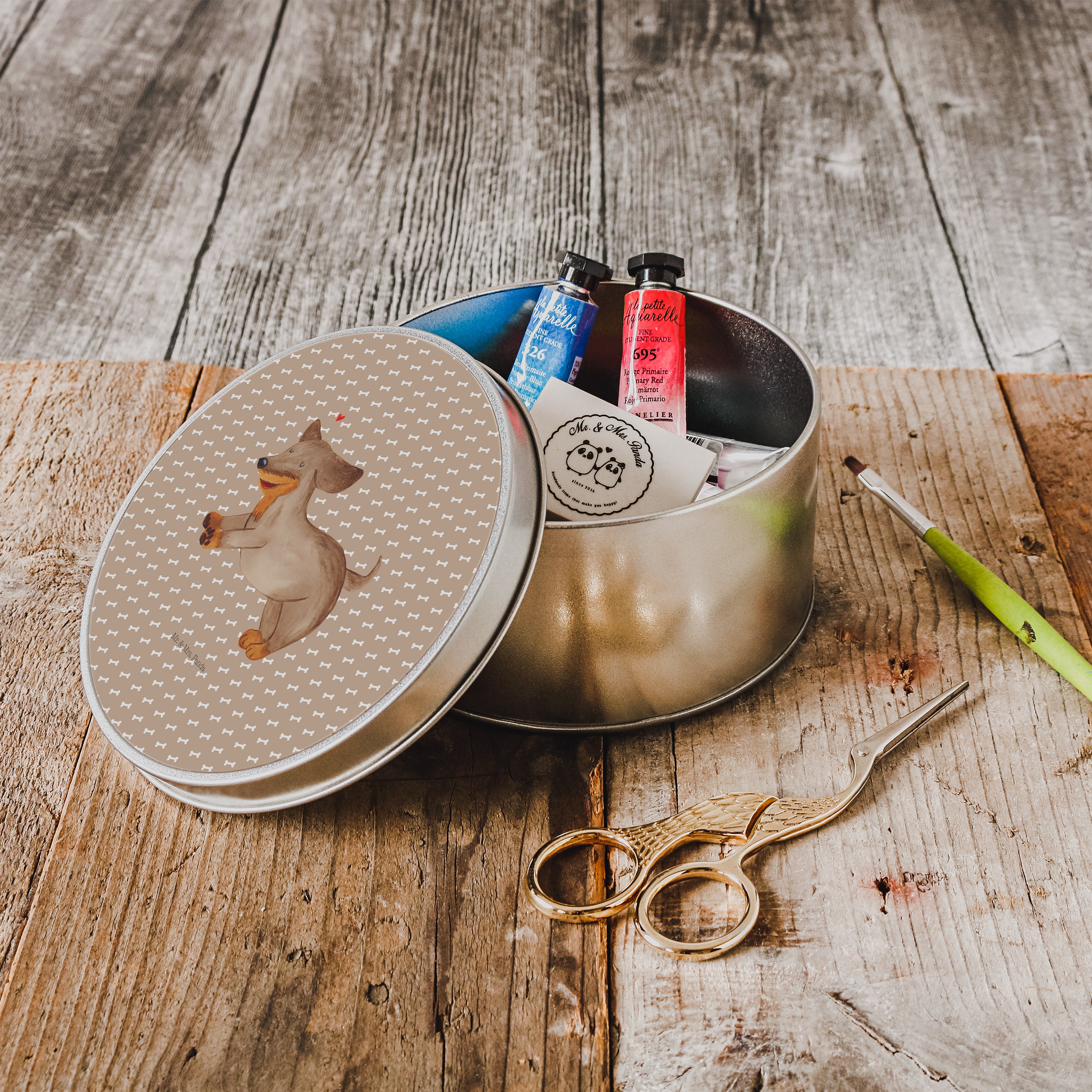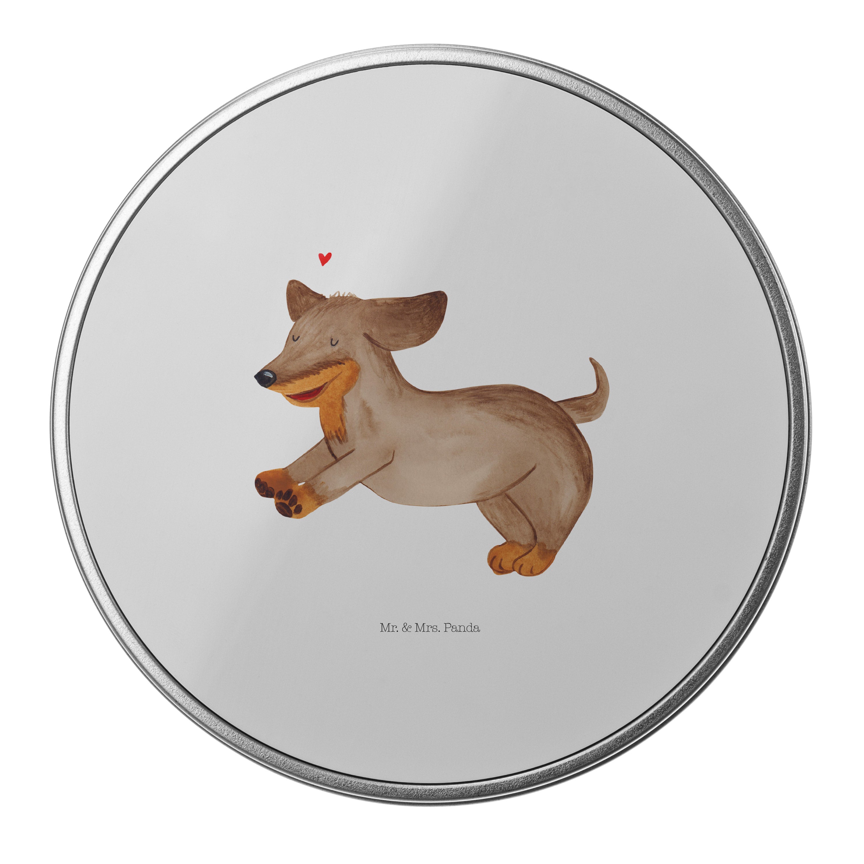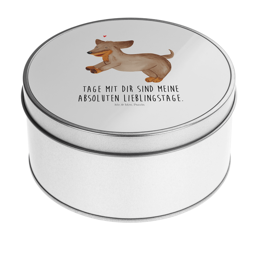 Blechdose rund Hund Dackel fröhlich - mit Spruch - Weiß