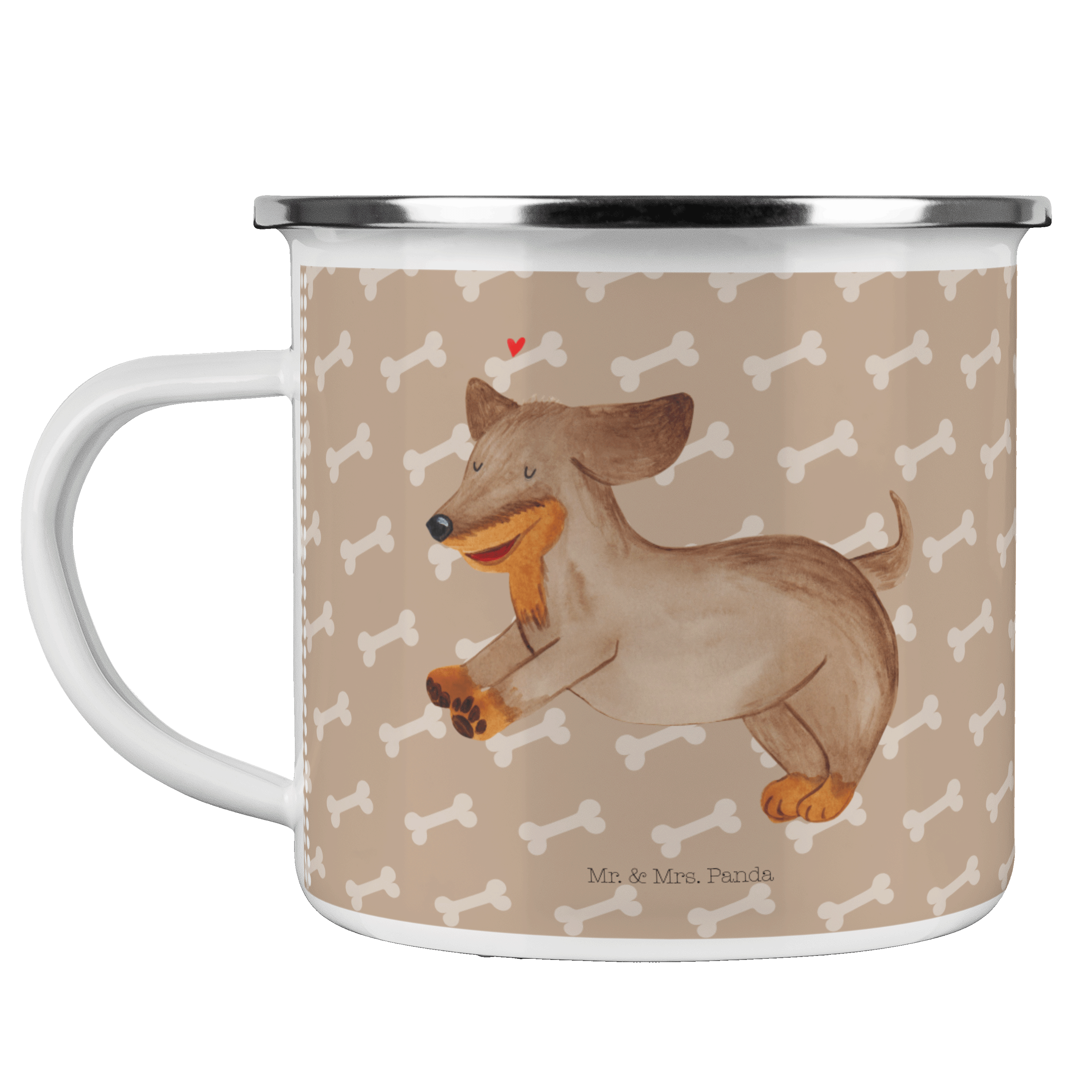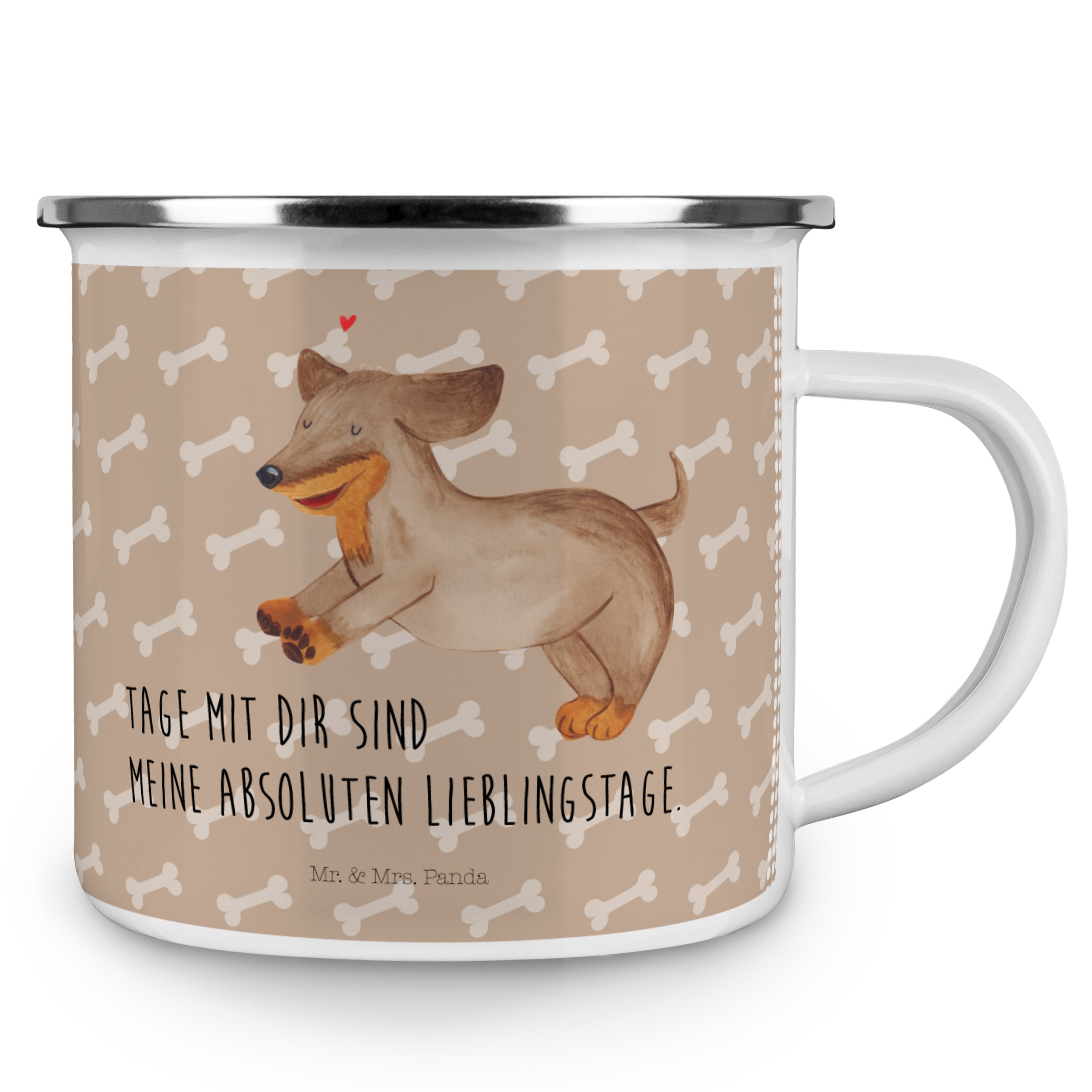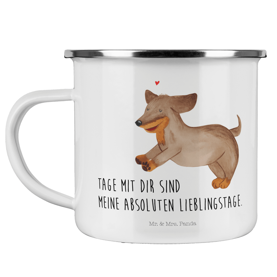 Camping Emaille Tasse Hund Dackel fröhlich - mit Spruch - Weiß