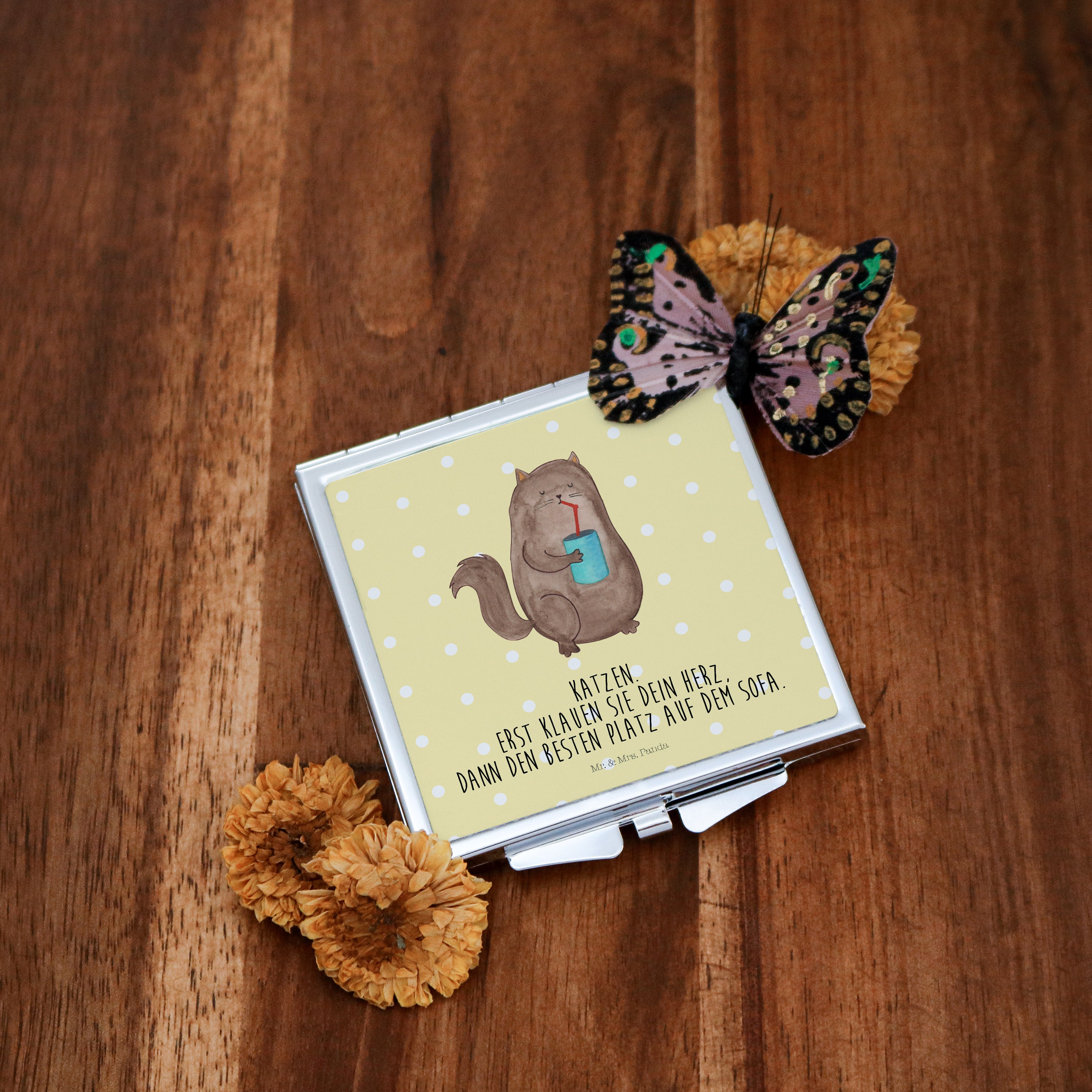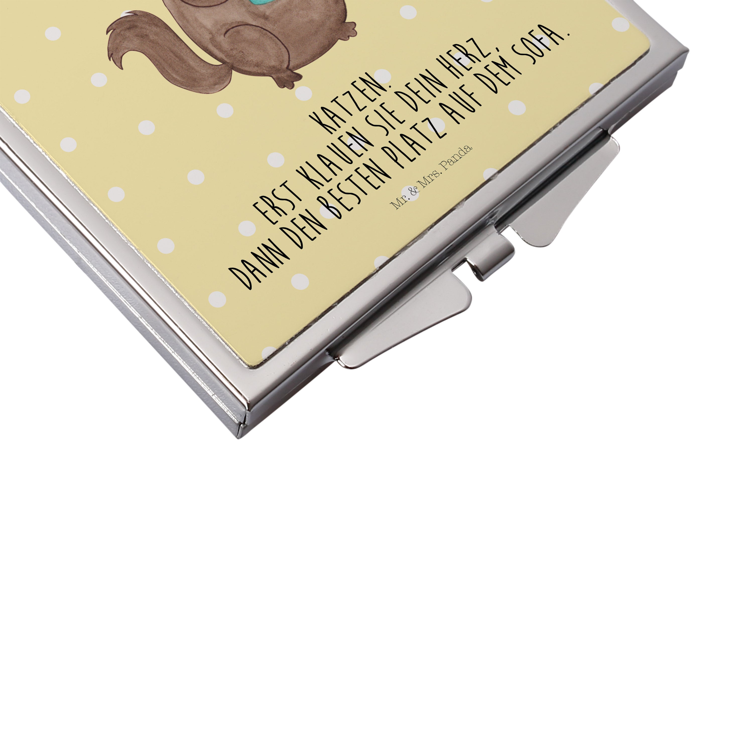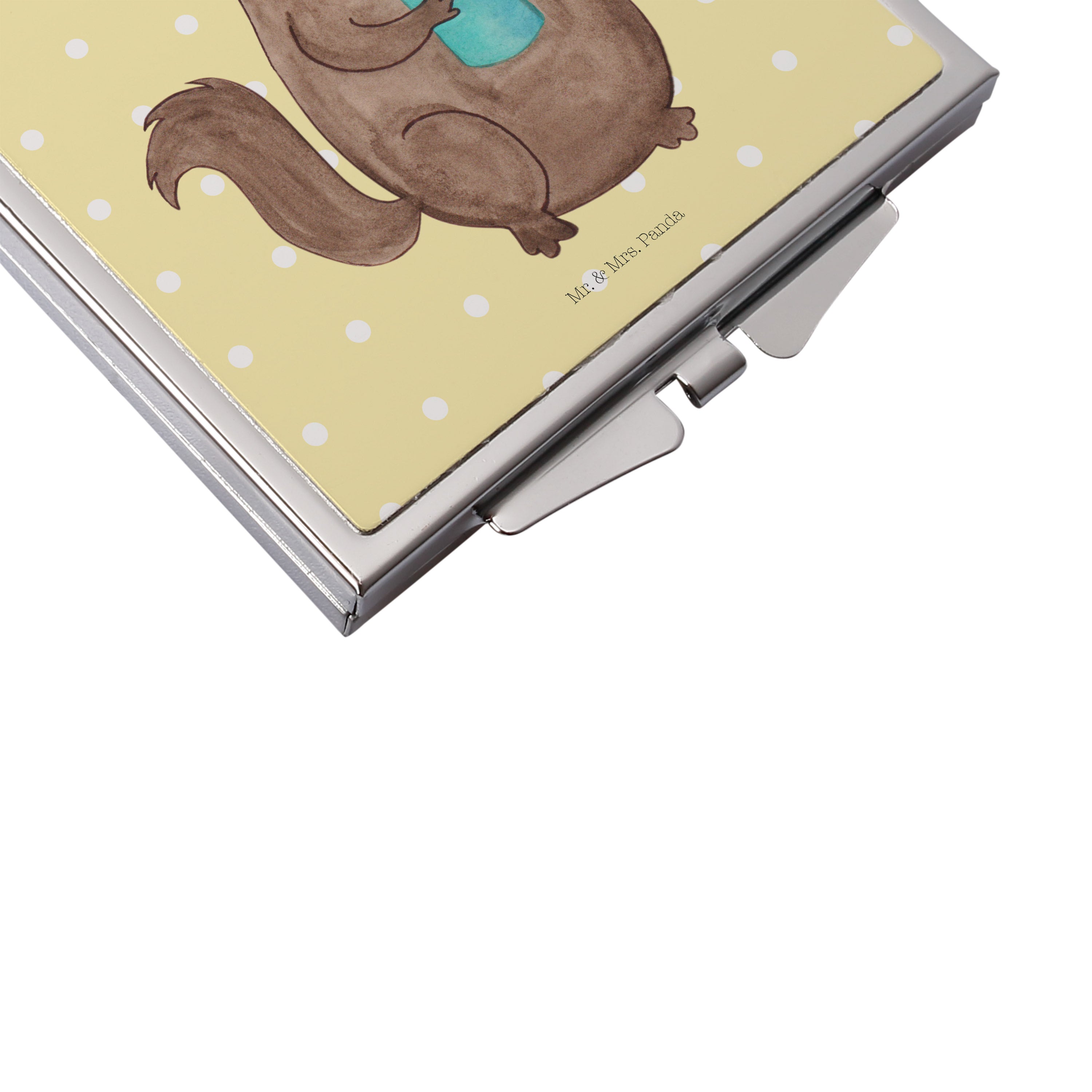 Dieser Spiegel von Mr. und Mrs. Panda im Handtaschenformat passt mit seinen Maßen von 60 x 60 mm in jede Frauentasche.