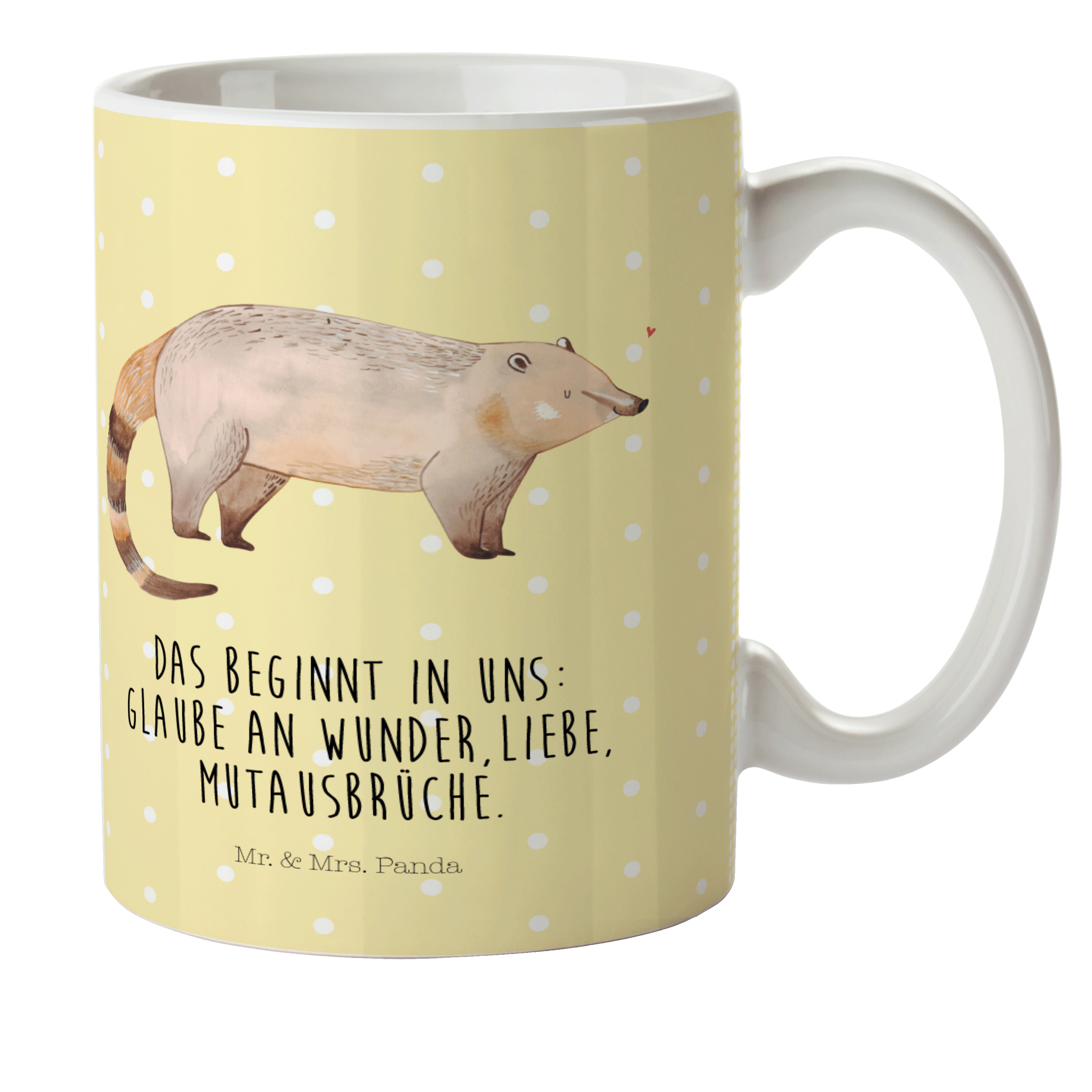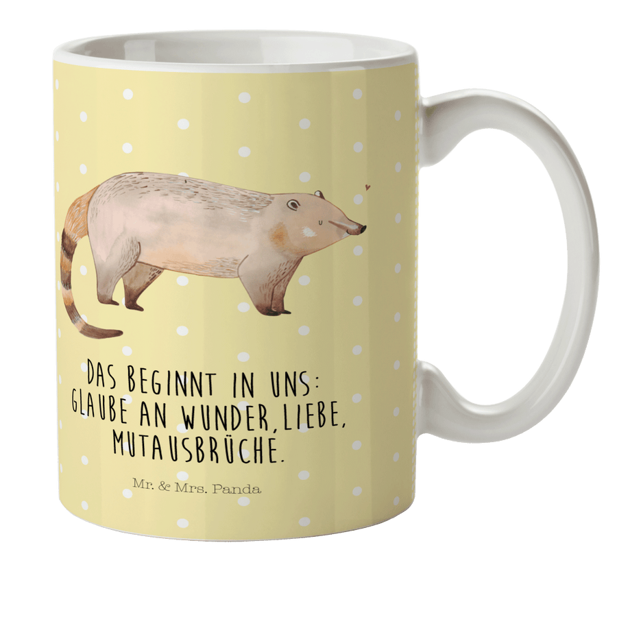 Kindertasse Nasenbär - mit Spruch - Gelb Pastell