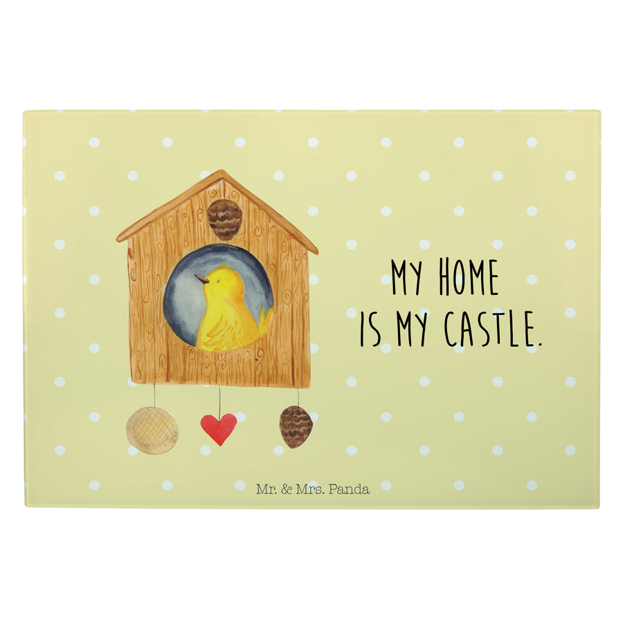 XL Glas Schneidbrett Vogelhaus - mit Spruch - Gelb Pastell
