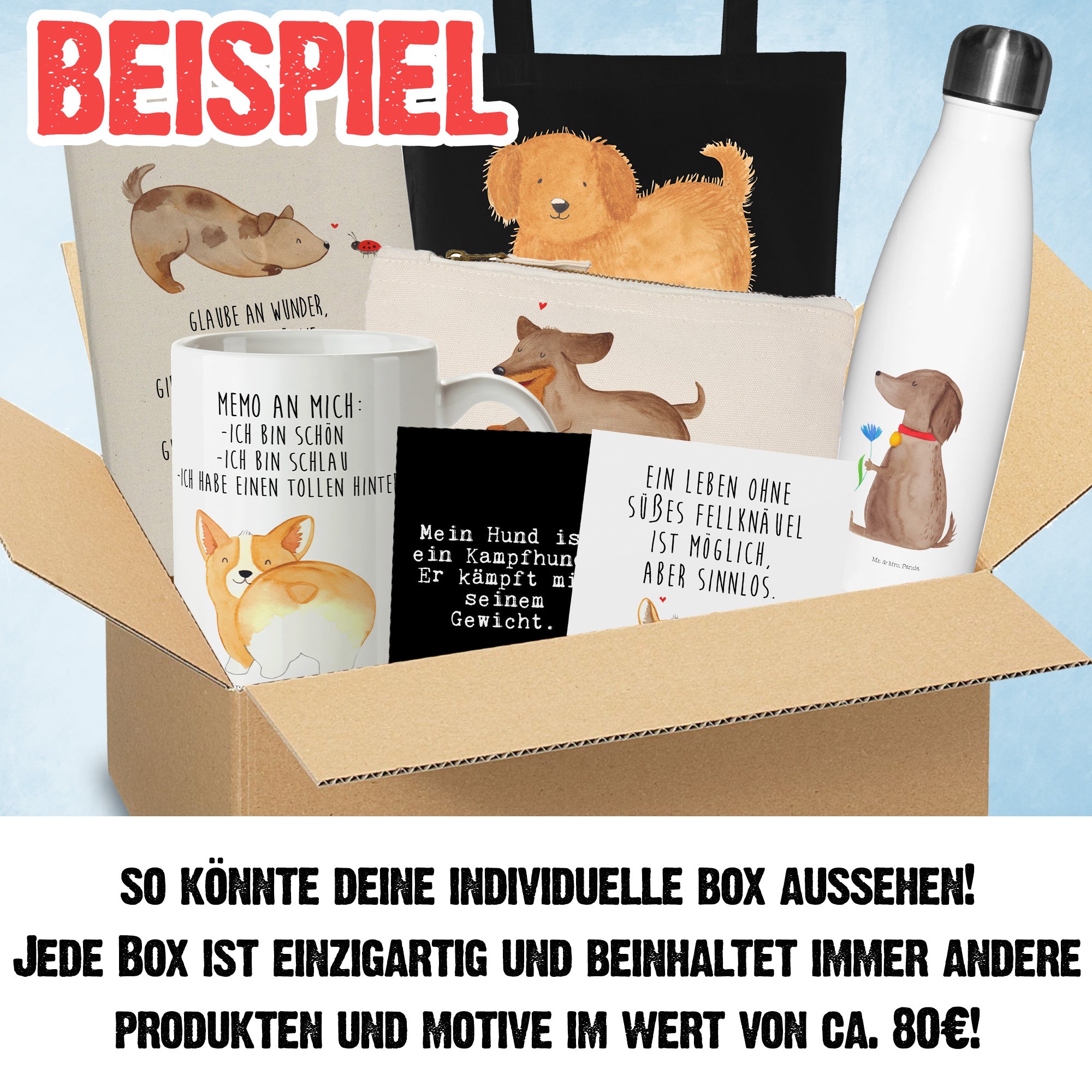 Eine Box voller schöner Hunde Motive, die ein jedes Hundebesitzer-Herz höher schlagen lassen. Ein lieber Corgie, ein wilder Basset Hound, ein treuer Dackel,ein kuscheliger Mops und viele weitere Hunde Motive werden dich in der Hunde Mystery Box überraschen.