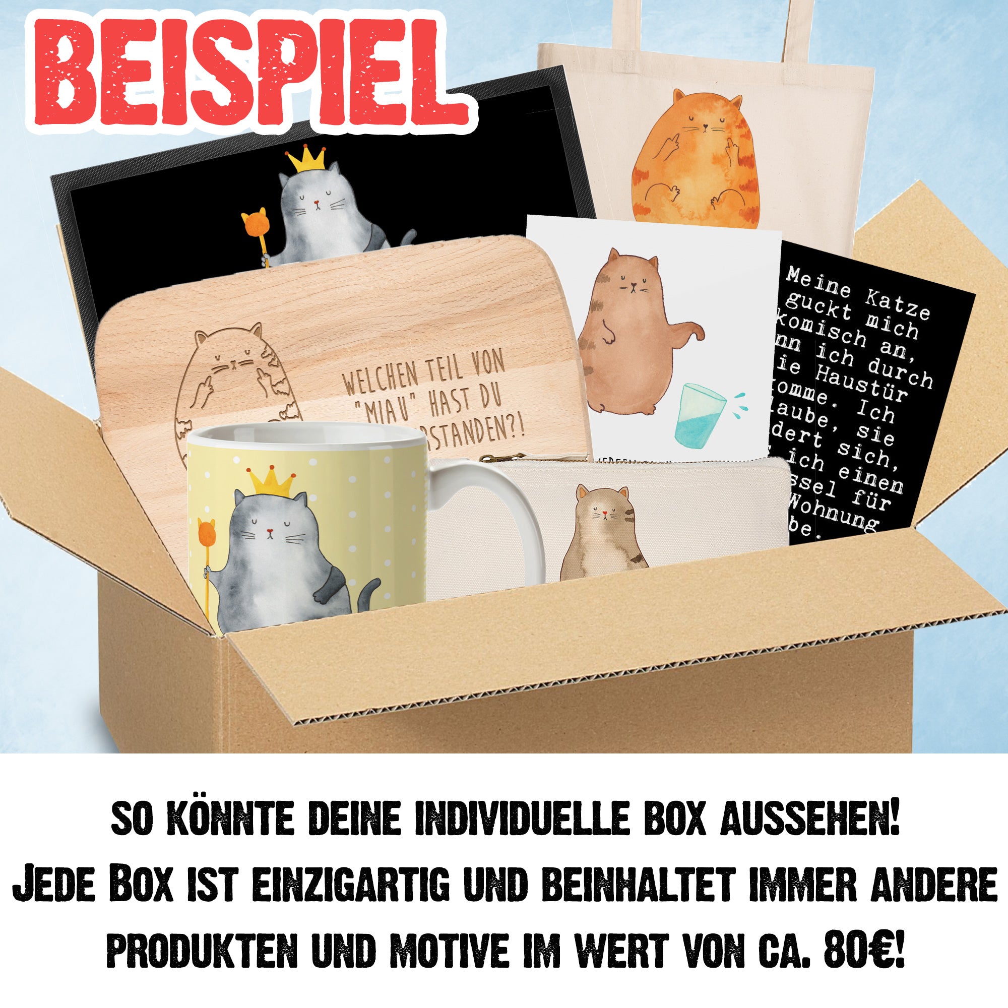 In unserer Katzen Mystery Box findest du die schönsten Katzen Motive, die den eigensinnigen und liebenswerten Charakter von Katzen widerspiegeln und Katzenliebhaber Herzen höher schlagen lassen. Lustige Sprüche, die mitten ins Herz treffen und für ein glückliche Momente sorgen machen das Paket perfekt.