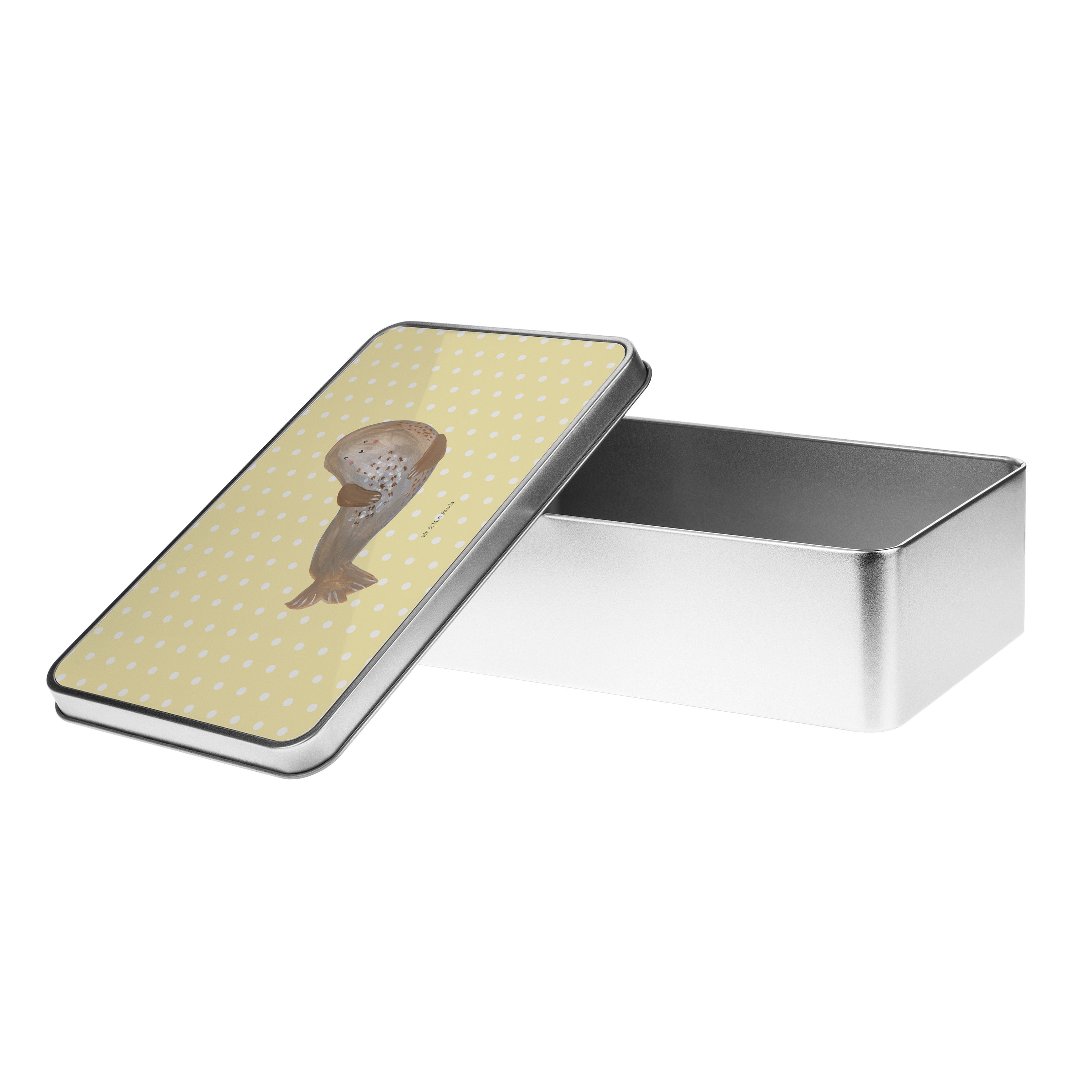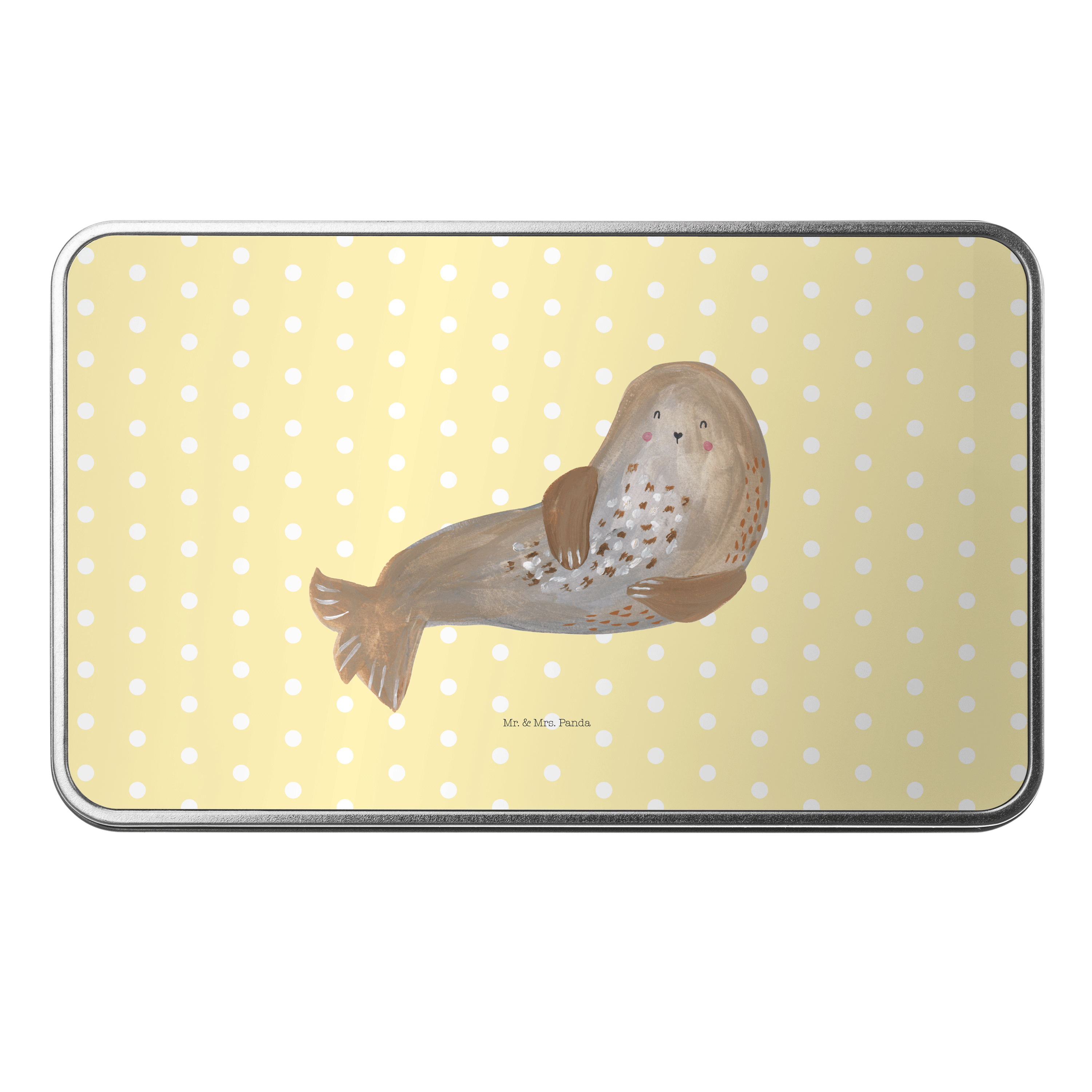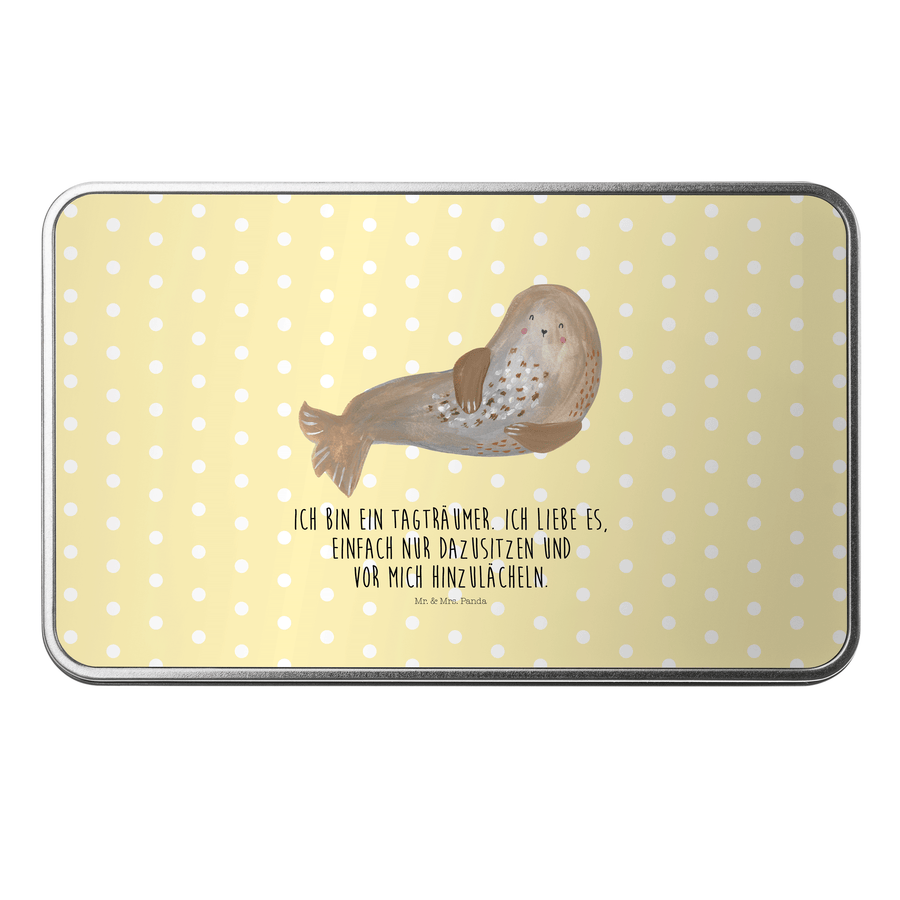 Metalldose rechteckig Robbe lachend - mit Spruch - Gelb Pastell
