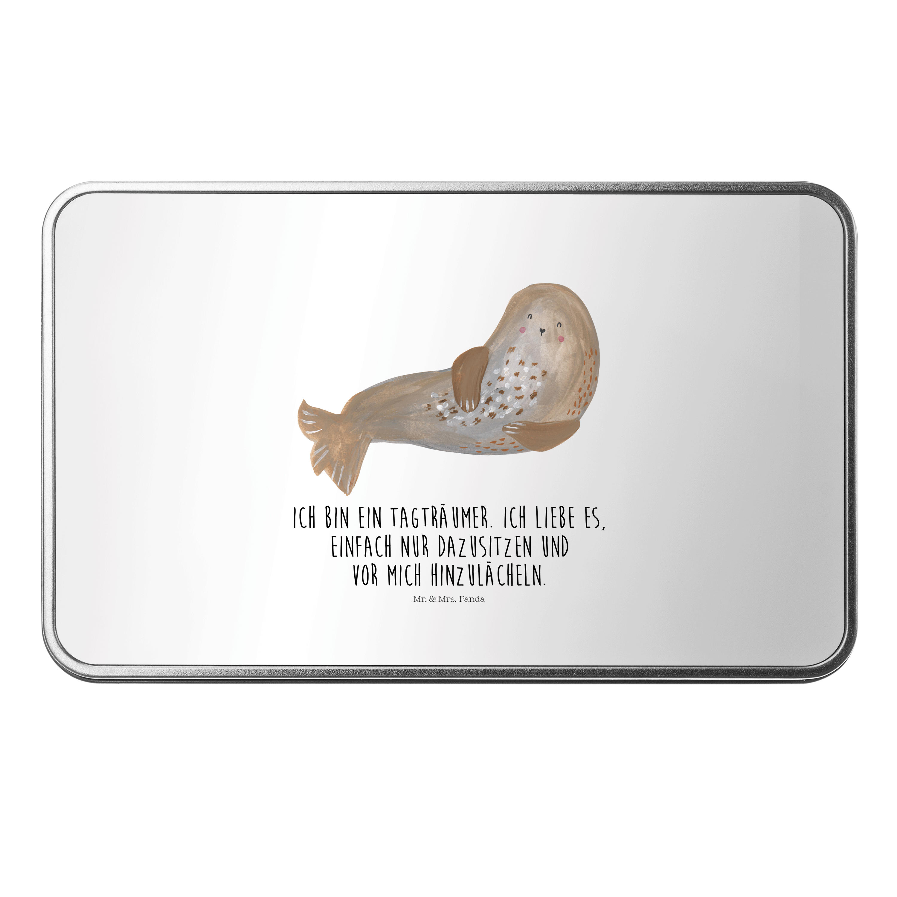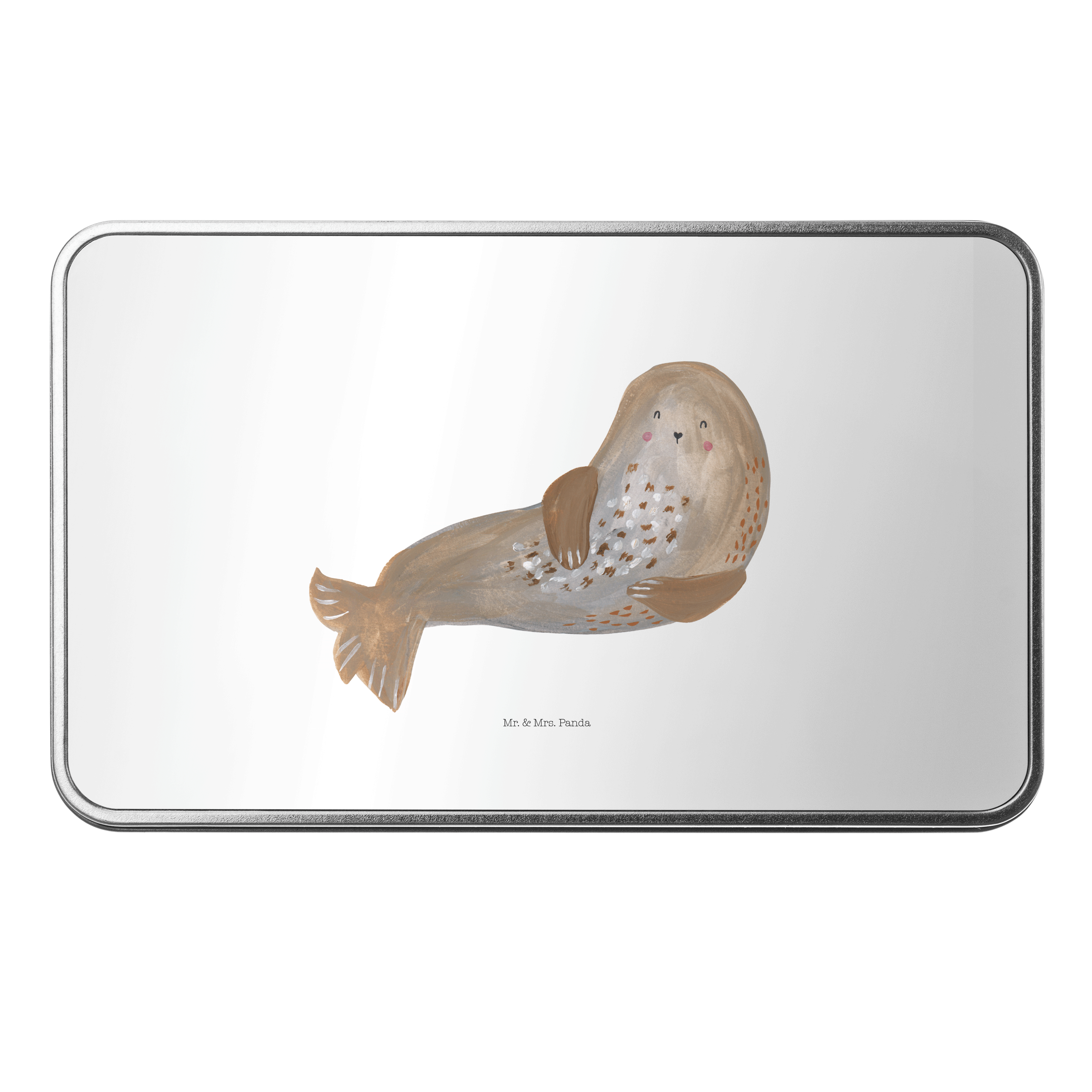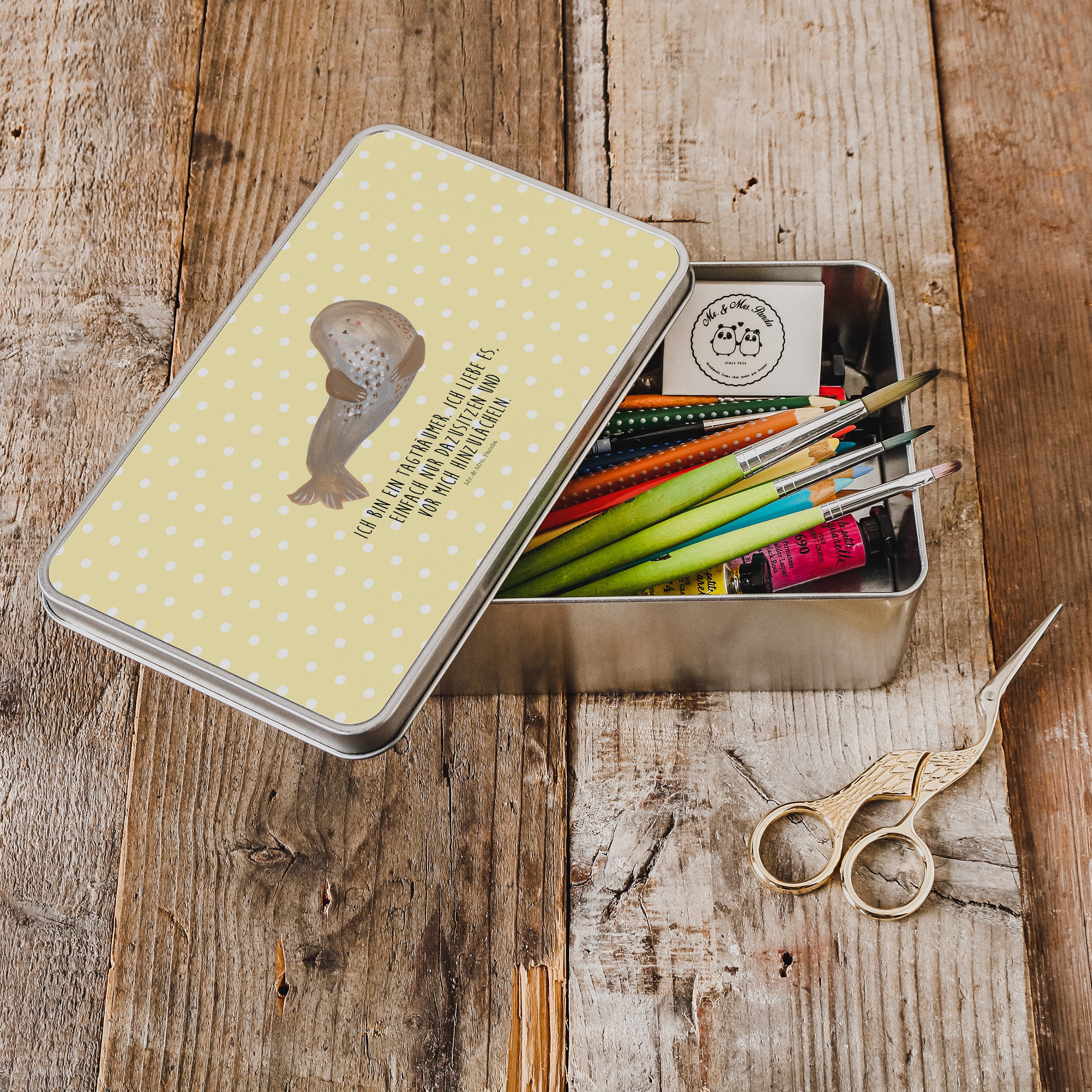 Metalldose rechteckig Robbe lachend - mit Spruch - Gelb Pastell