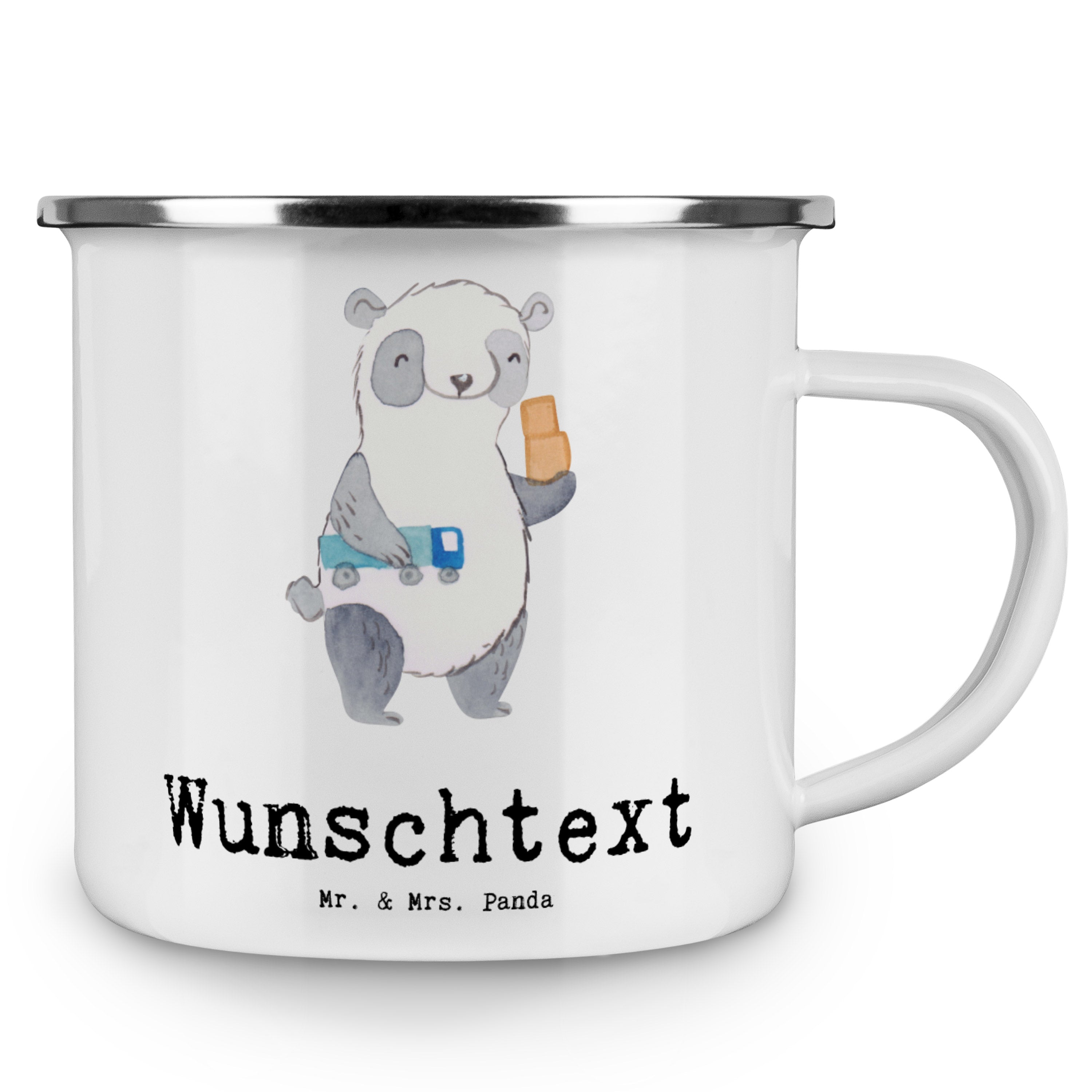 Diese wunderschöne personalisierte Emailletasse von Mr. & Mrs. Panda mit abgesetztem Edelstahl Rand in Emaille Optik ist der perfekte, bruchsichere Begleiter für dein nächstes Abenteuer. Sie wird von uns liebevoll mit deinem Namen oder Wunschnamen bedruckt. Das Füllvolumen des Bechers beträgt 300 ml. So sind die Motivtassen ideal beim Camping als Campingbecher einsetzbar.