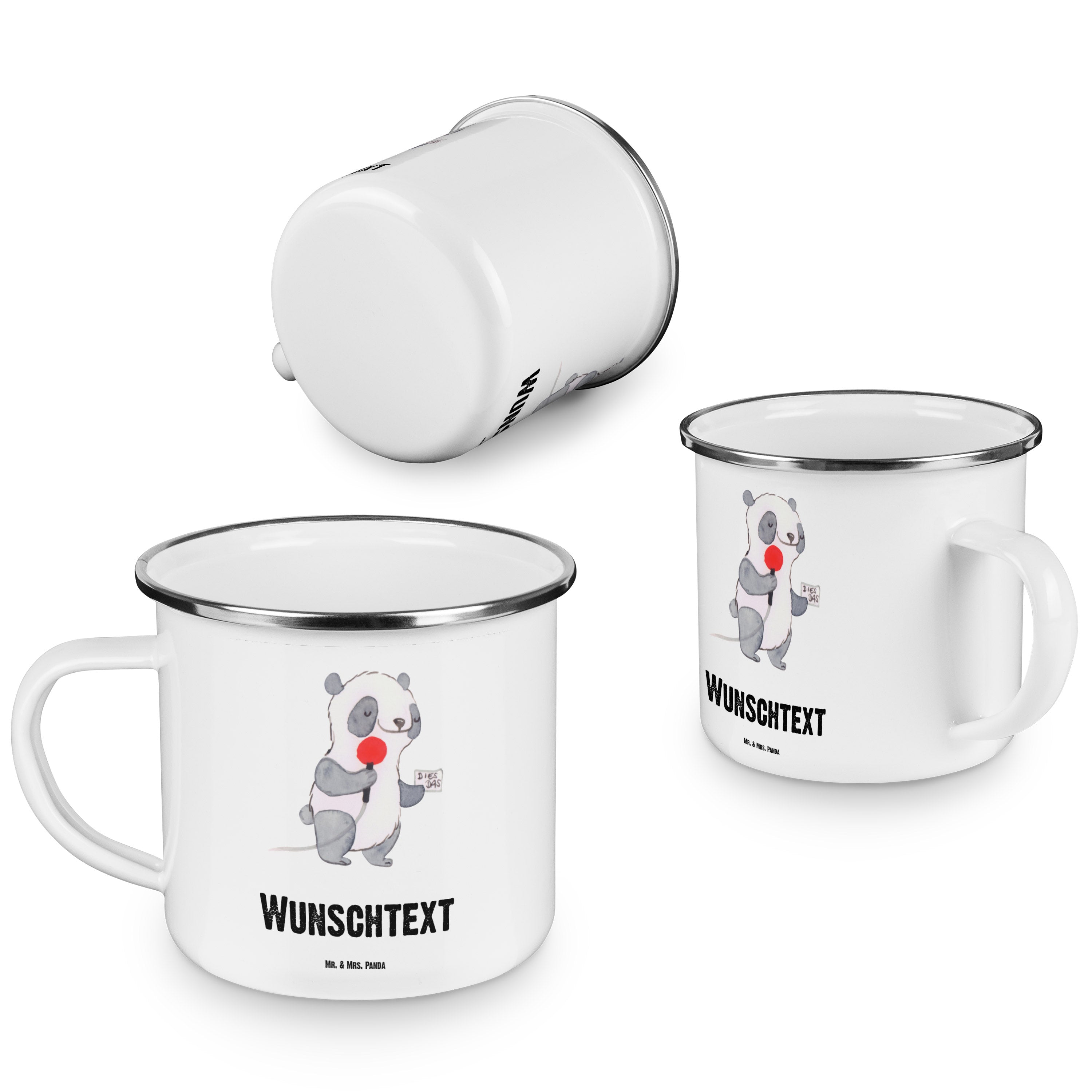 Diese wunderschöne personalisierte Emailletasse von Mr. & Mrs. Panda mit abgesetztem Edelstahl Rand in Emaille Optik ist der perfekte, bruchsichere Begleiter für dein nächstes Abenteuer. Sie wird von uns liebevoll mit deinem Namen oder Wunschnamen bedruckt. Das Füllvolumen des Bechers beträgt 300 ml. So sind die Motivtassen ideal beim Camping als Campingbecher einsetzbar.