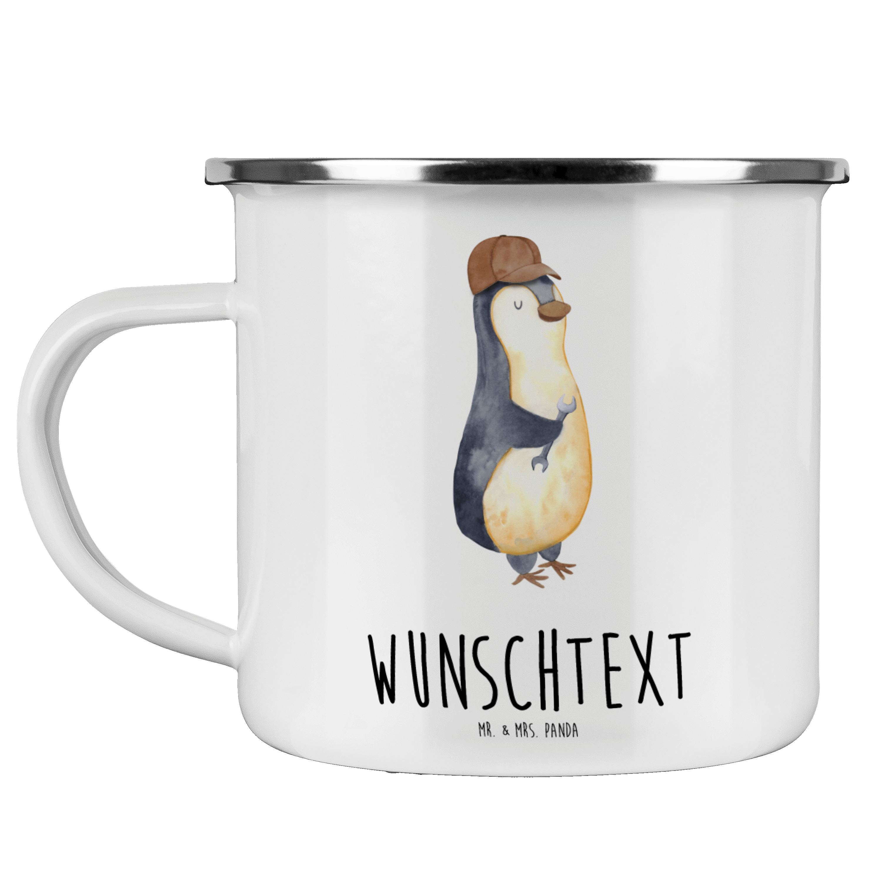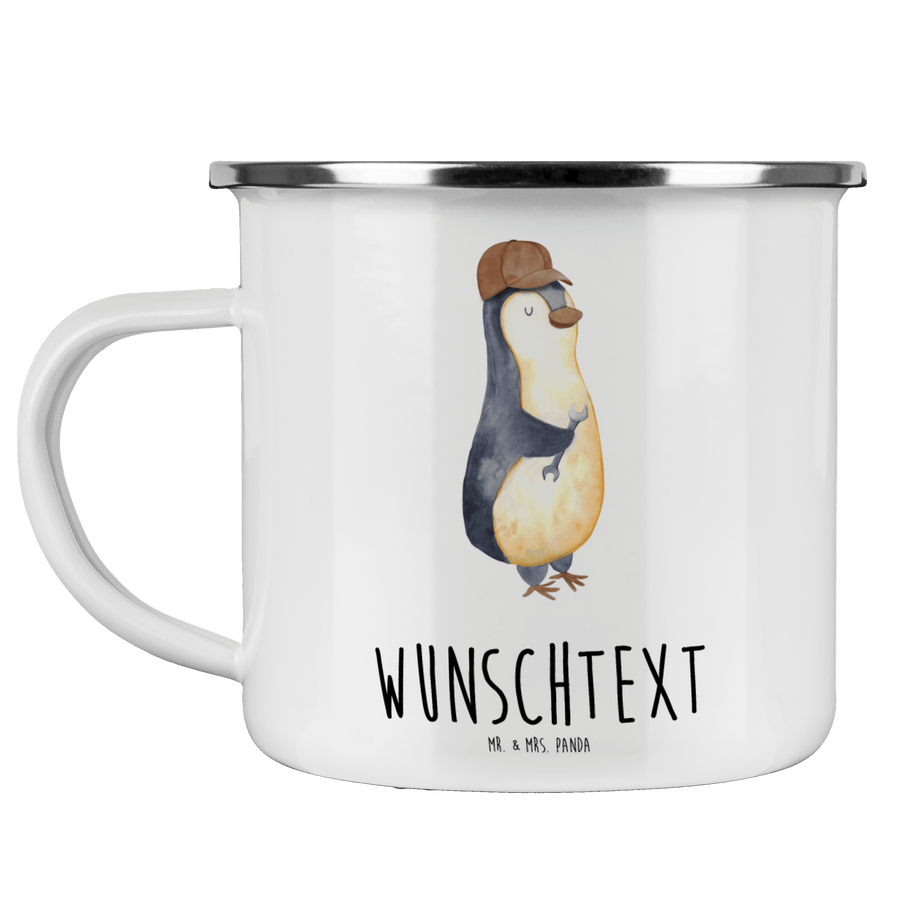 Diese wunderschöne personalisierte Emailletasse von Mr. & Mrs. Panda mit abgesetztem Edelstahl Rand in Emaille Optik ist der perfekte, bruchsichere Begleiter für dein nächstes Abenteuer. Sie wird von uns liebevoll mit deinem Namen oder Wunschnamen bedruckt. Das Füllvolumen des Bechers beträgt 300 ml. So sind die Motivtassen ideal beim Camping als Campingbecher einsetzbar.