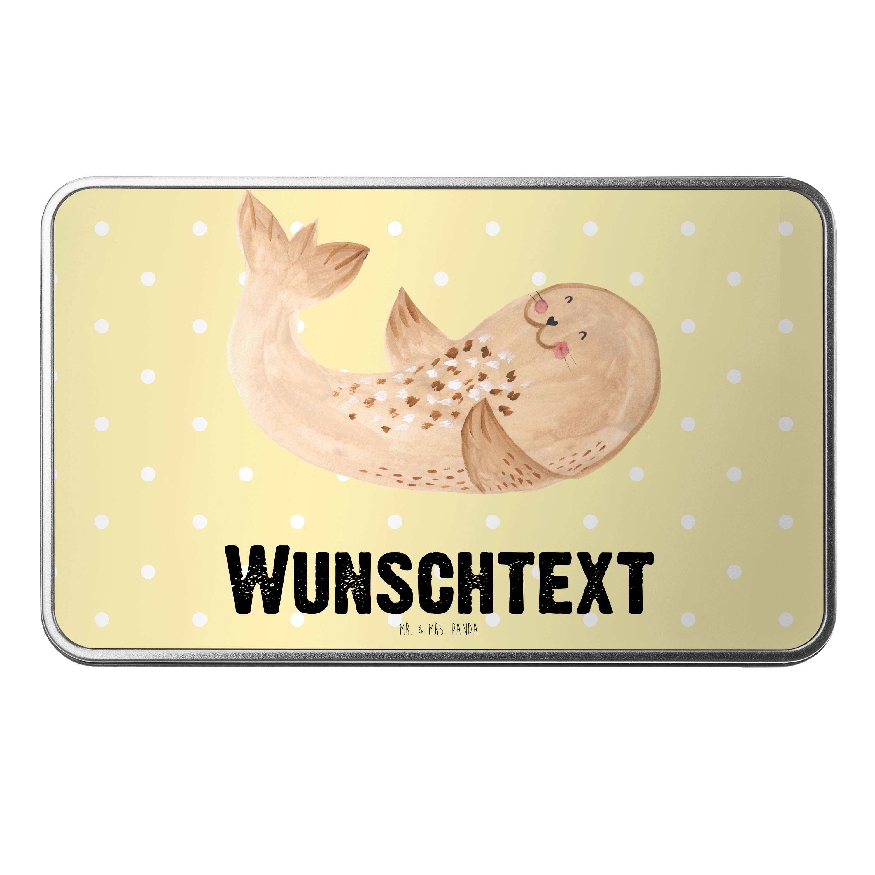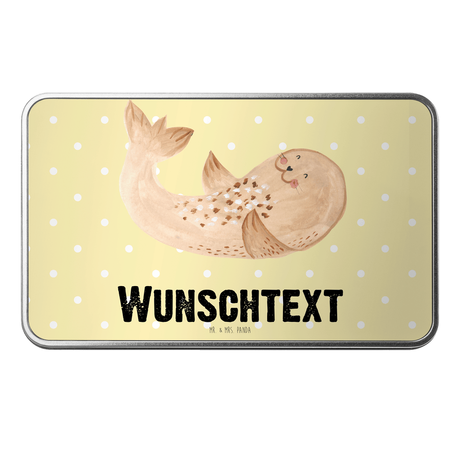 Personalisierte Metalldose Robbe liegend Personalisierte Metalldose, Dose mit Namen, Namensdose, Kiste mit Namen, Namenskiste, süße Tiermotive, gute Laune, lustige Sprüche, Tiere, Robbe, Robben, Seehund, Strand, Meerestier, Ostsee, Nordsee, Lachen, Freude