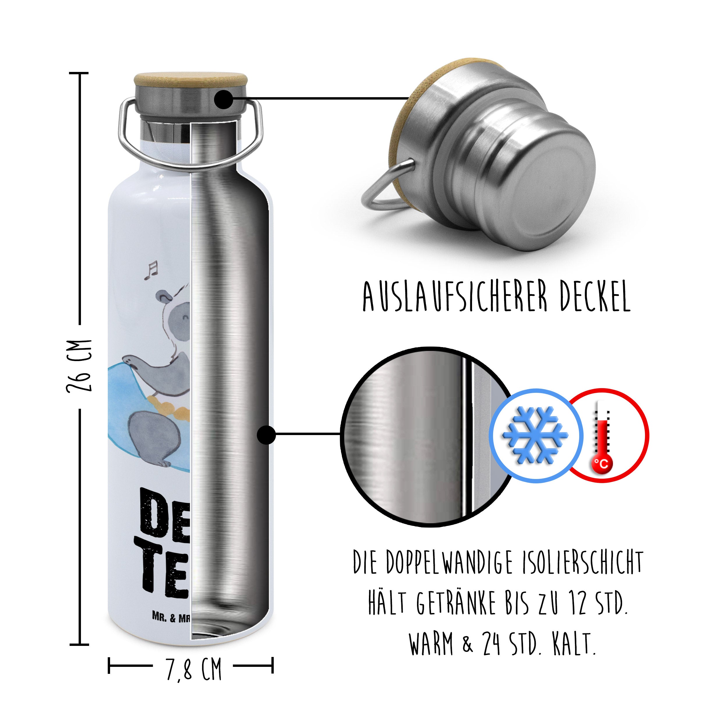 Dank modernstem Thermo-Transfer-Druck bleiben die Farben auf deiner Flasche dauerhaft brillant erhalten. Dank der Edelstahl Flasche sind deine Getränke garantiert frei von BPA und anderen Giftstoffen.