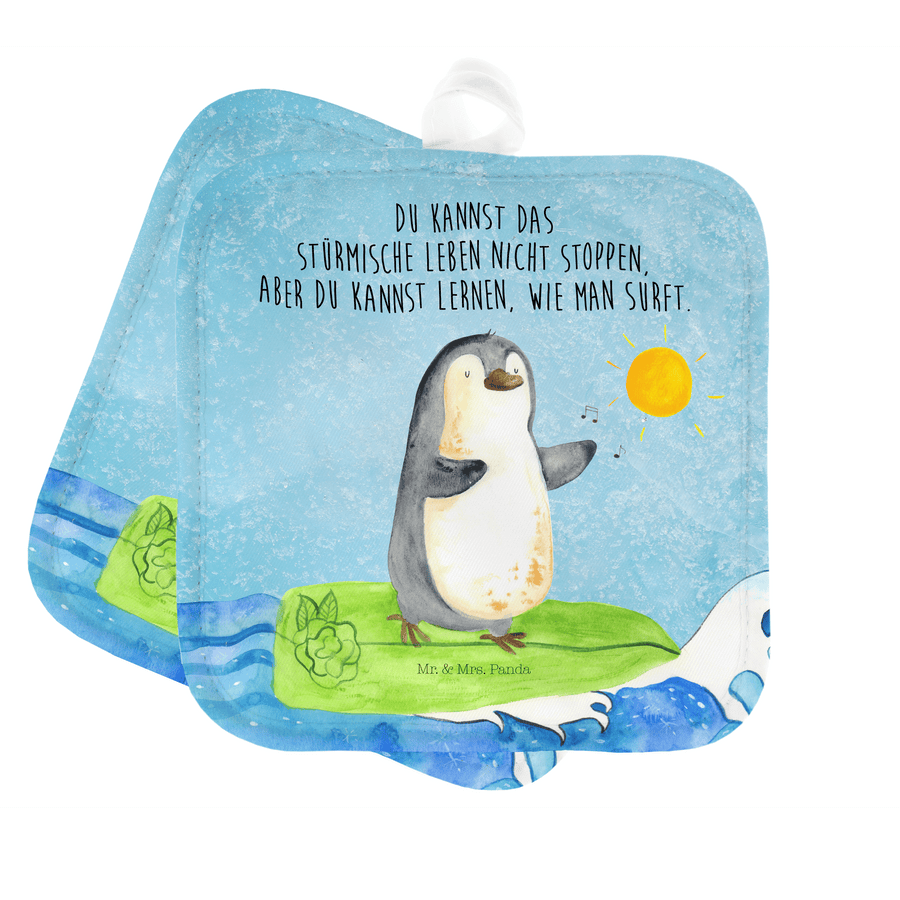 2er Set Topflappen Pinguin Surfer - mit Spruch - Eisblau