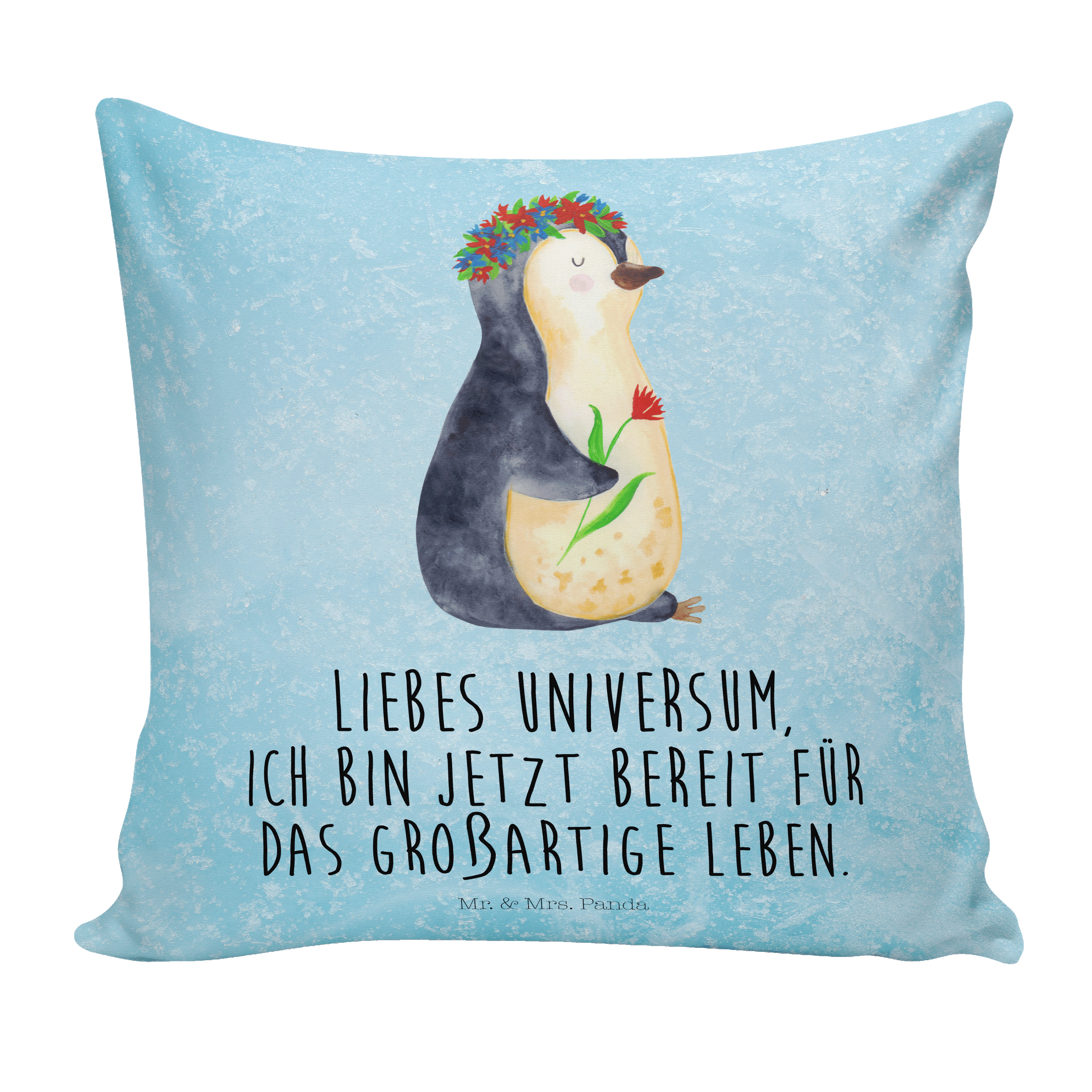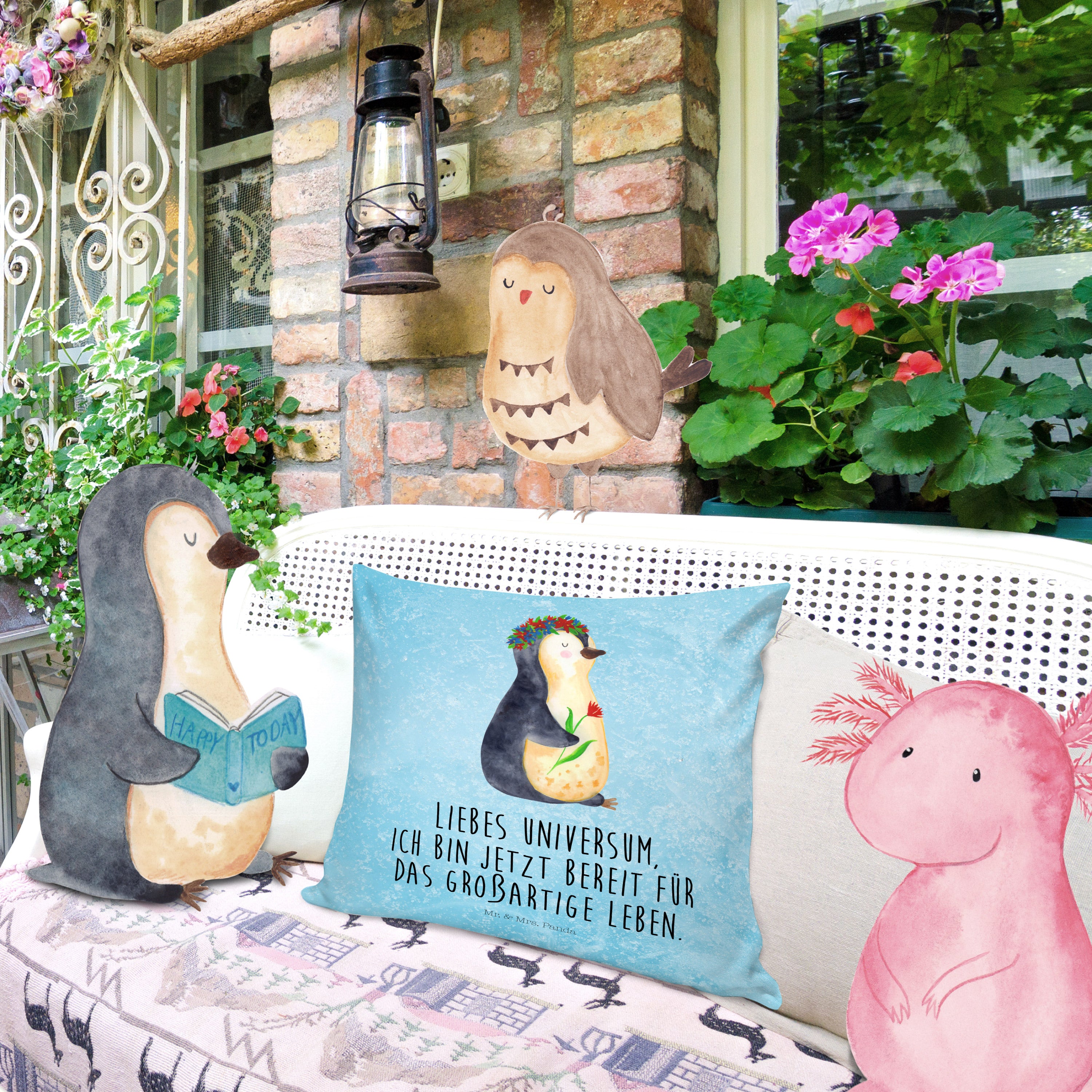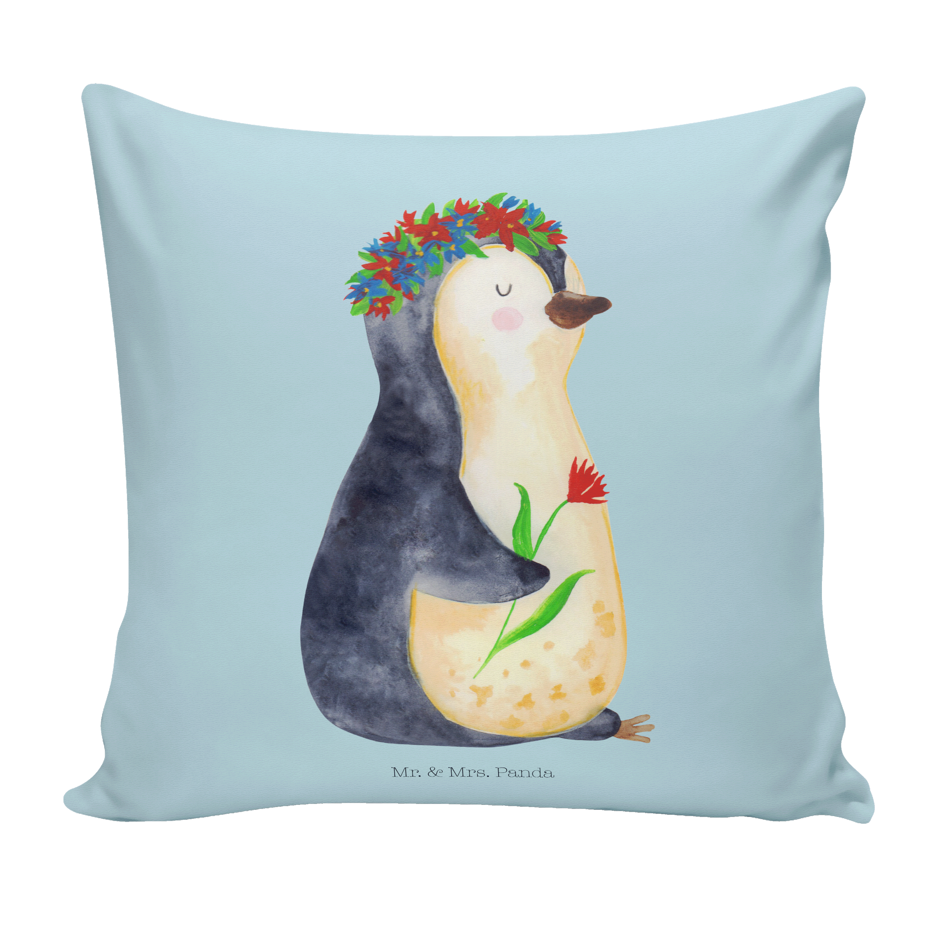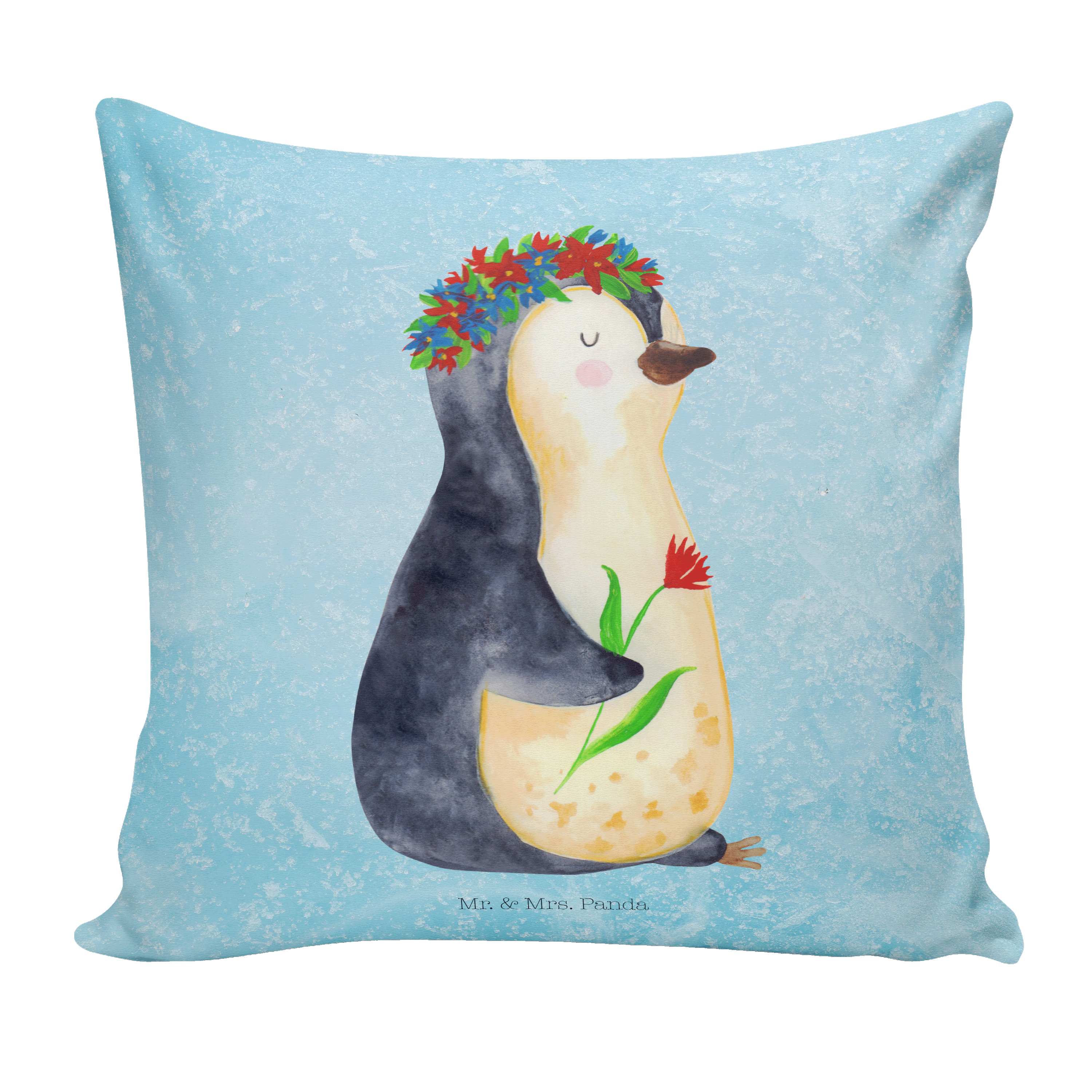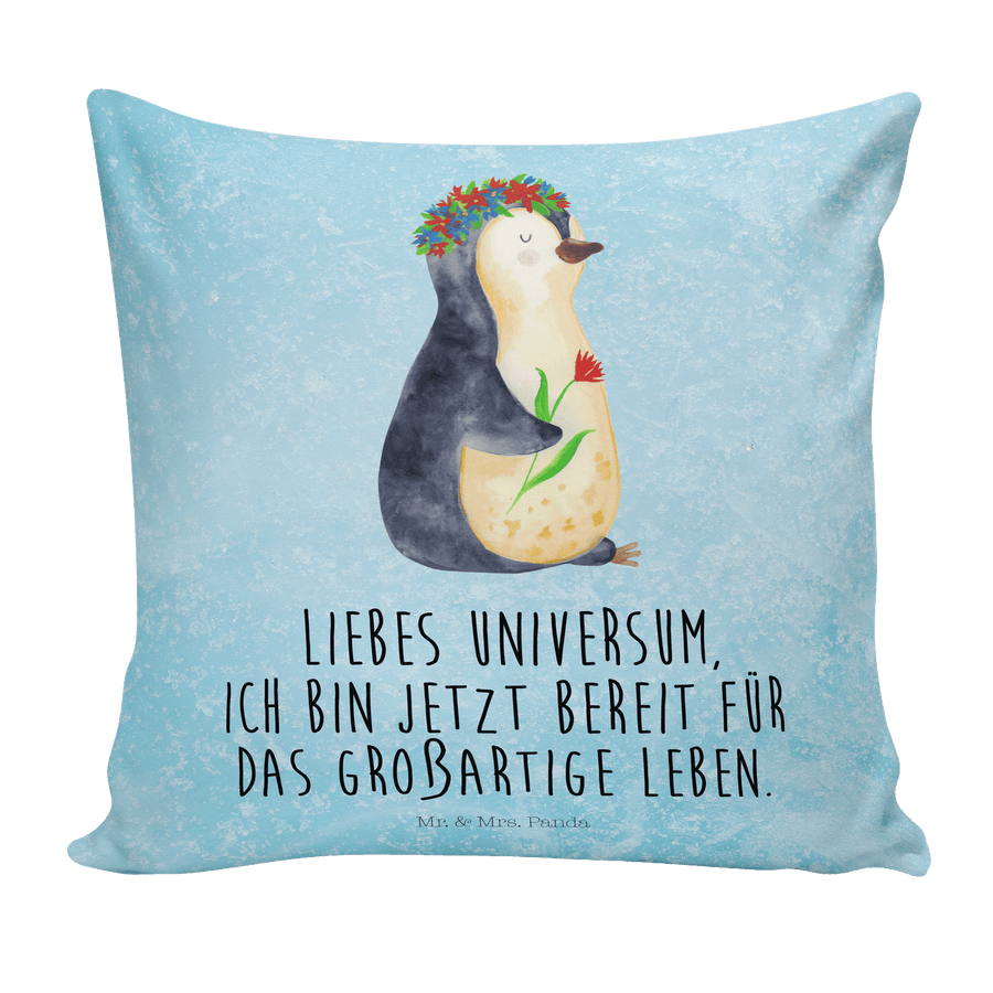 40x40 Kissen Pinguin Blumenkranz - mit Spruch - Eisblau