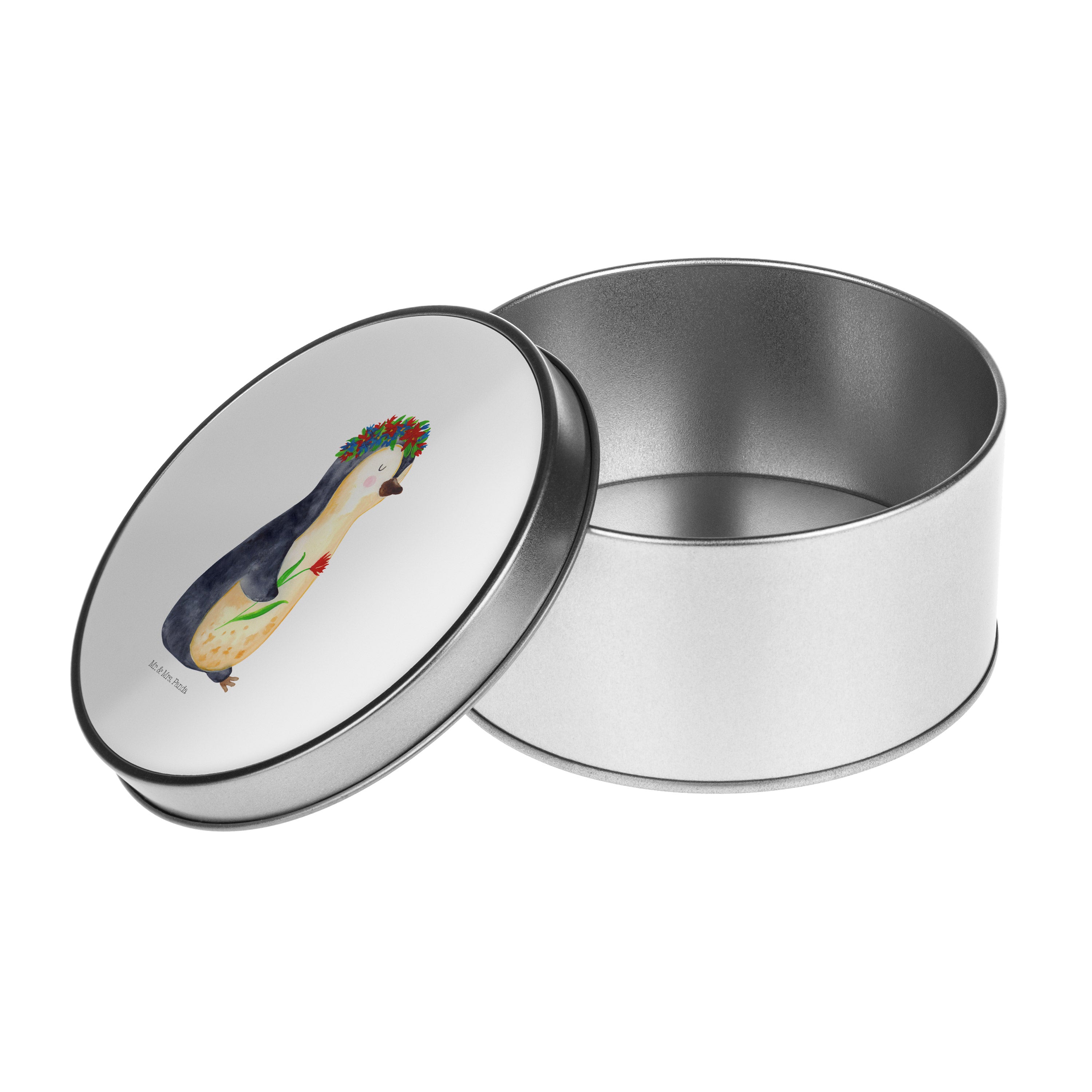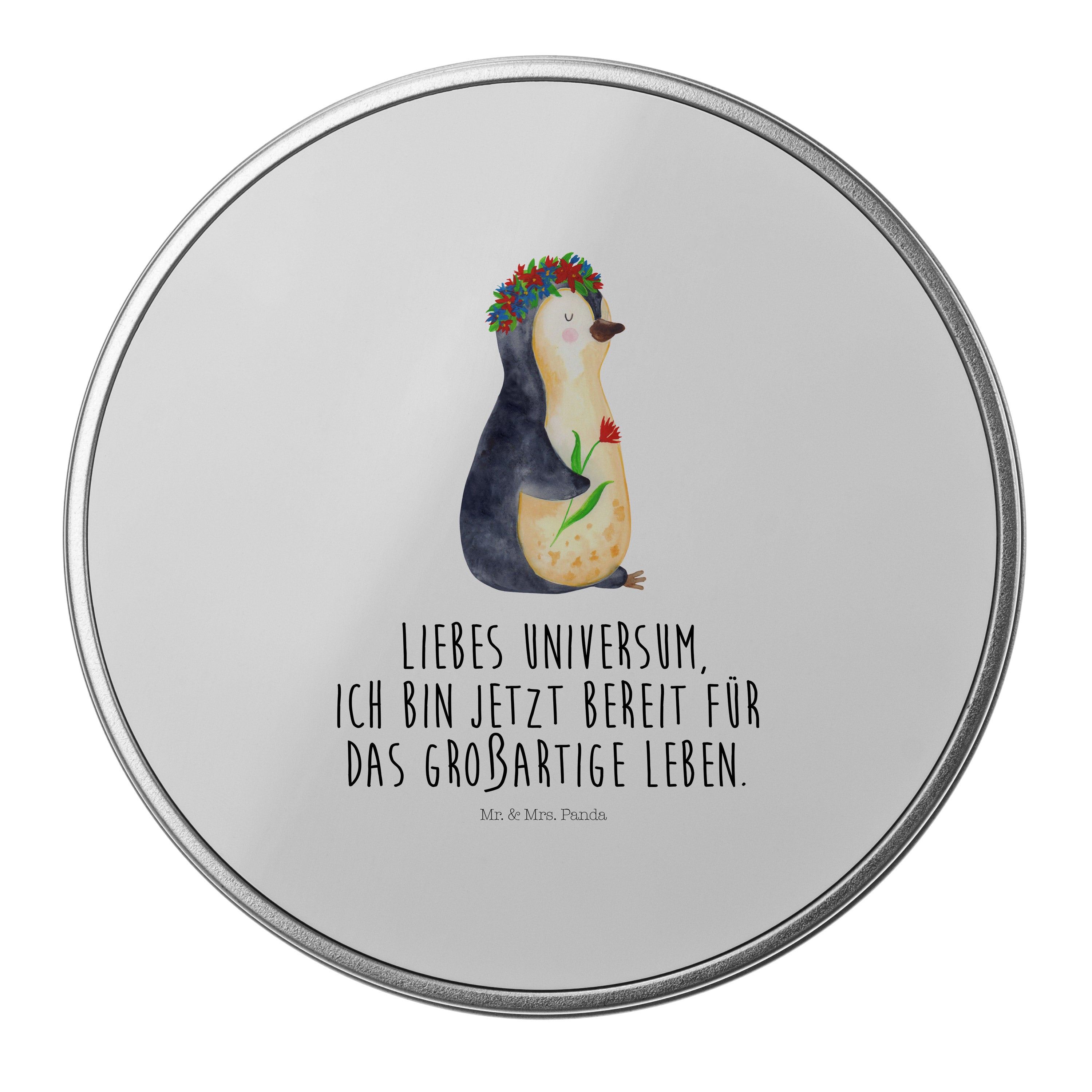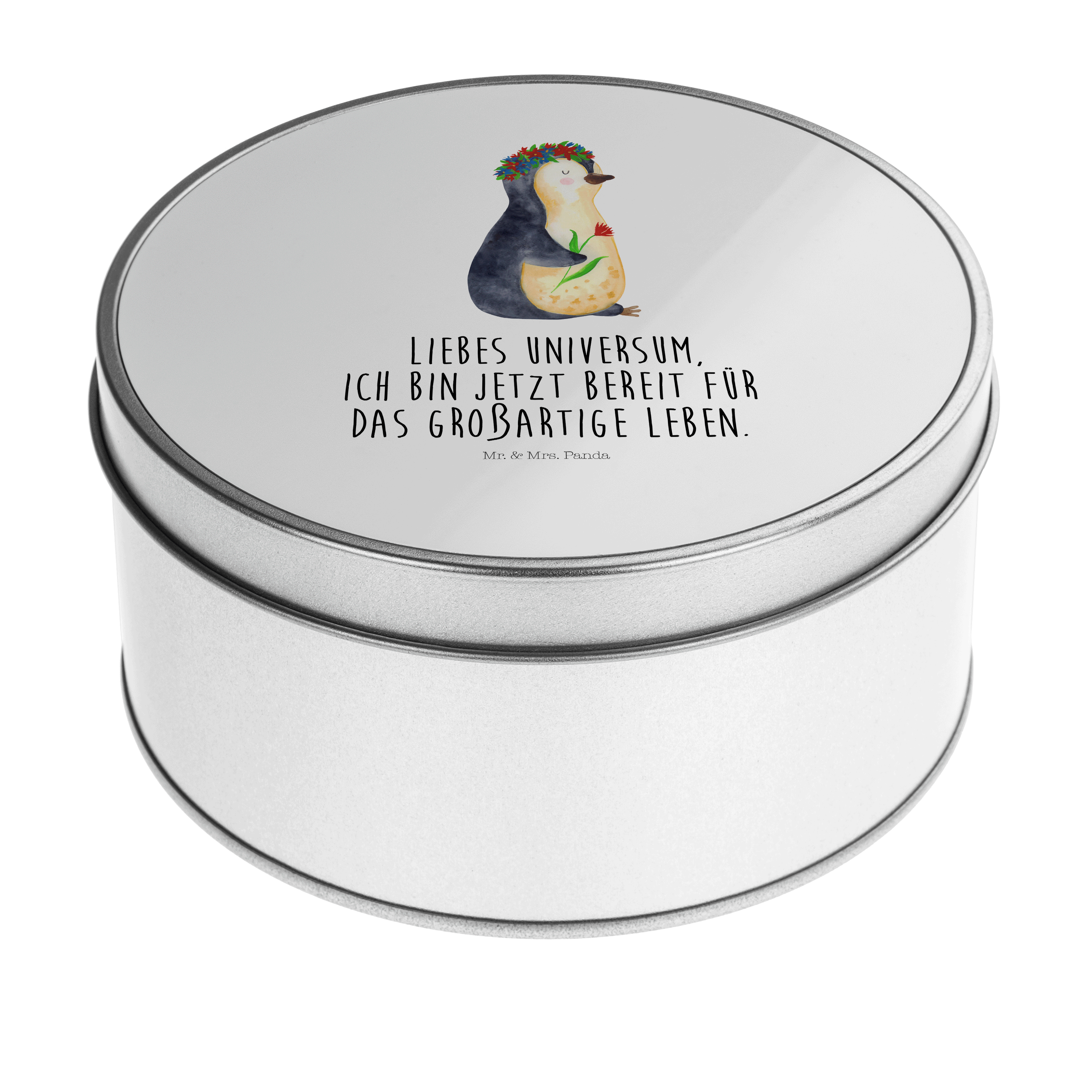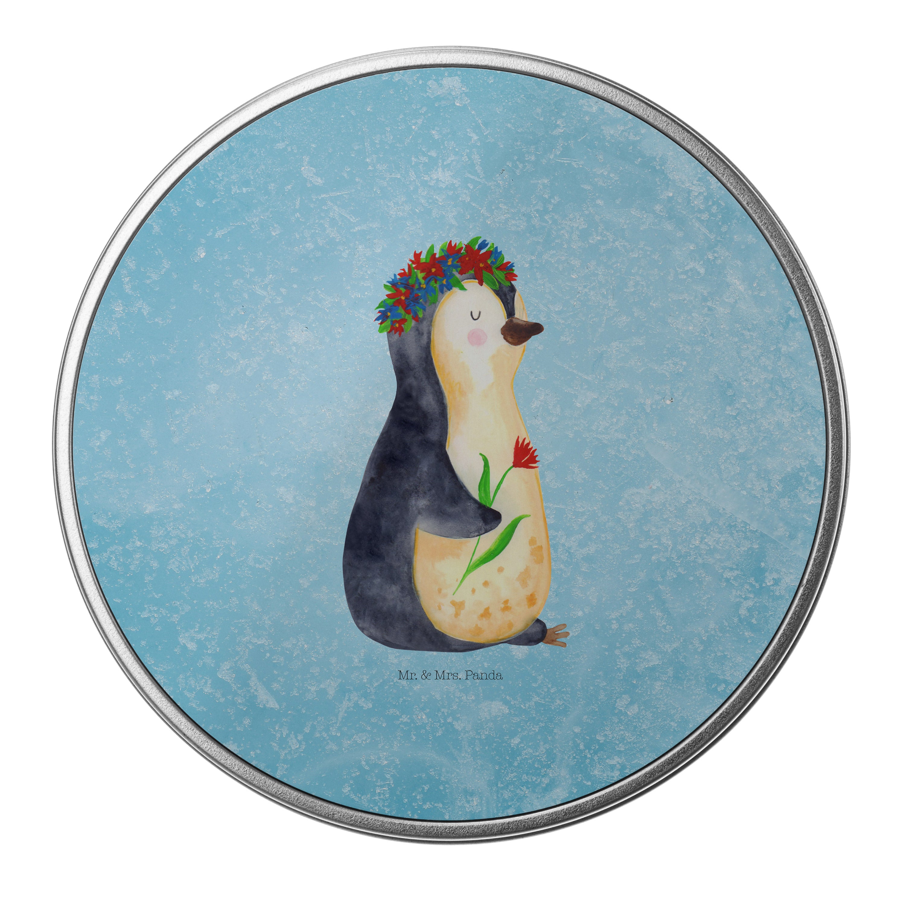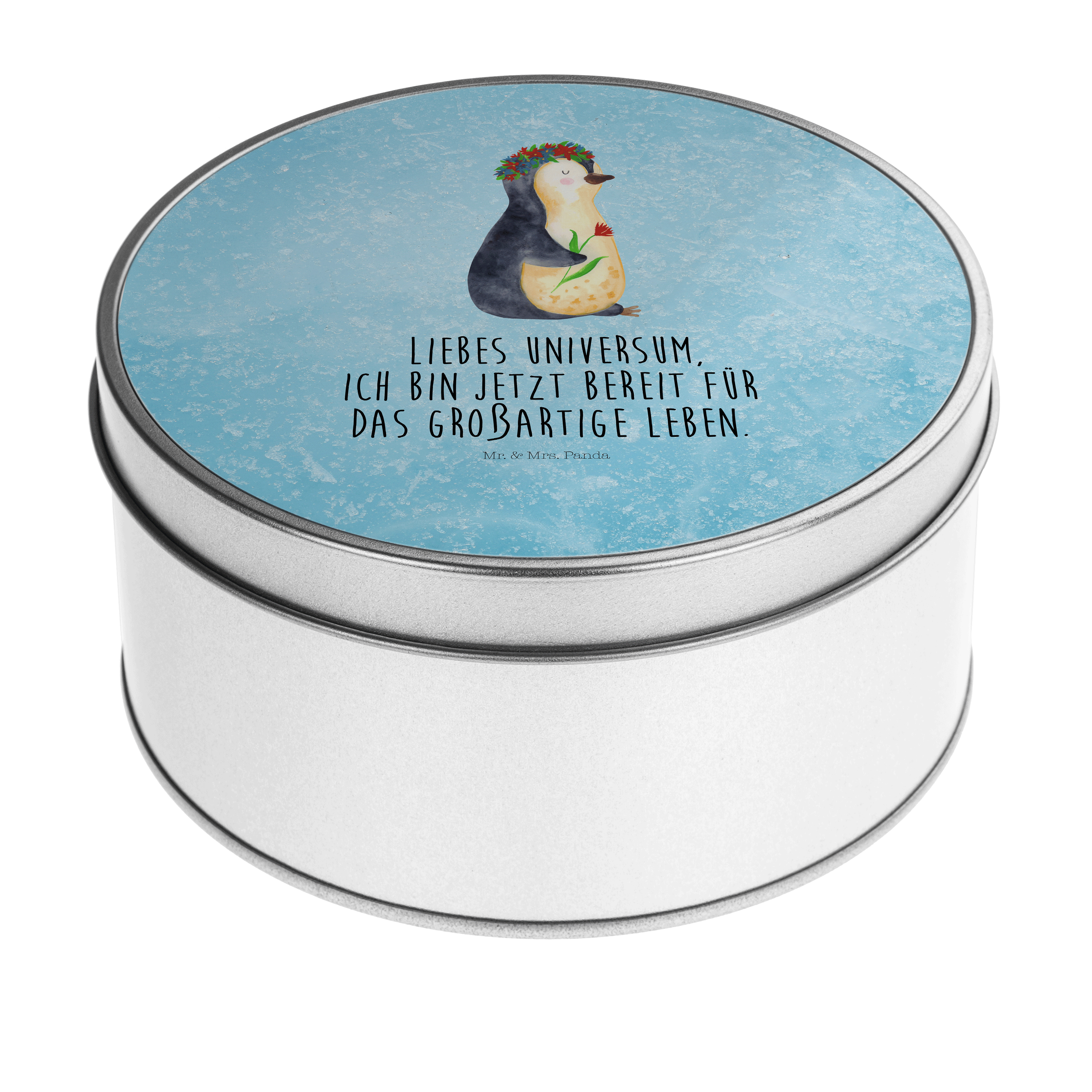 Blechdose rund Pinguin Blumenkranz - mit Spruch - Eisblau
