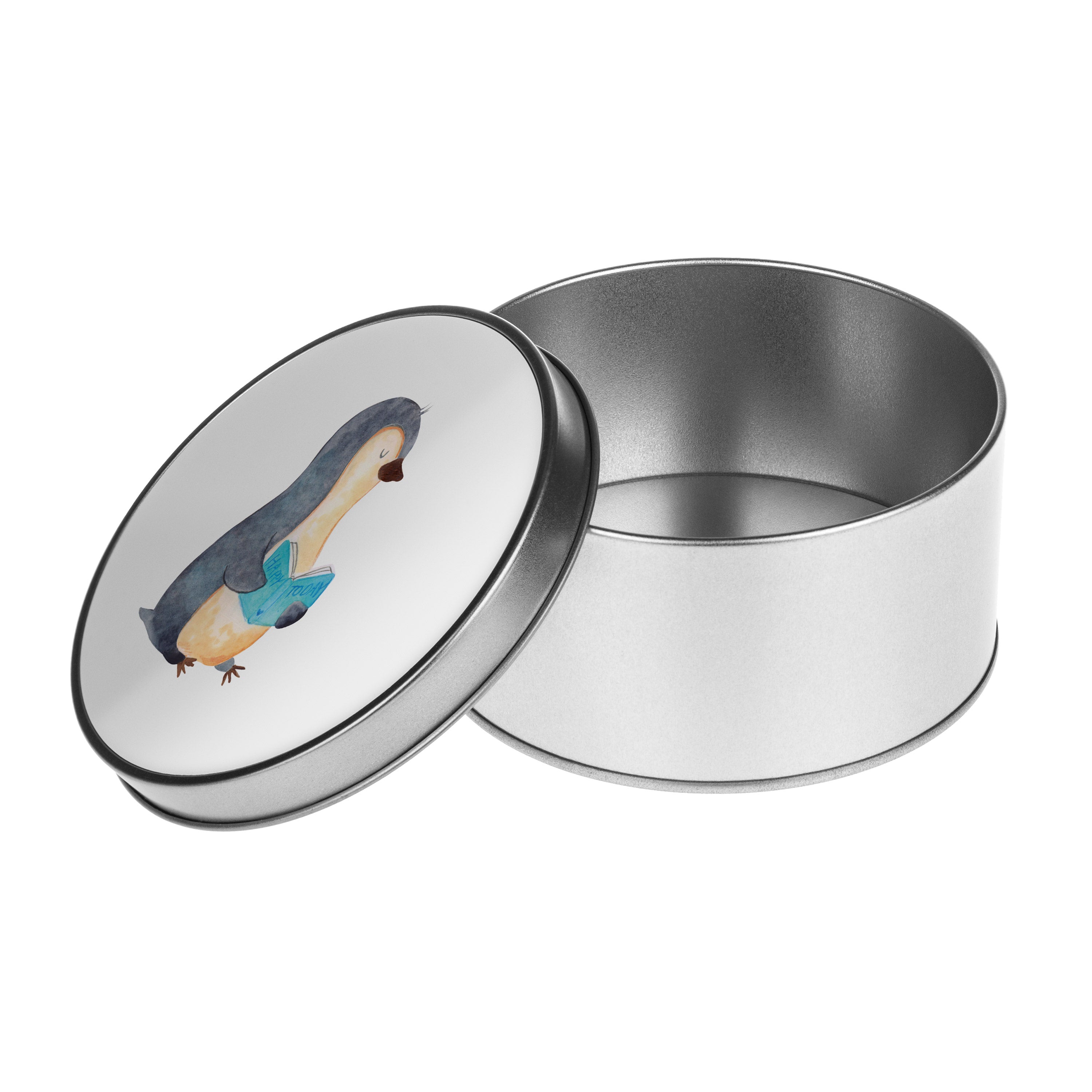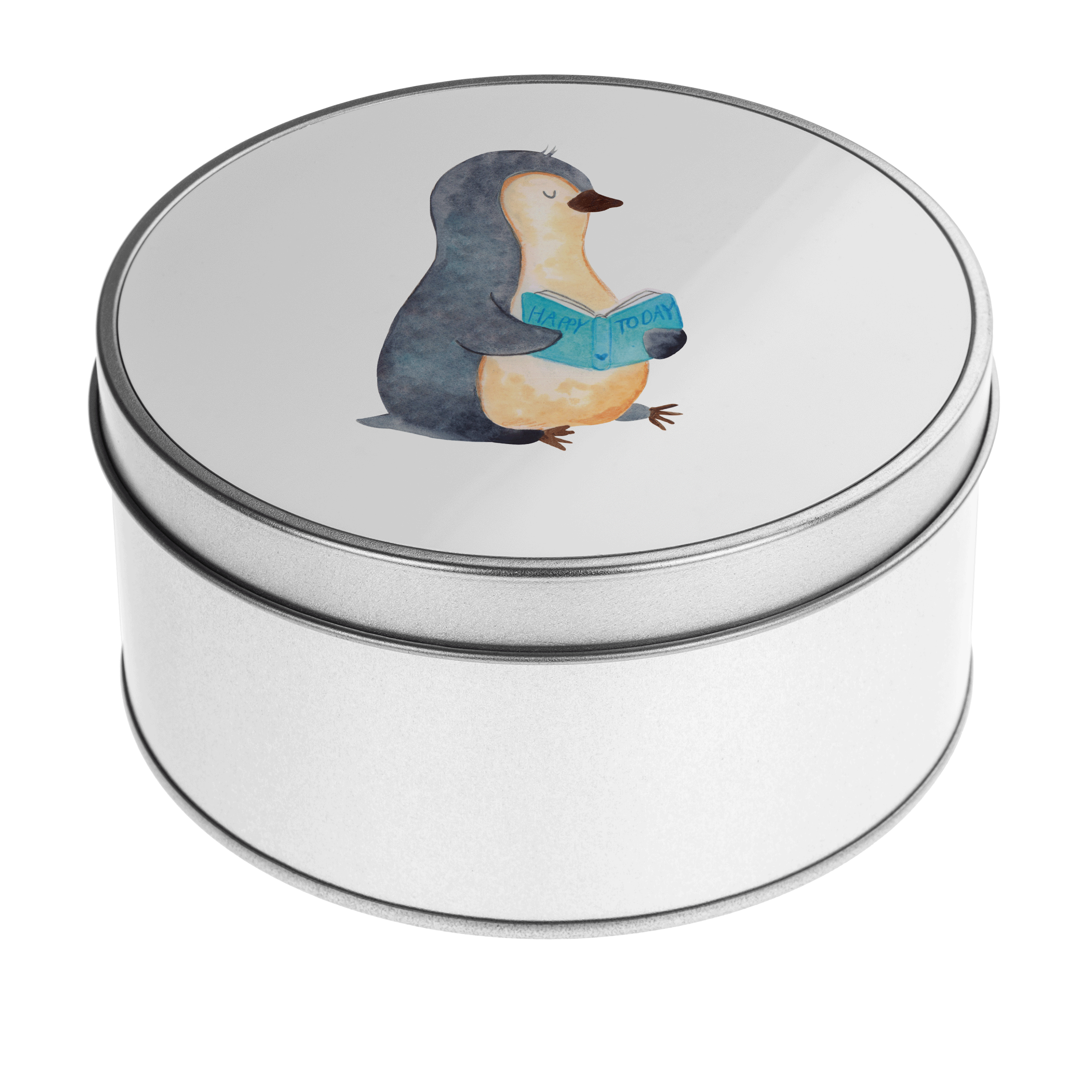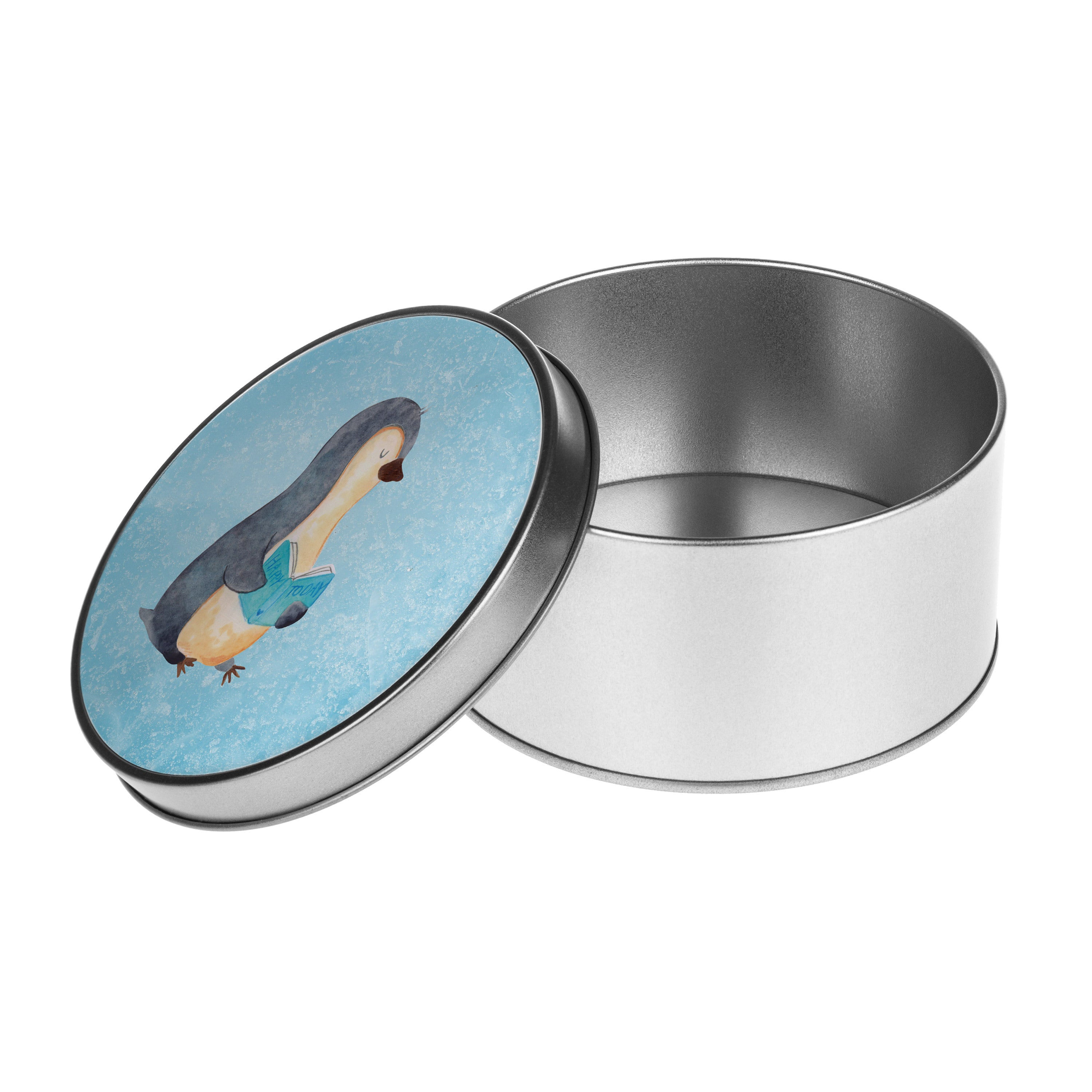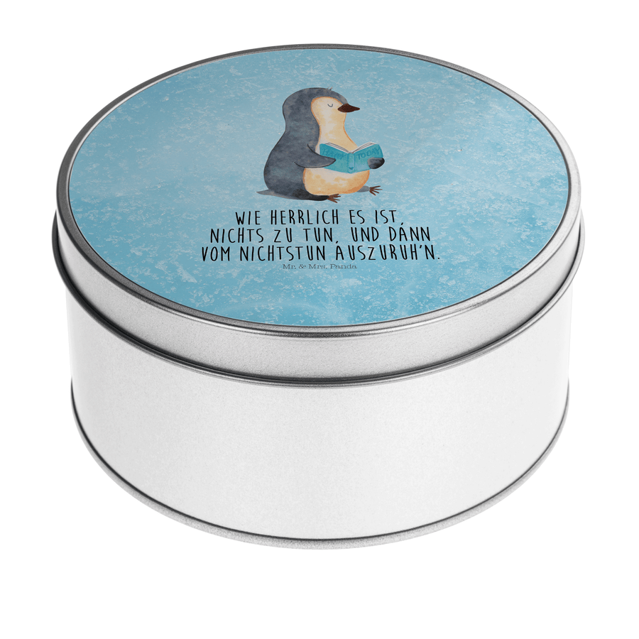 Blechdose rund Pinguin Buch - mit Spruch - Eisblau