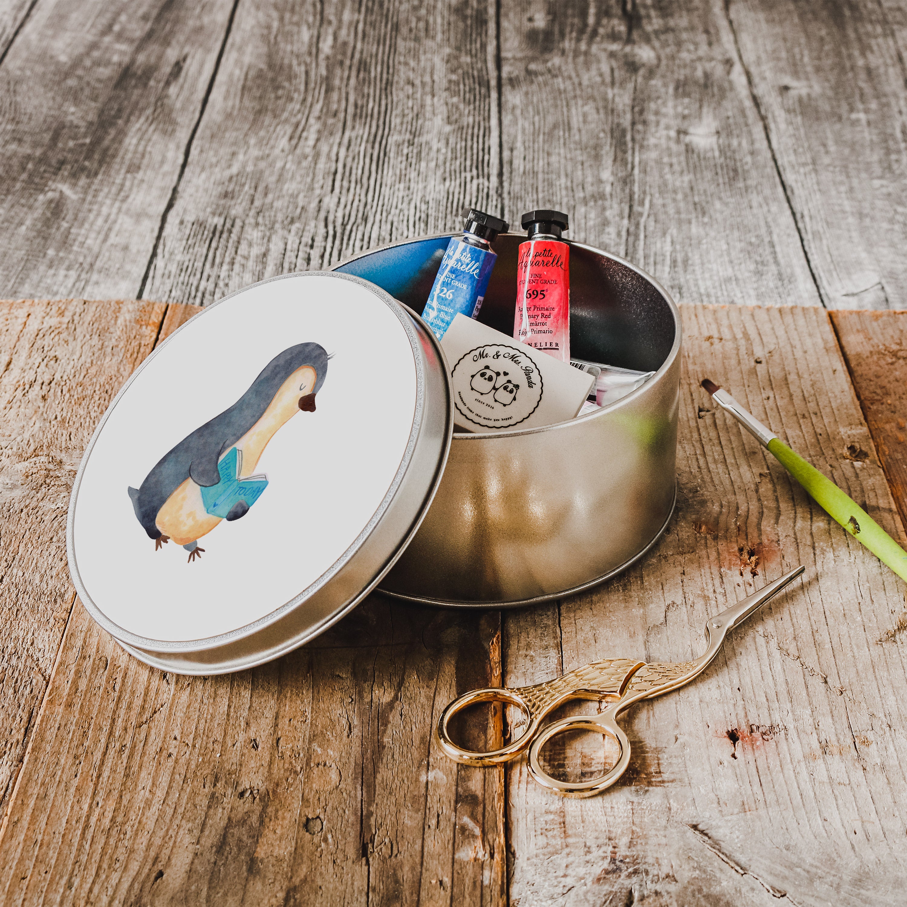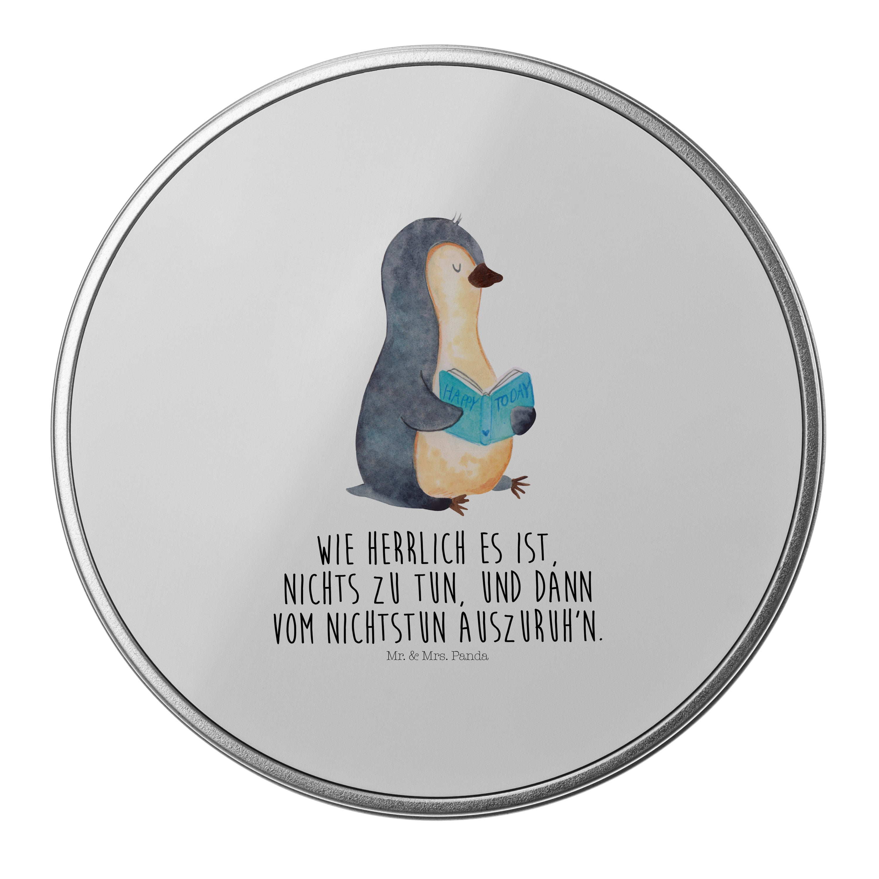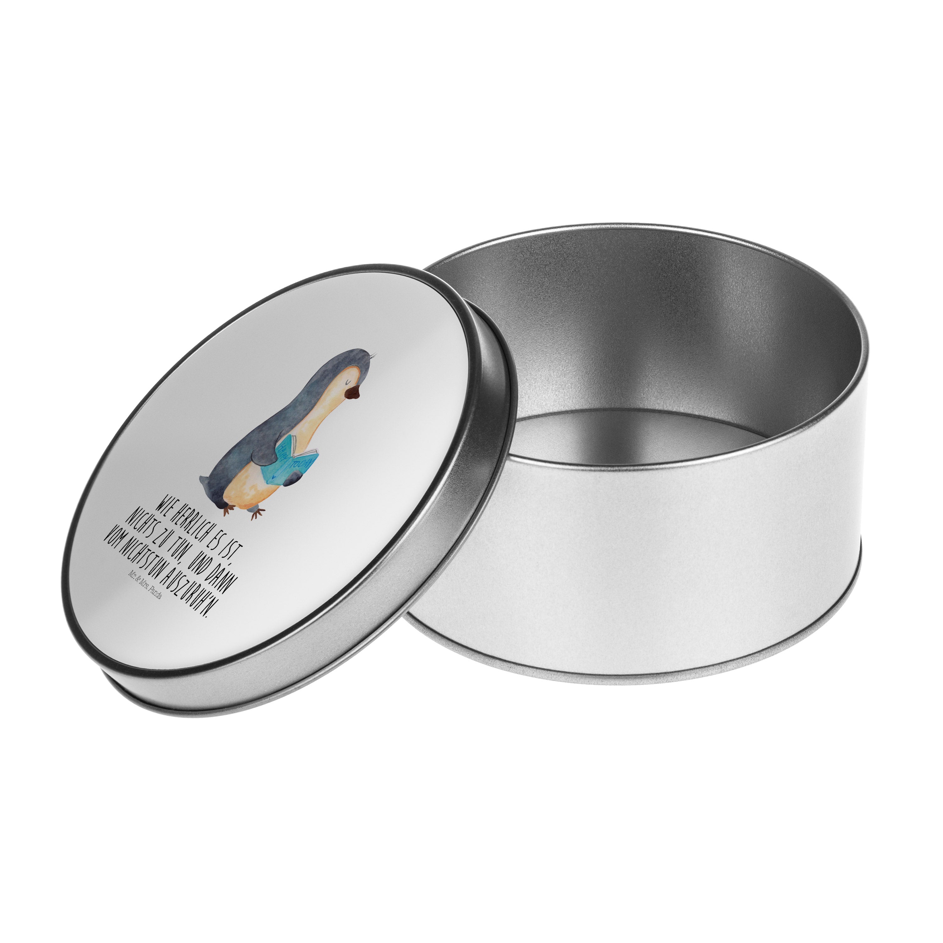 Blechdose rund Pinguin Buch - mit Spruch - Eisblau