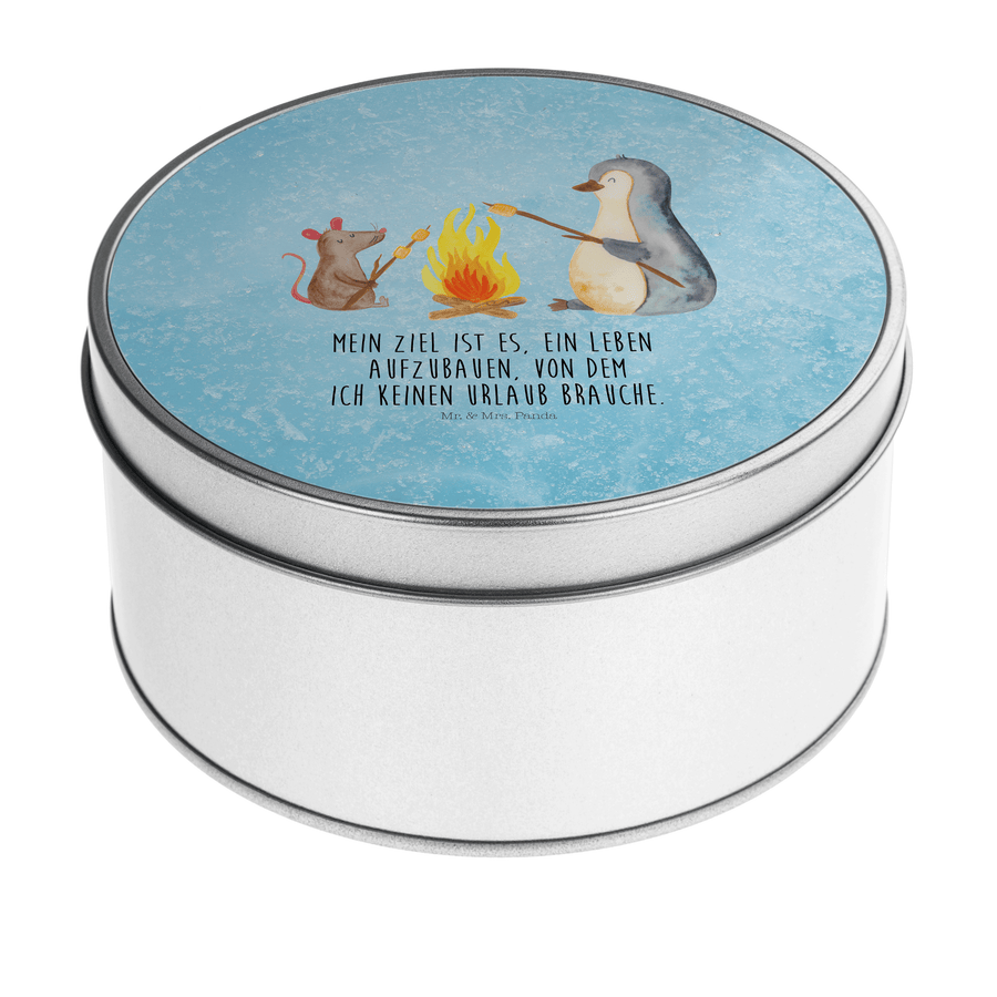 Blechdose rund Pinguin Lagerfeuer - mit Spruch