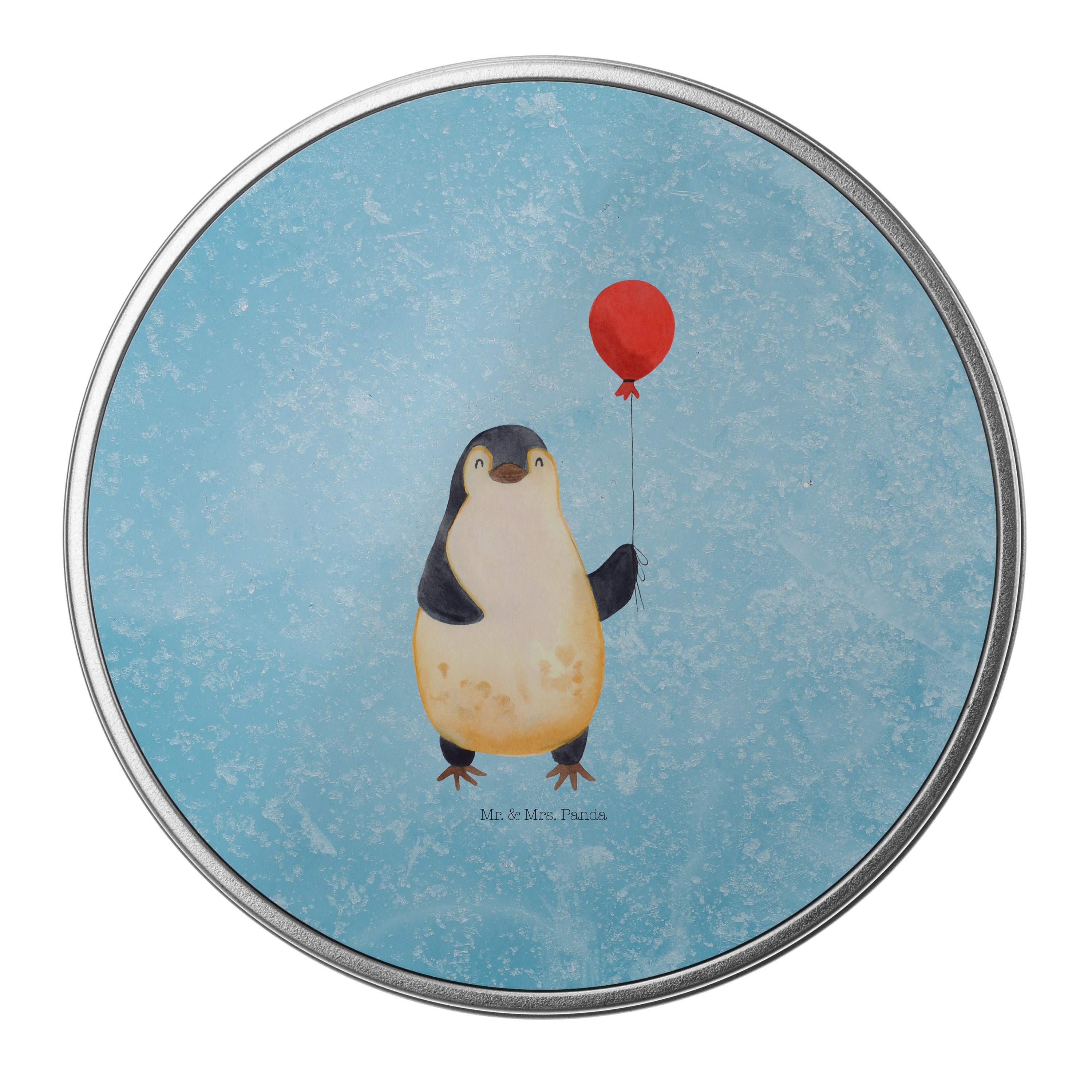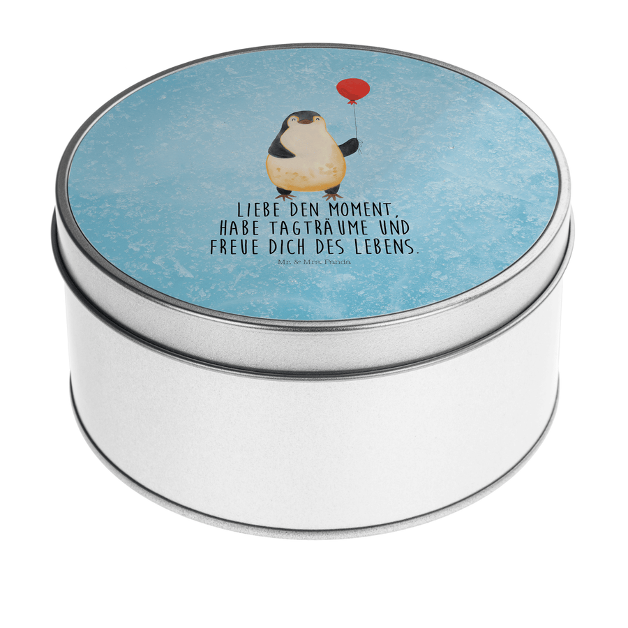 Blechdose rund Pinguin Luftballon - mit Spruch - Eisblau