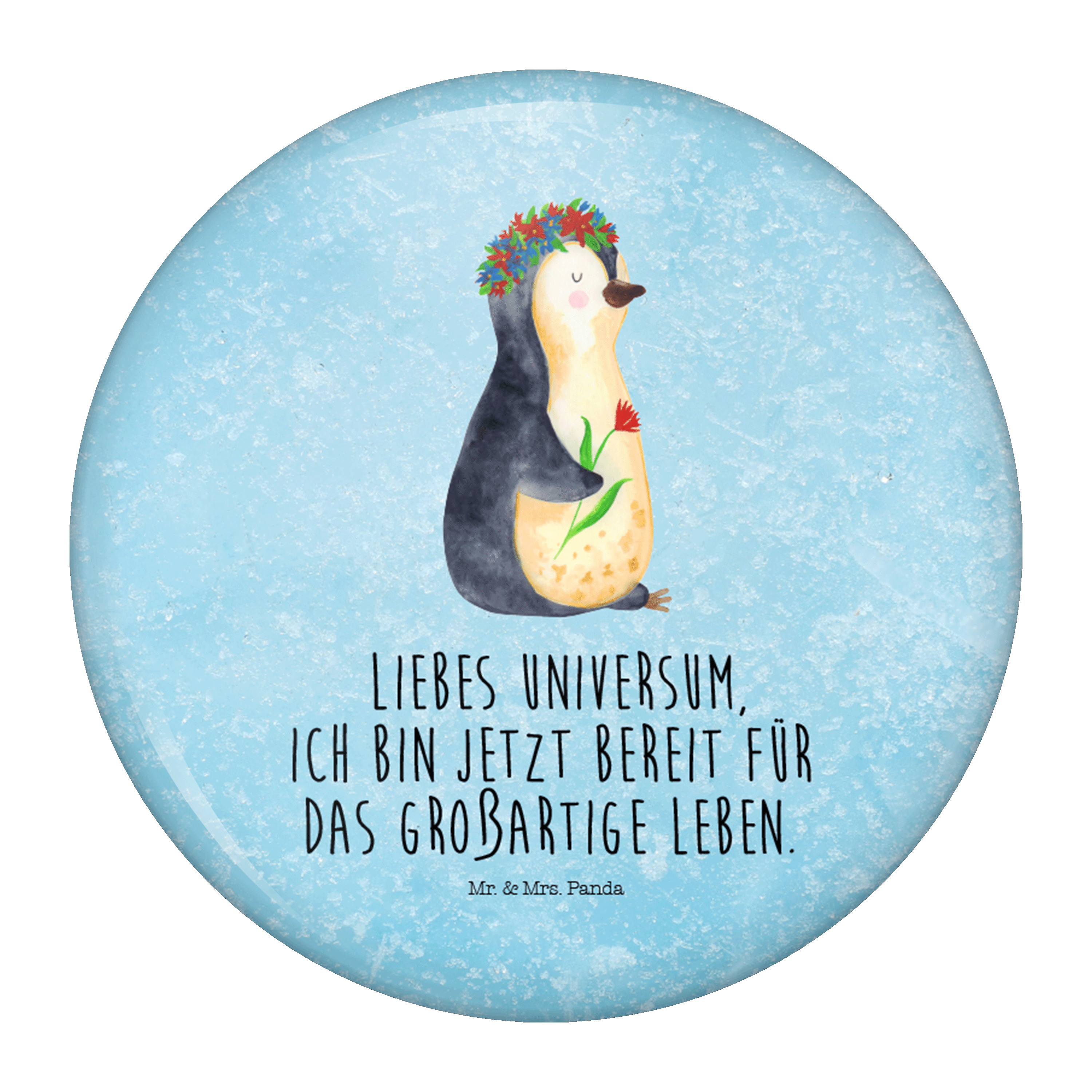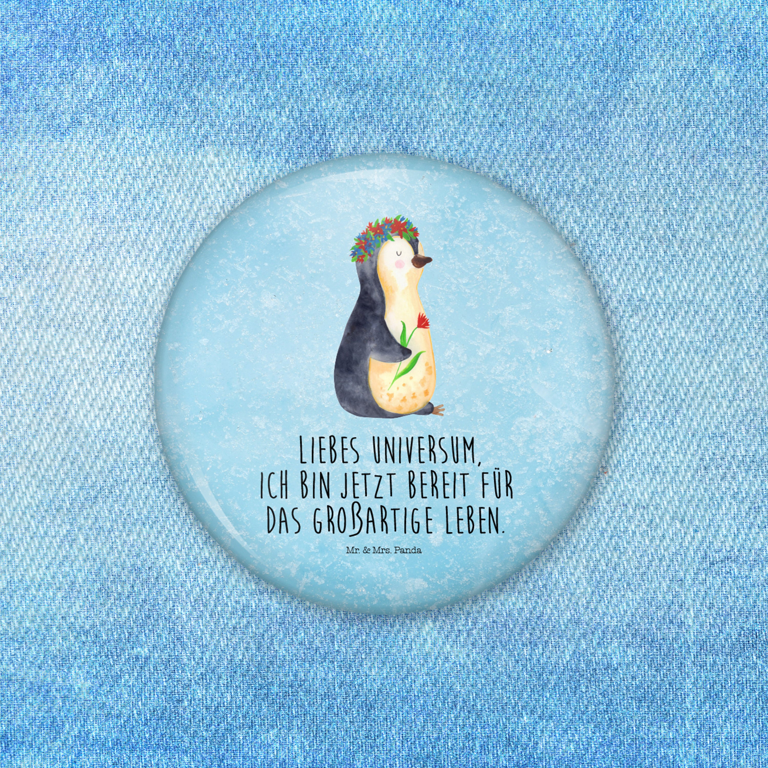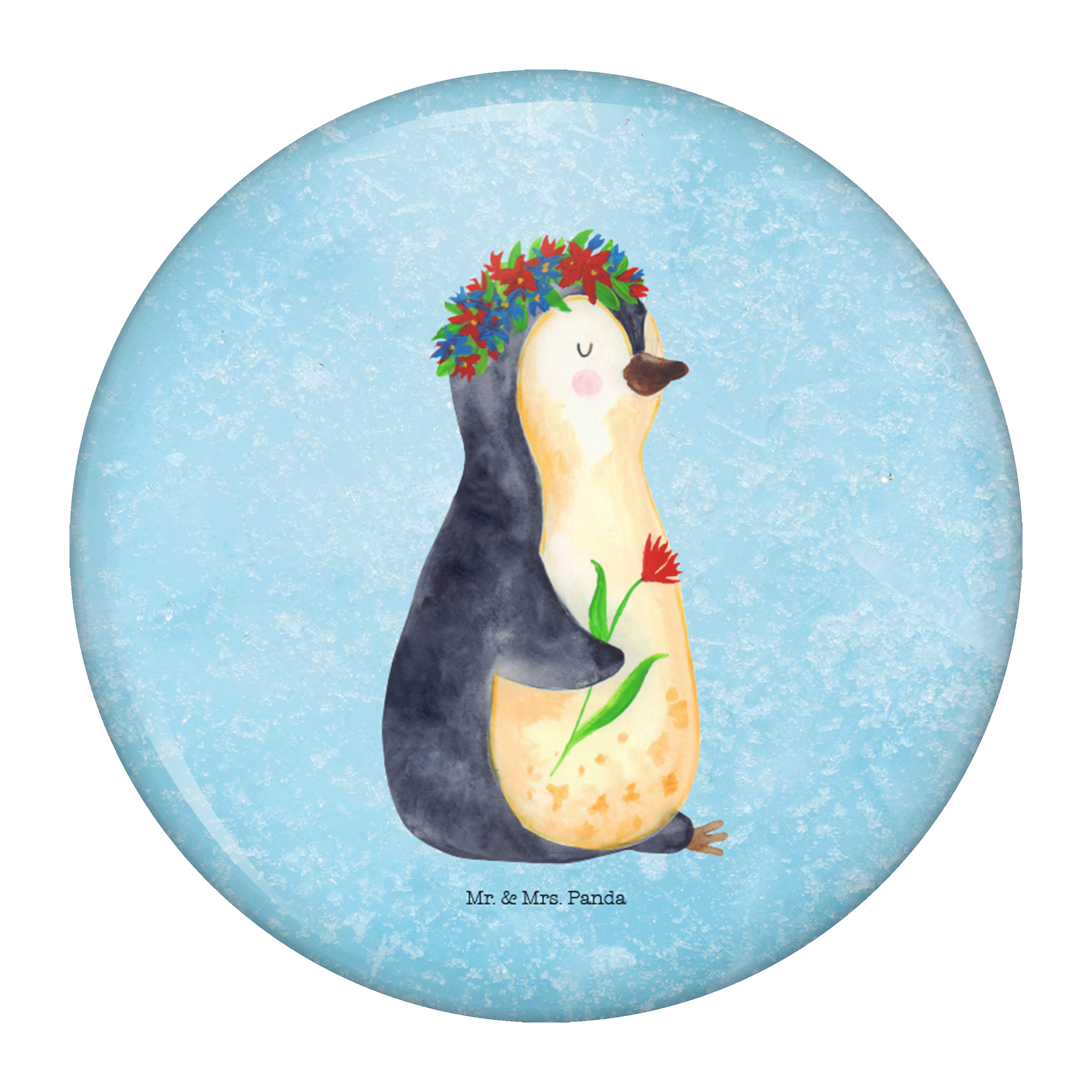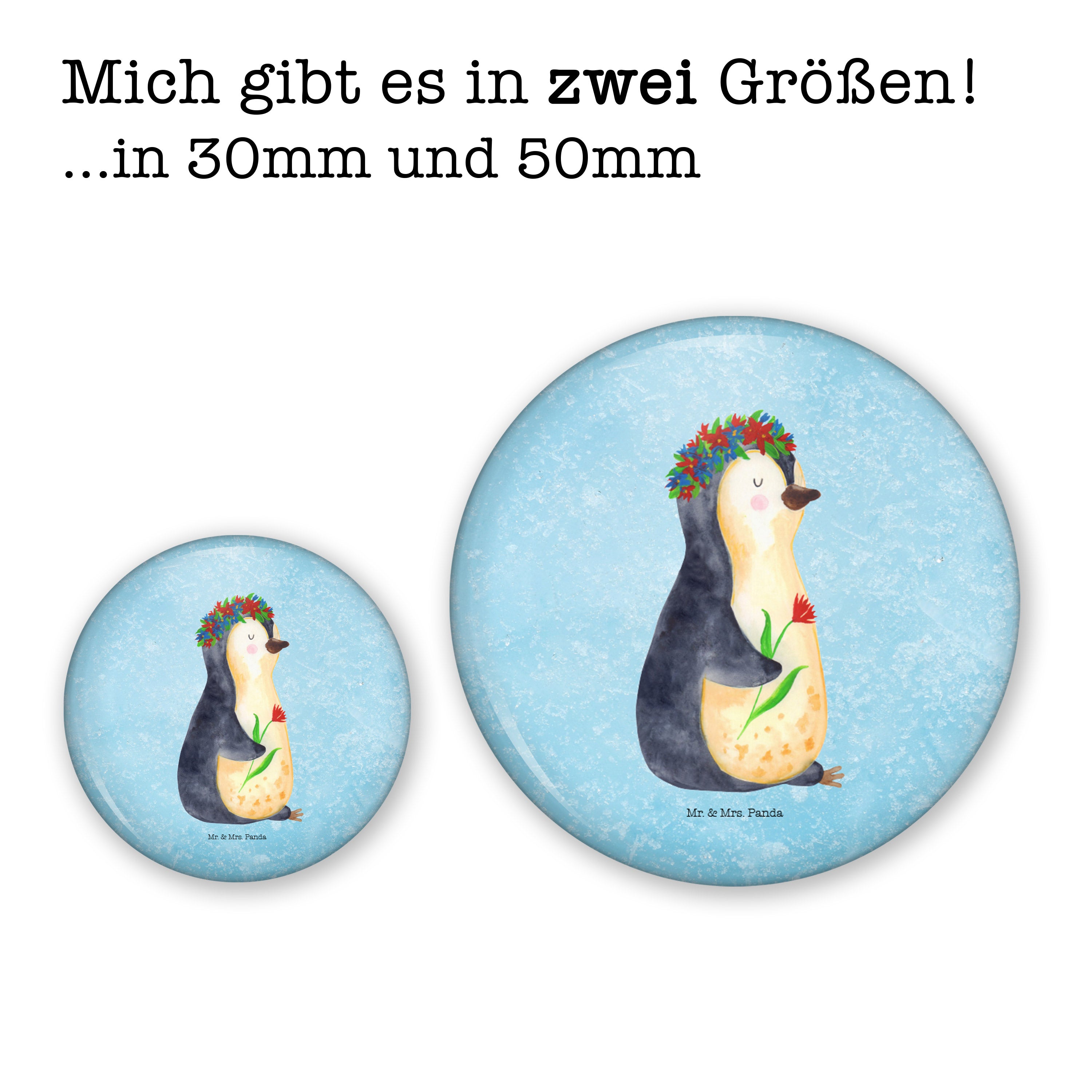 50mm Button Pinguin Blumenkranz - mit Spruch - Eisblau
