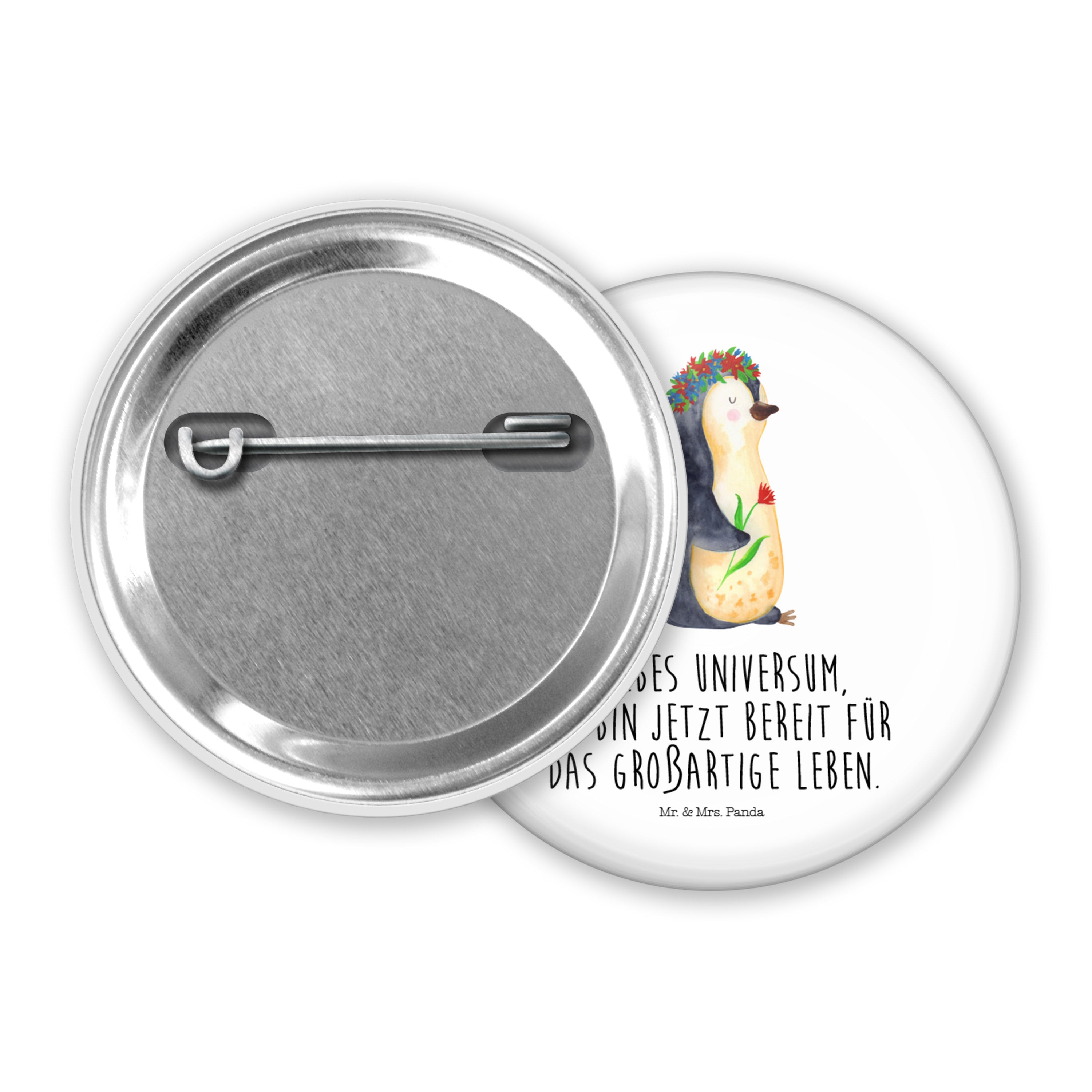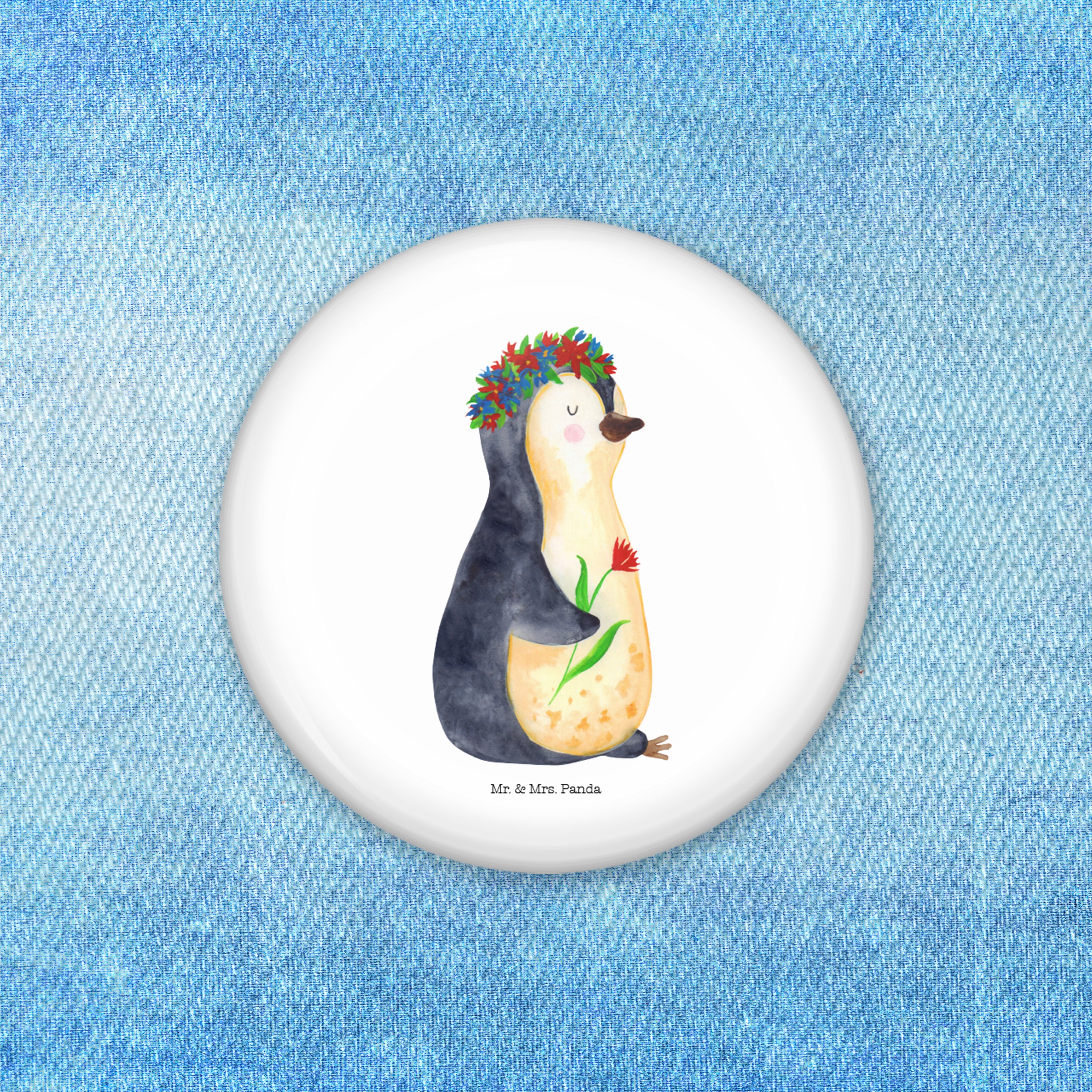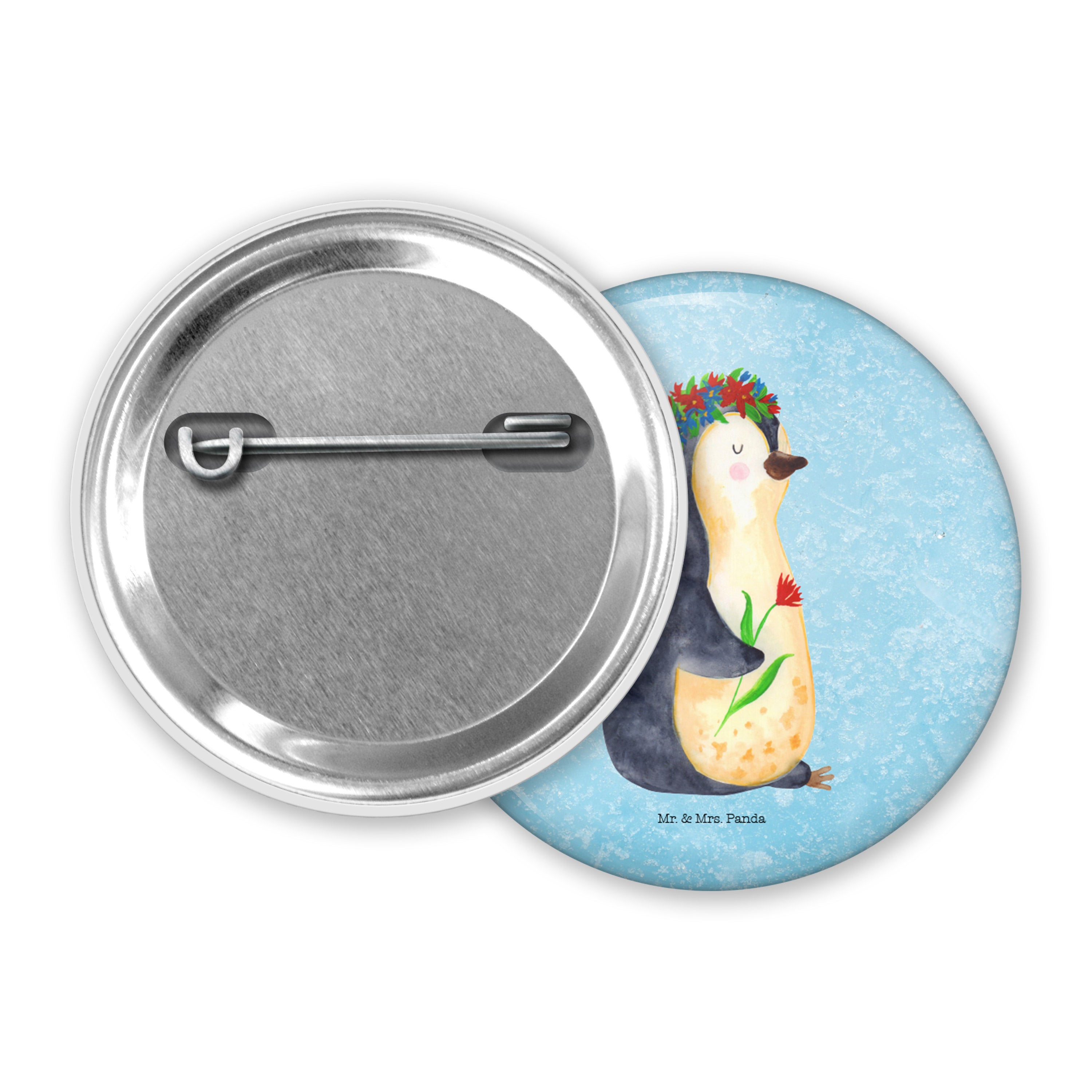 50mm Button Pinguin Blumenkranz - mit Spruch - Eisblau