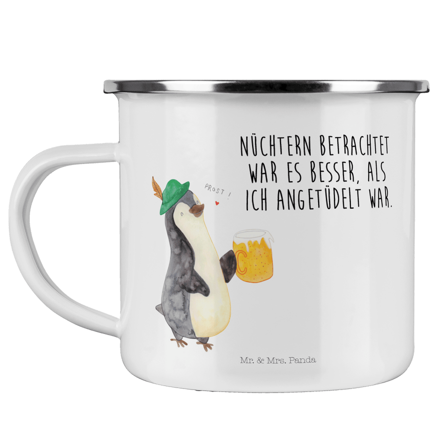 Camping Emaille Tasse Pinguin Bier - mit Spruch - Weiß