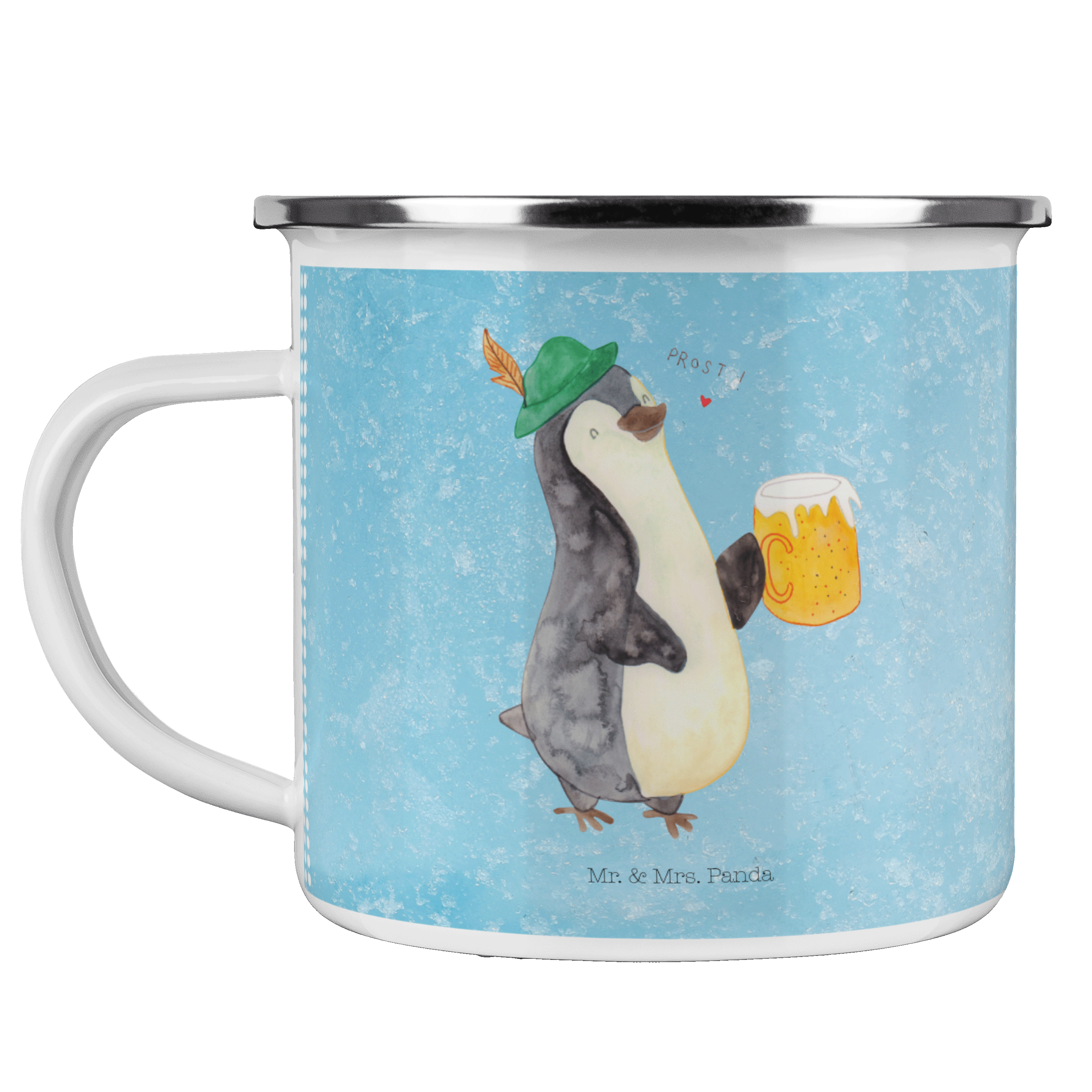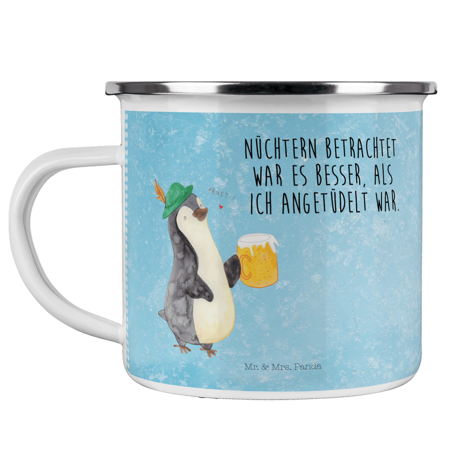 Camping Emaille Tasse Pinguin Bier - mit Spruch - Eisblau