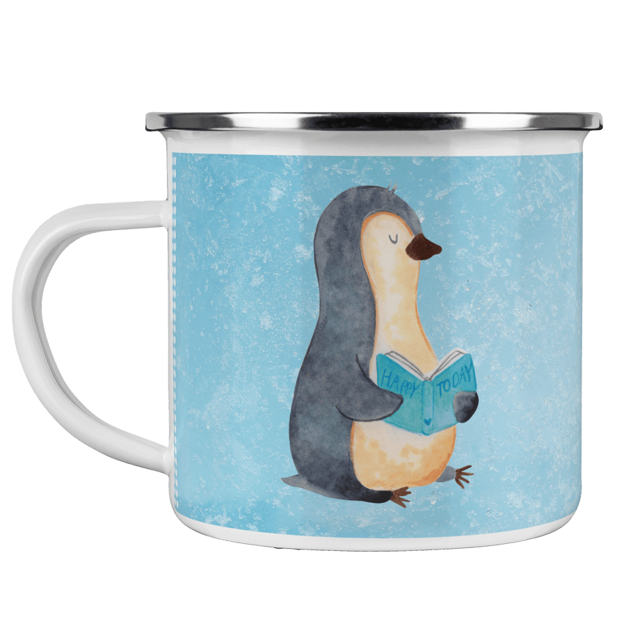 Camping Emaille Tasse Pinguin Buch - ohne Spruch - Eisblau