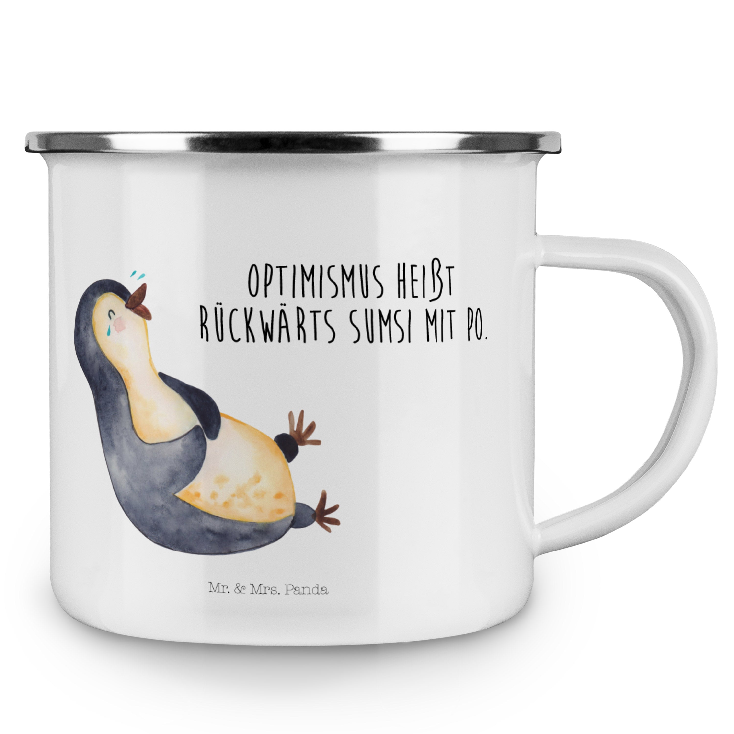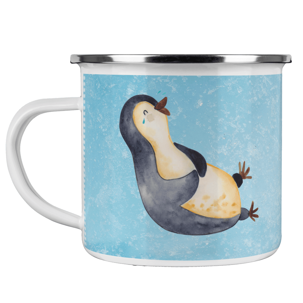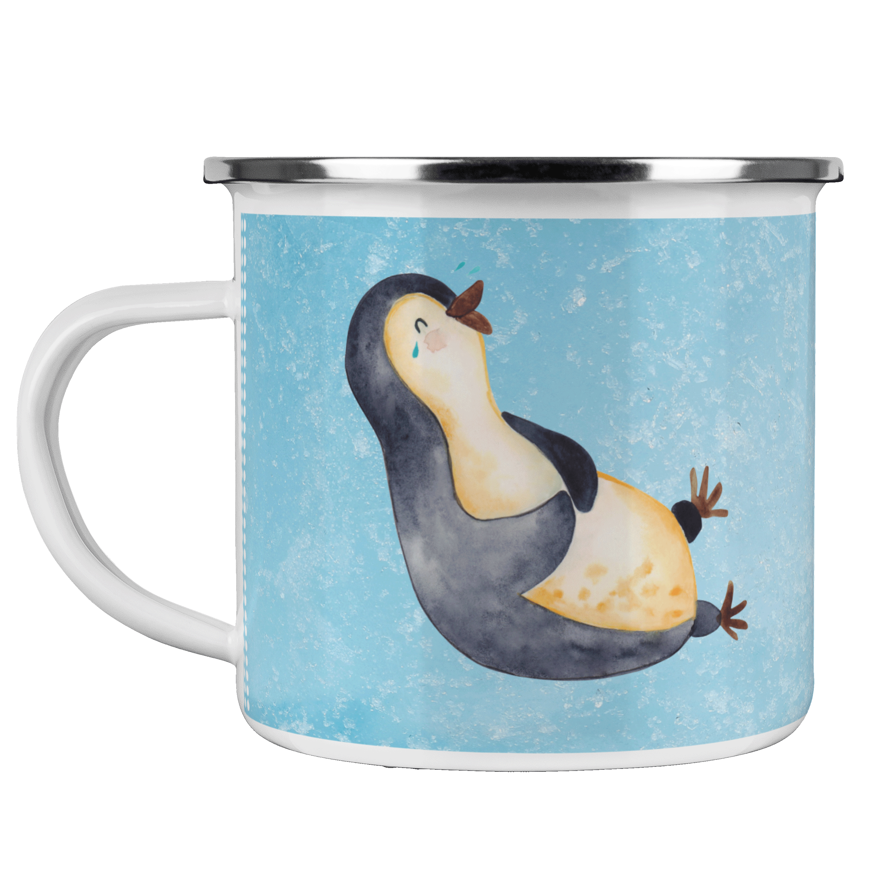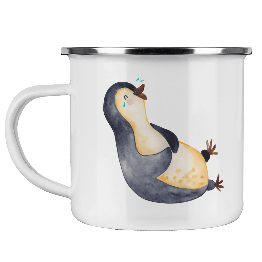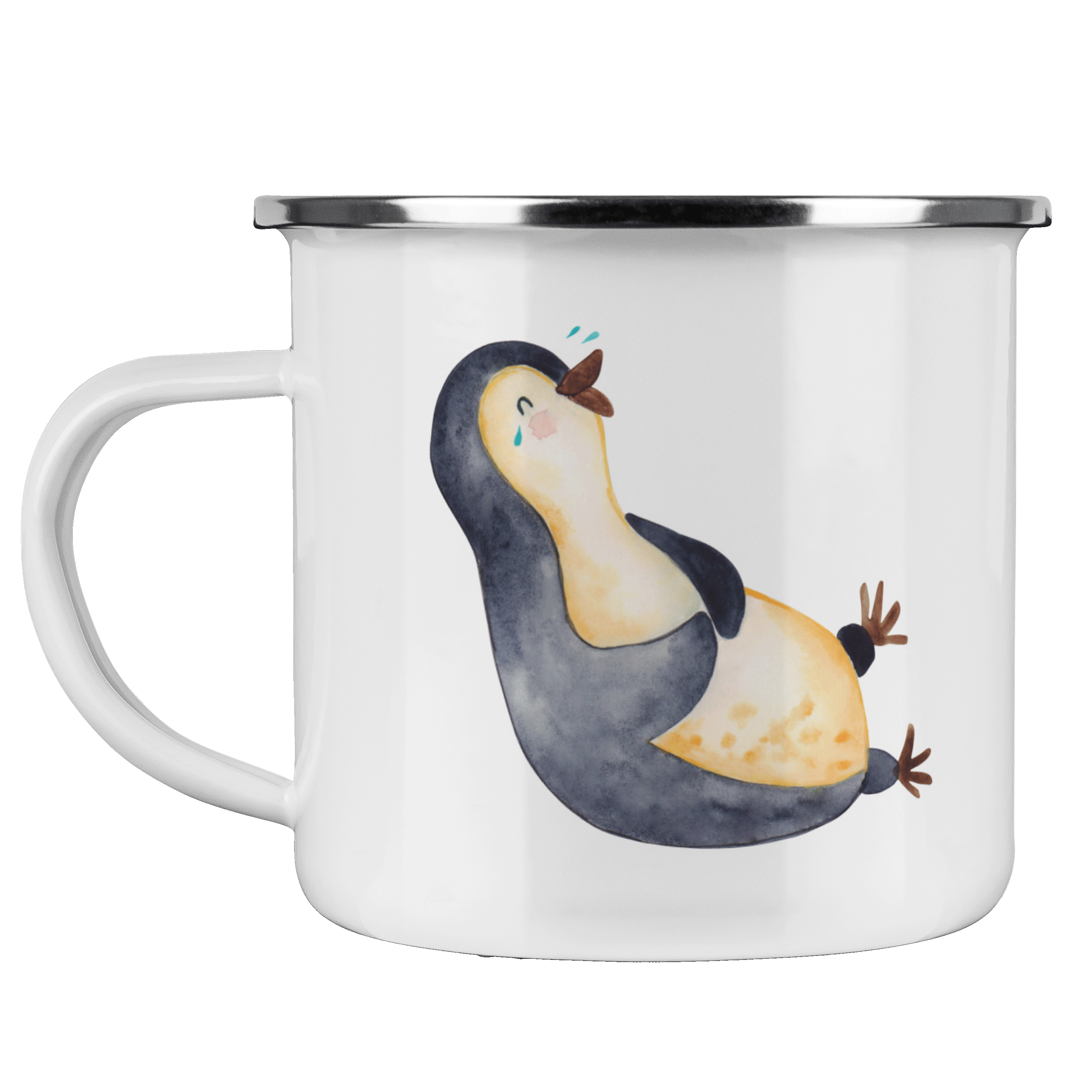 Camping Emaille Tasse Pinguin lachend - mit Spruch - Weiß