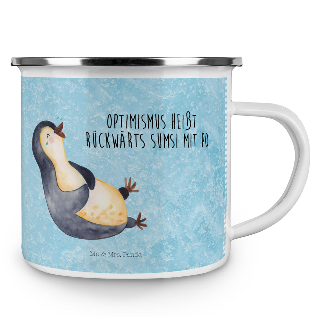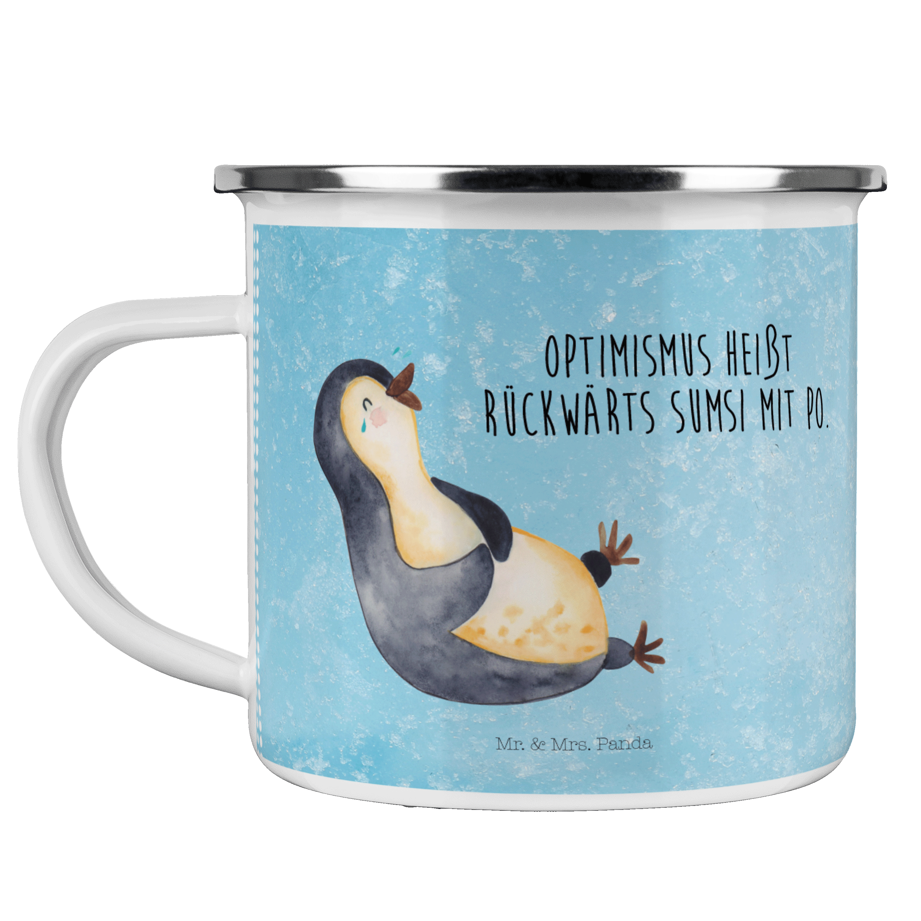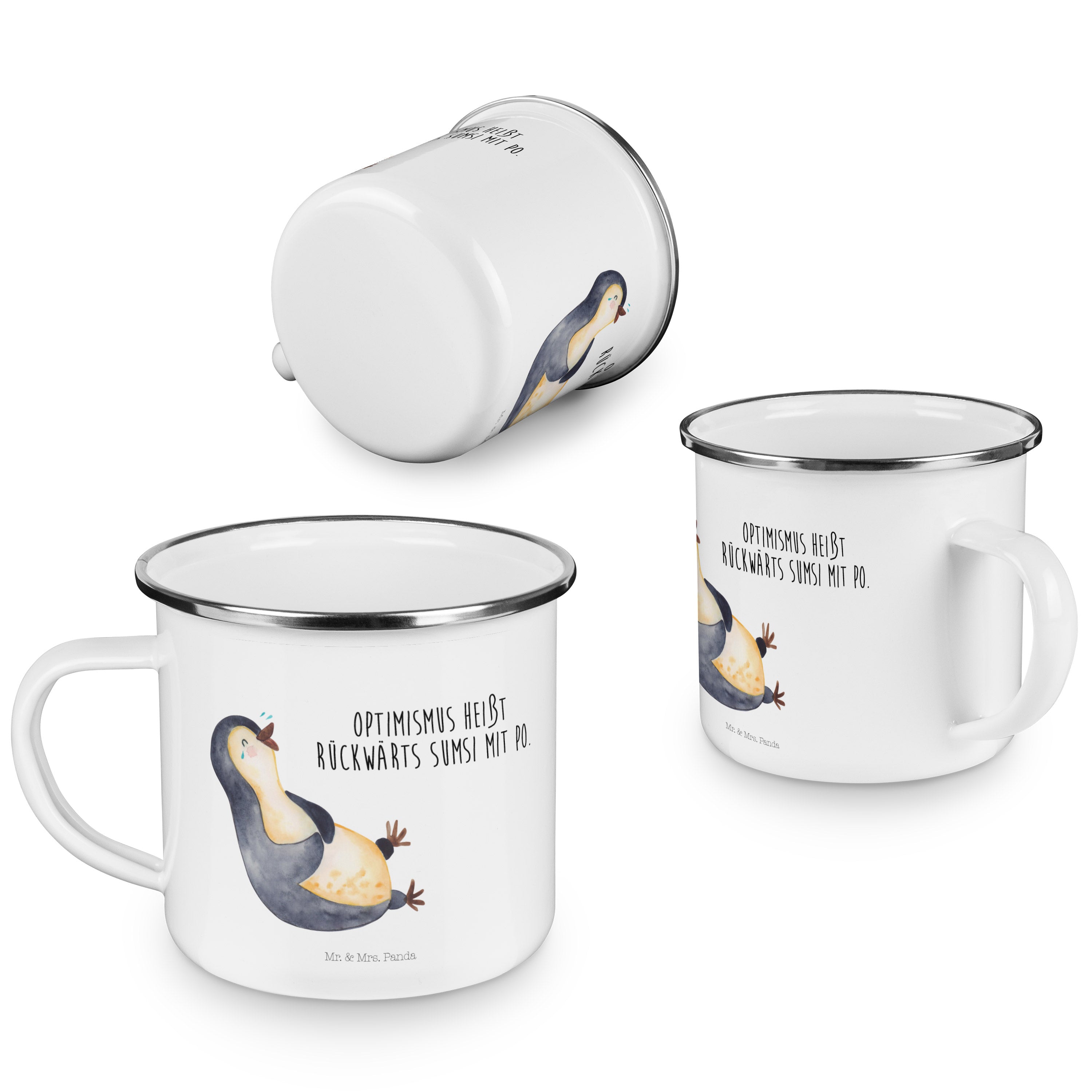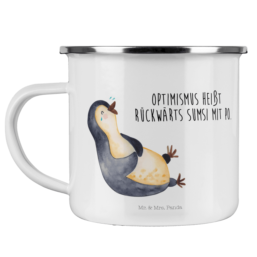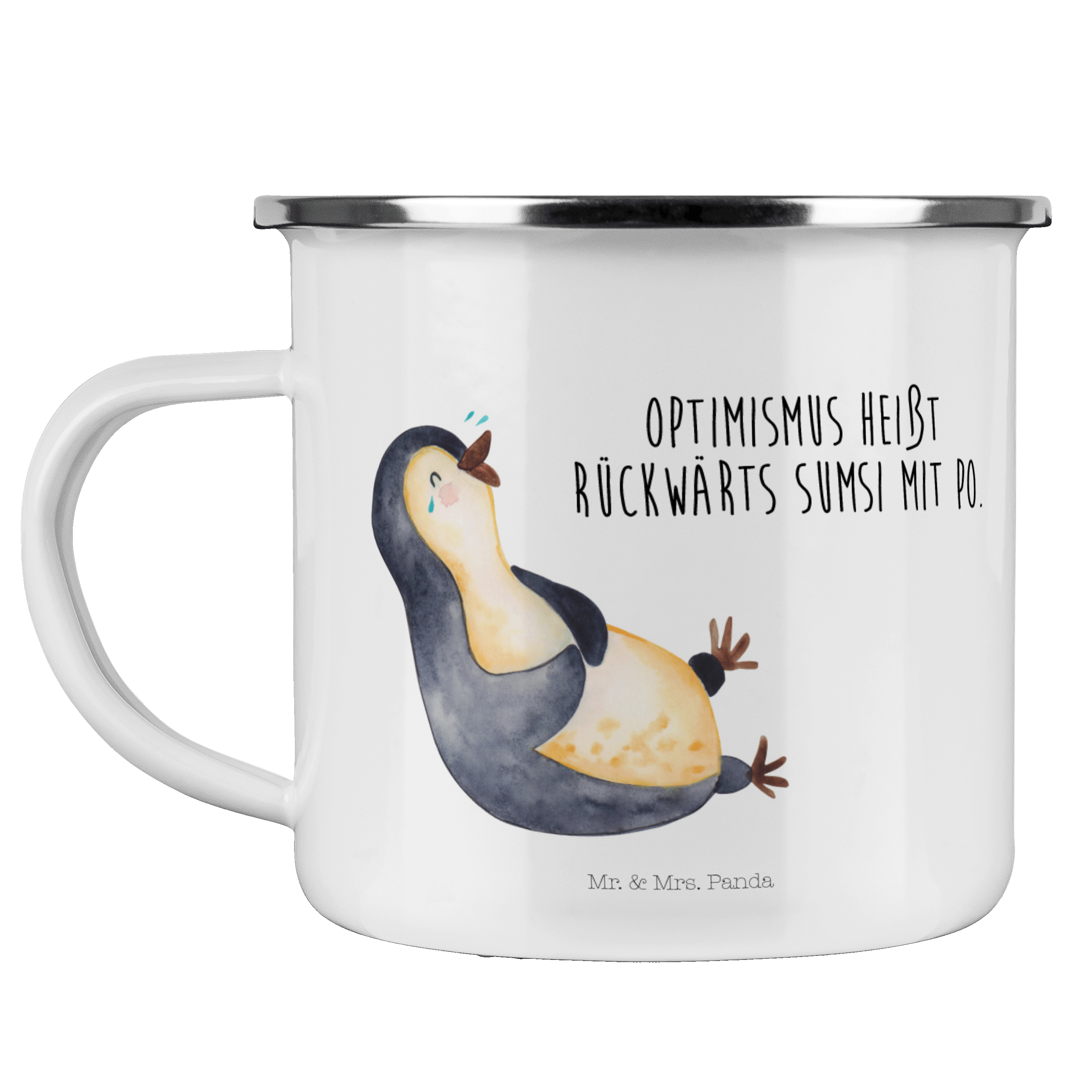 Camping Emaille Tasse Pinguin lachend - mit Spruch - Weiß
