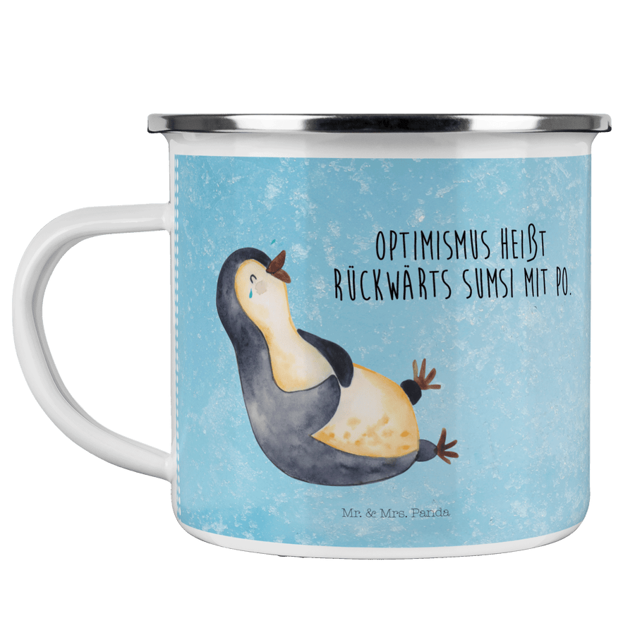 Camping Emaille Tasse Pinguin lachend - mit Spruch - Eisblau