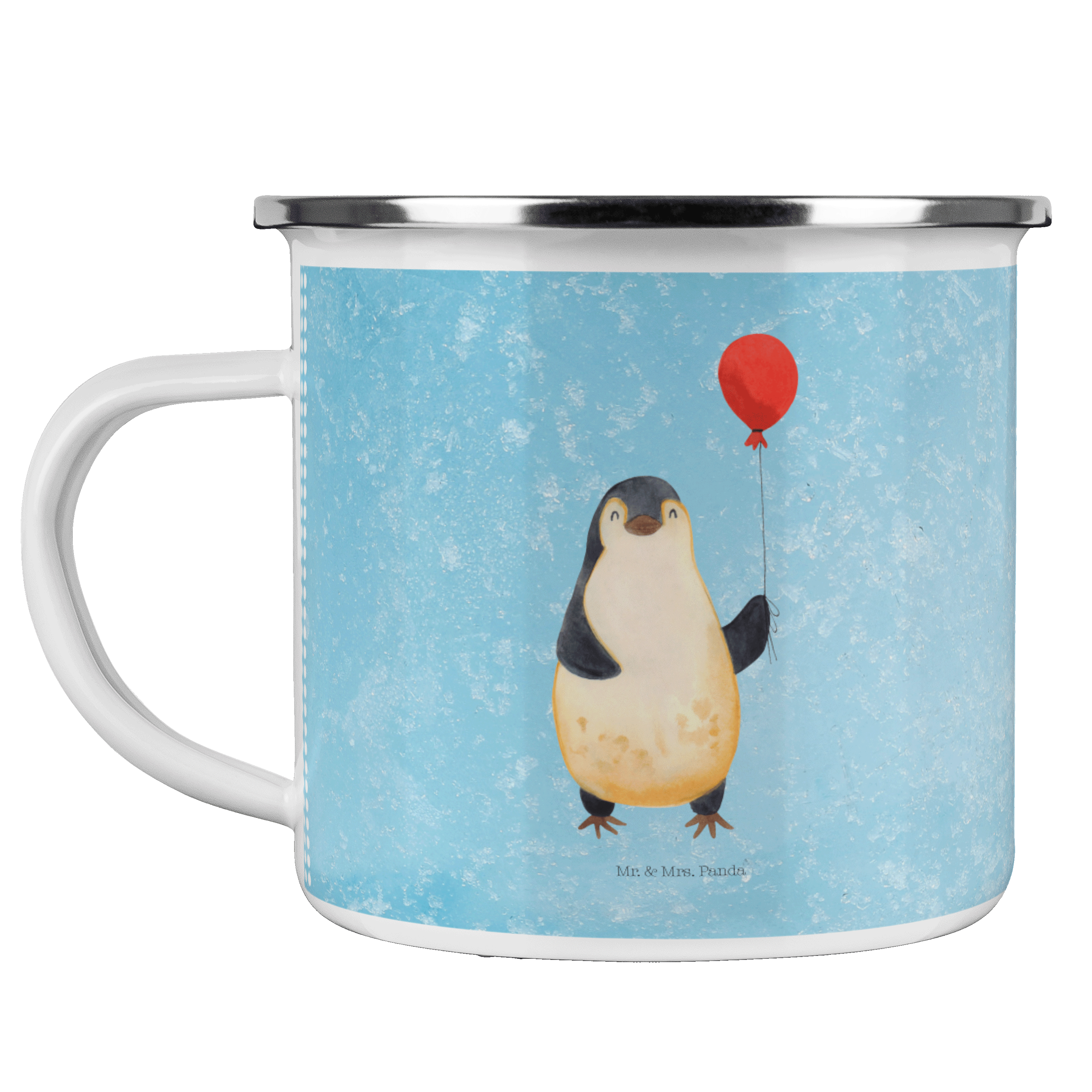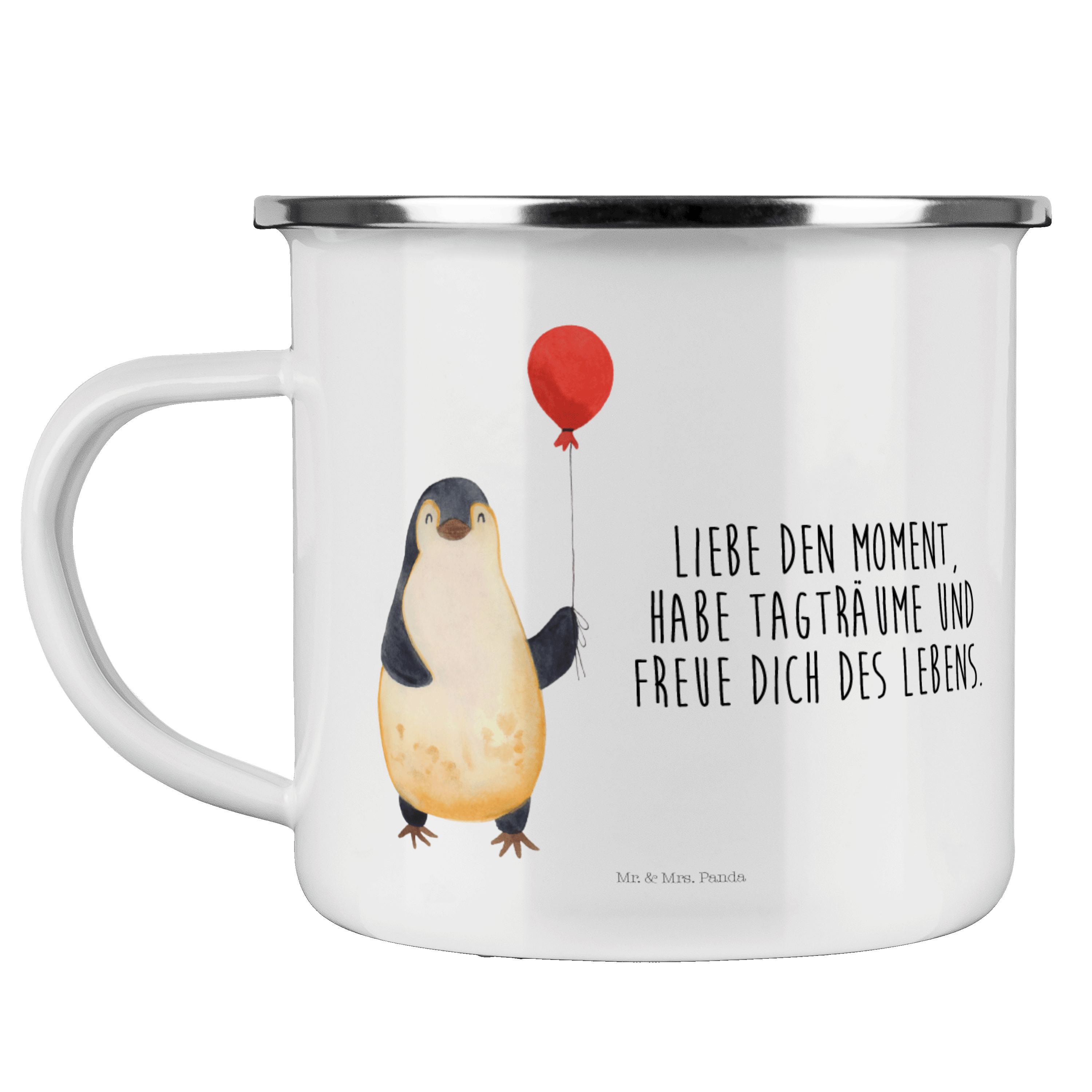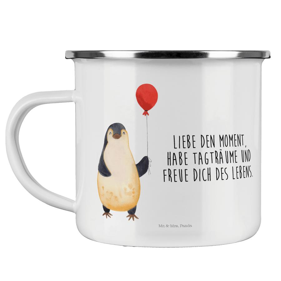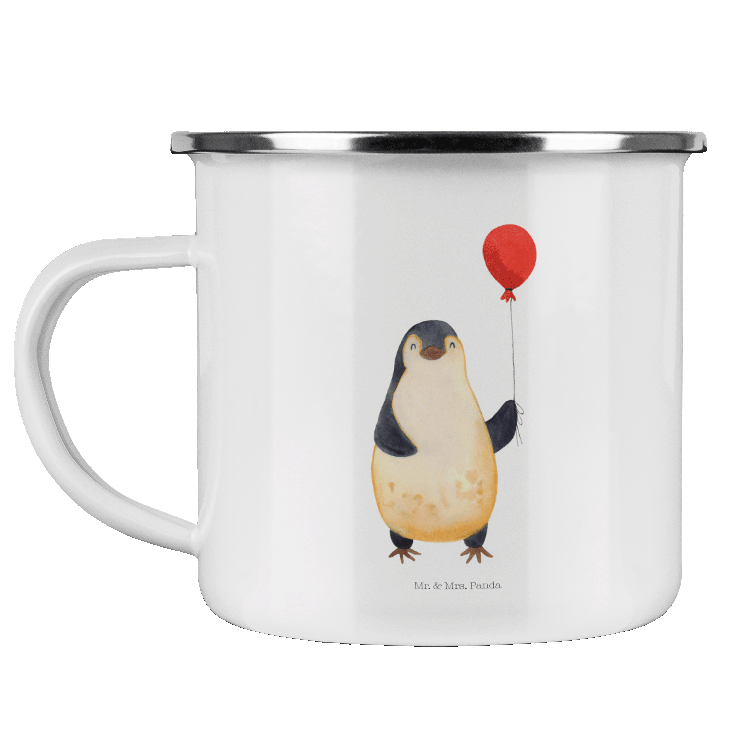 Camping Emaille Tasse Pinguin Luftballon - mit Spruch - Weiß