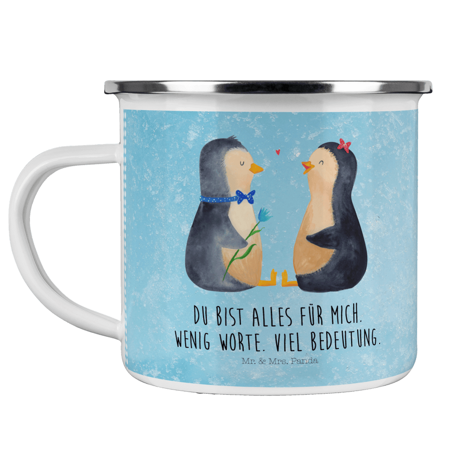 Camping Emaille Tasse Pinguin Pärchen - mit Spruch - Eisblau