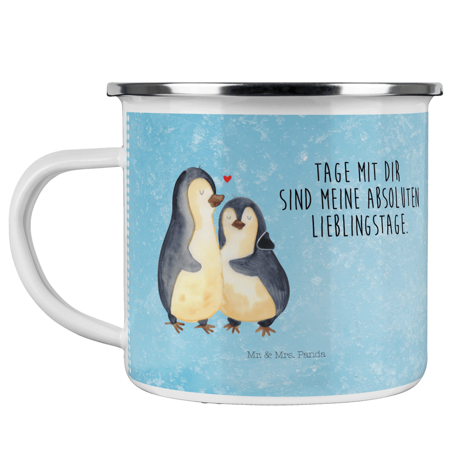 Camping Emaille Tasse Pinguin umarmend - mit Spruch - Eisblau