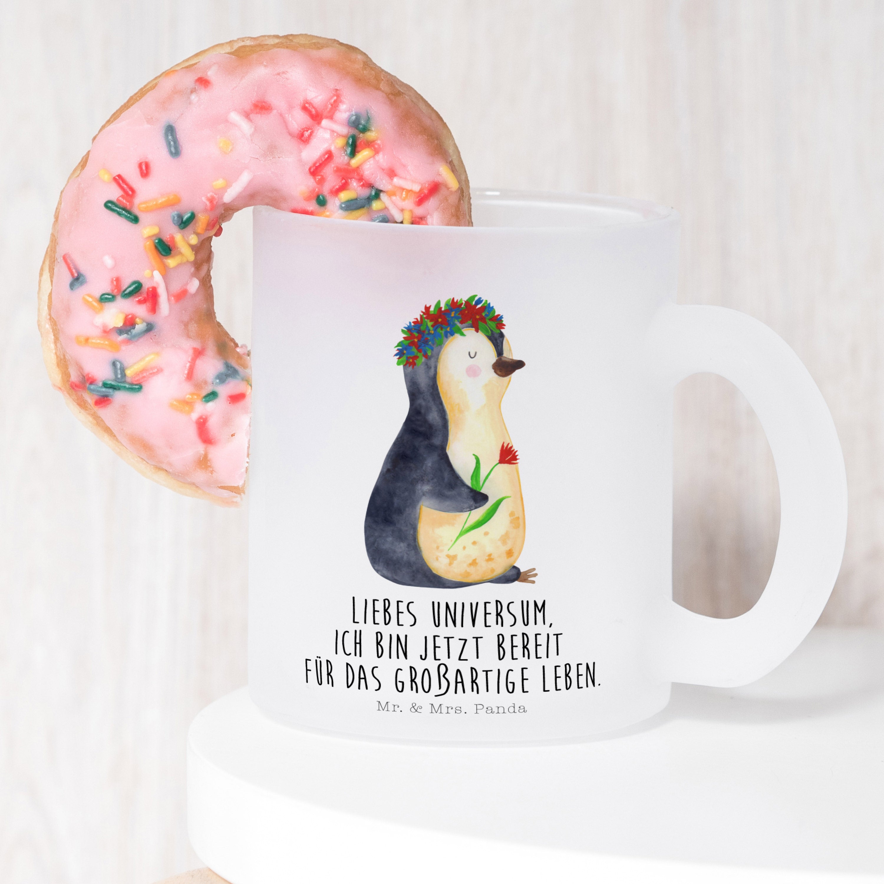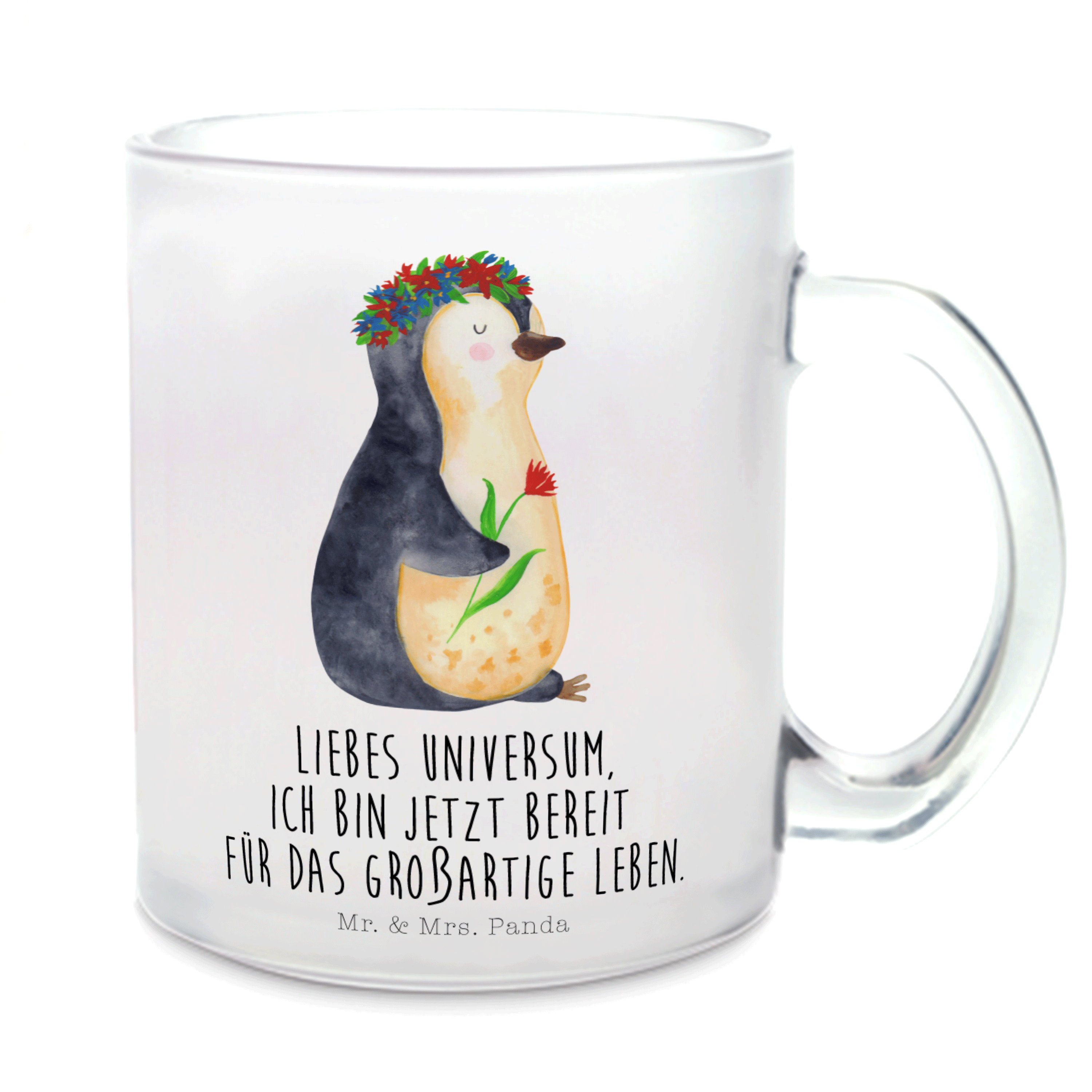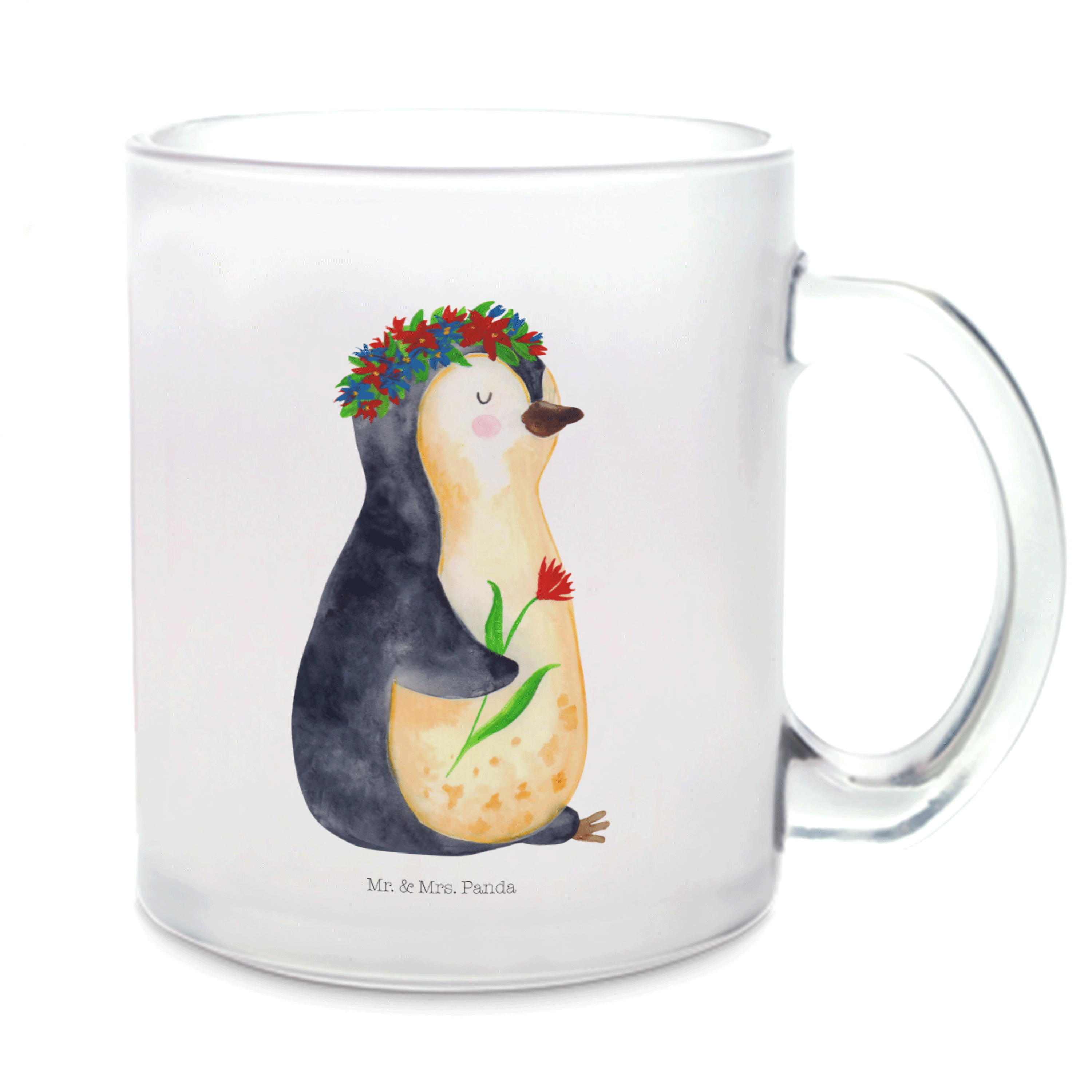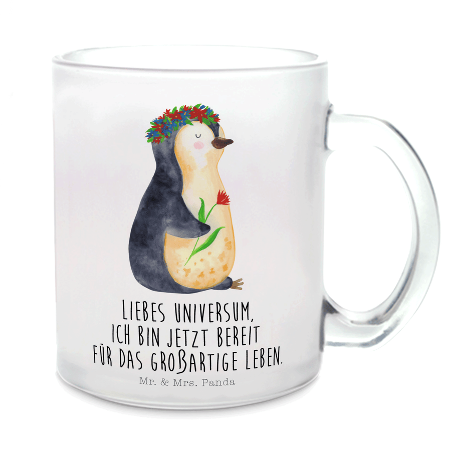 Teetasse Pinguin Blumenkranz - mit Spruch