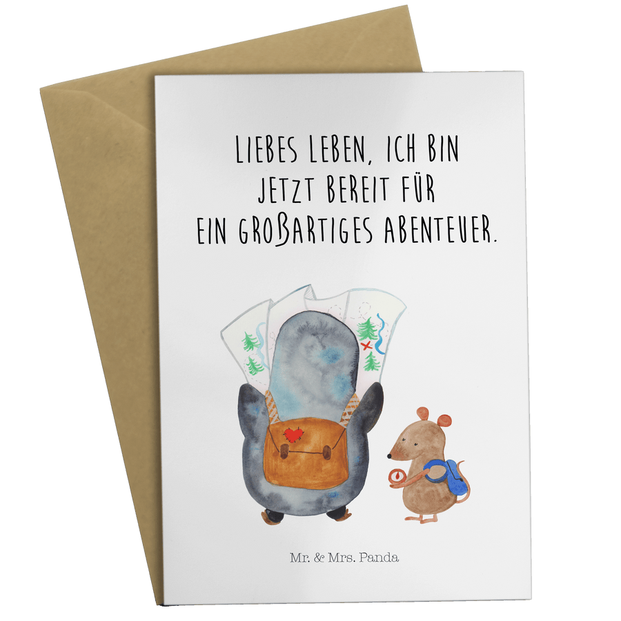 Grußkarte Pinguin & Maus Wanderer - mit Spruch - Weiß