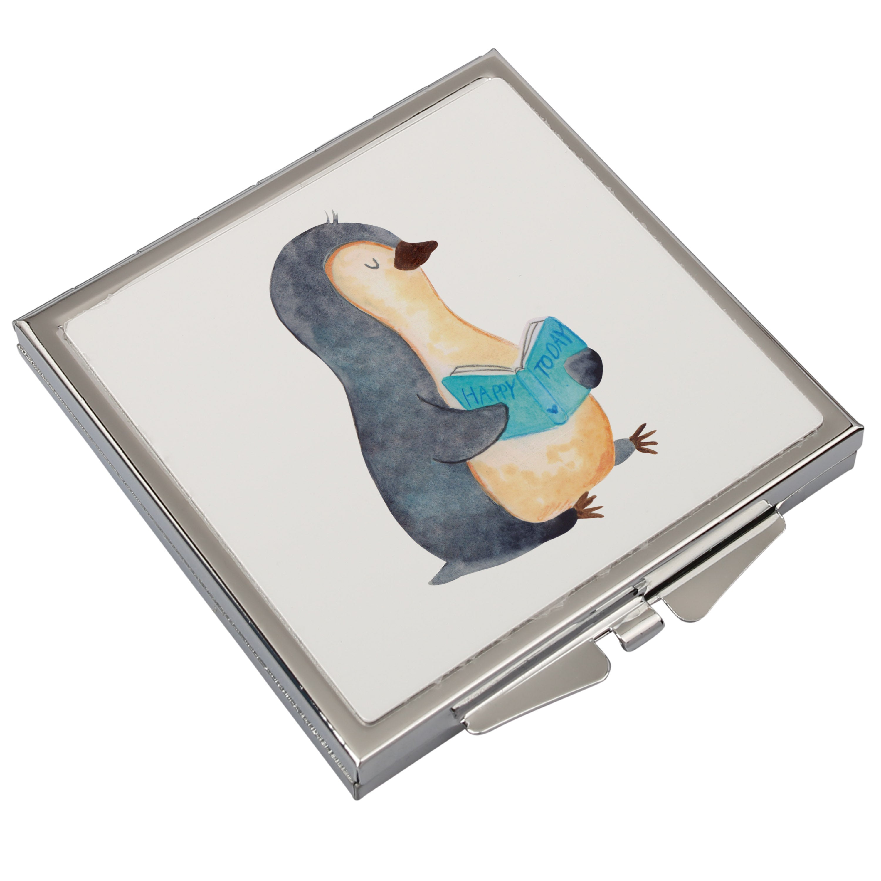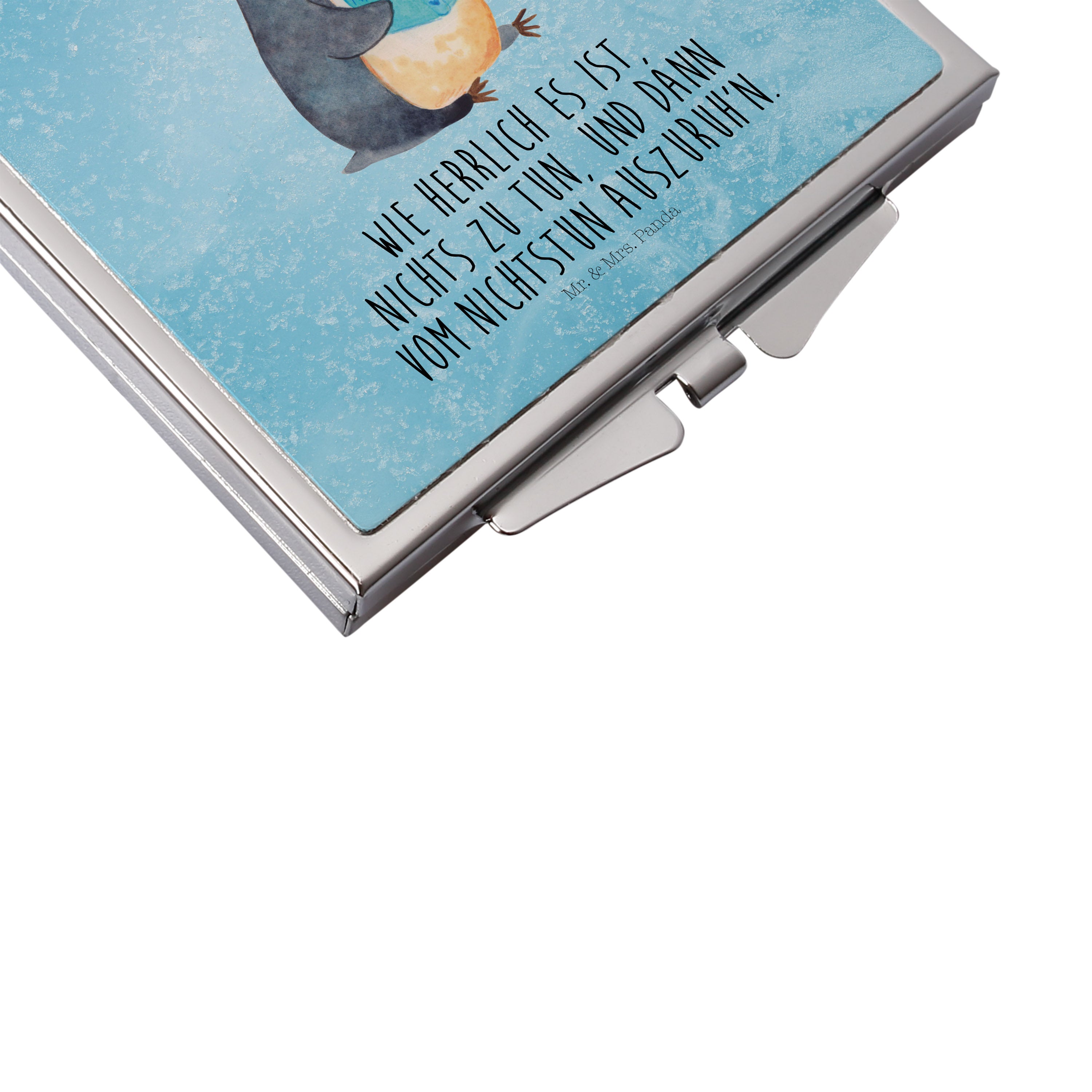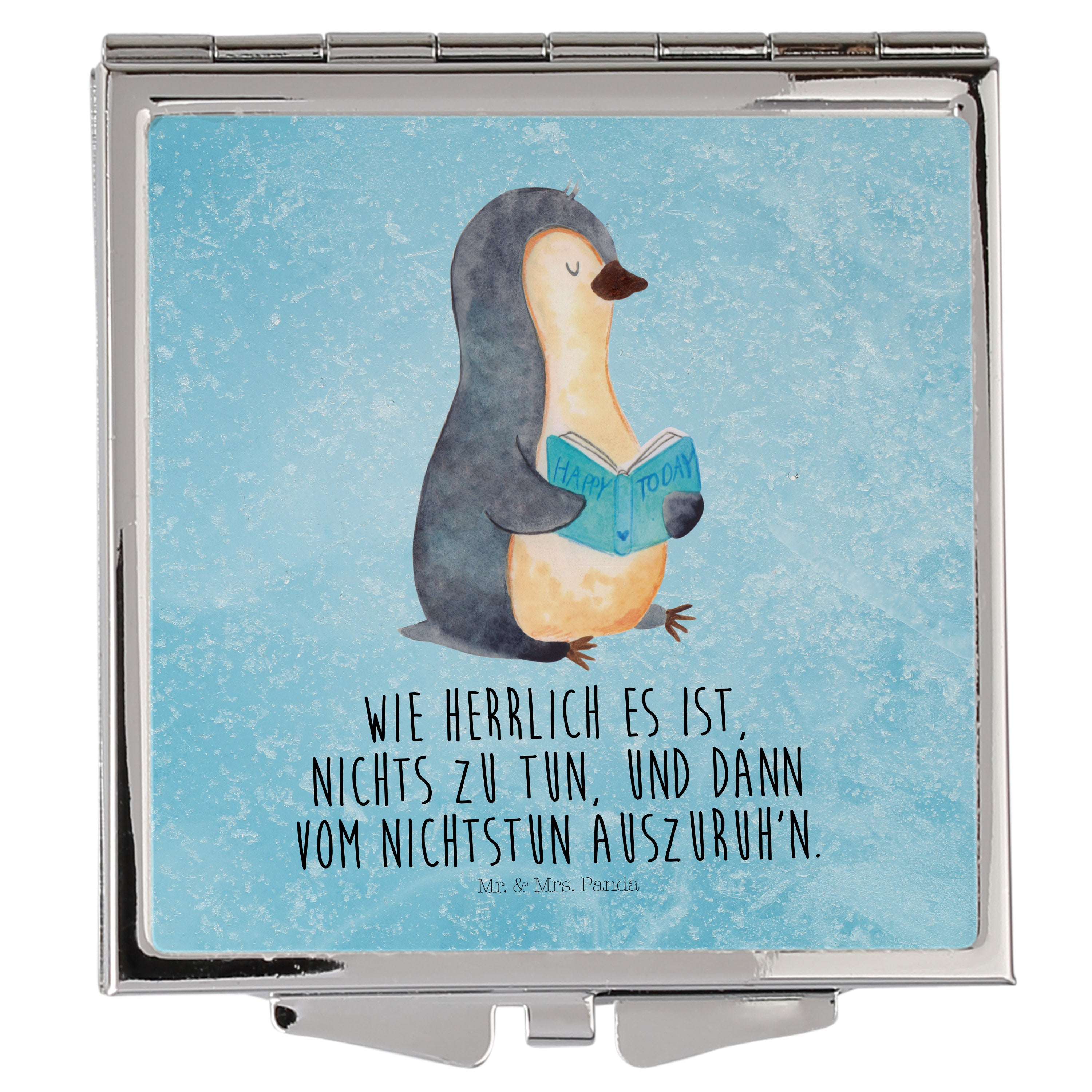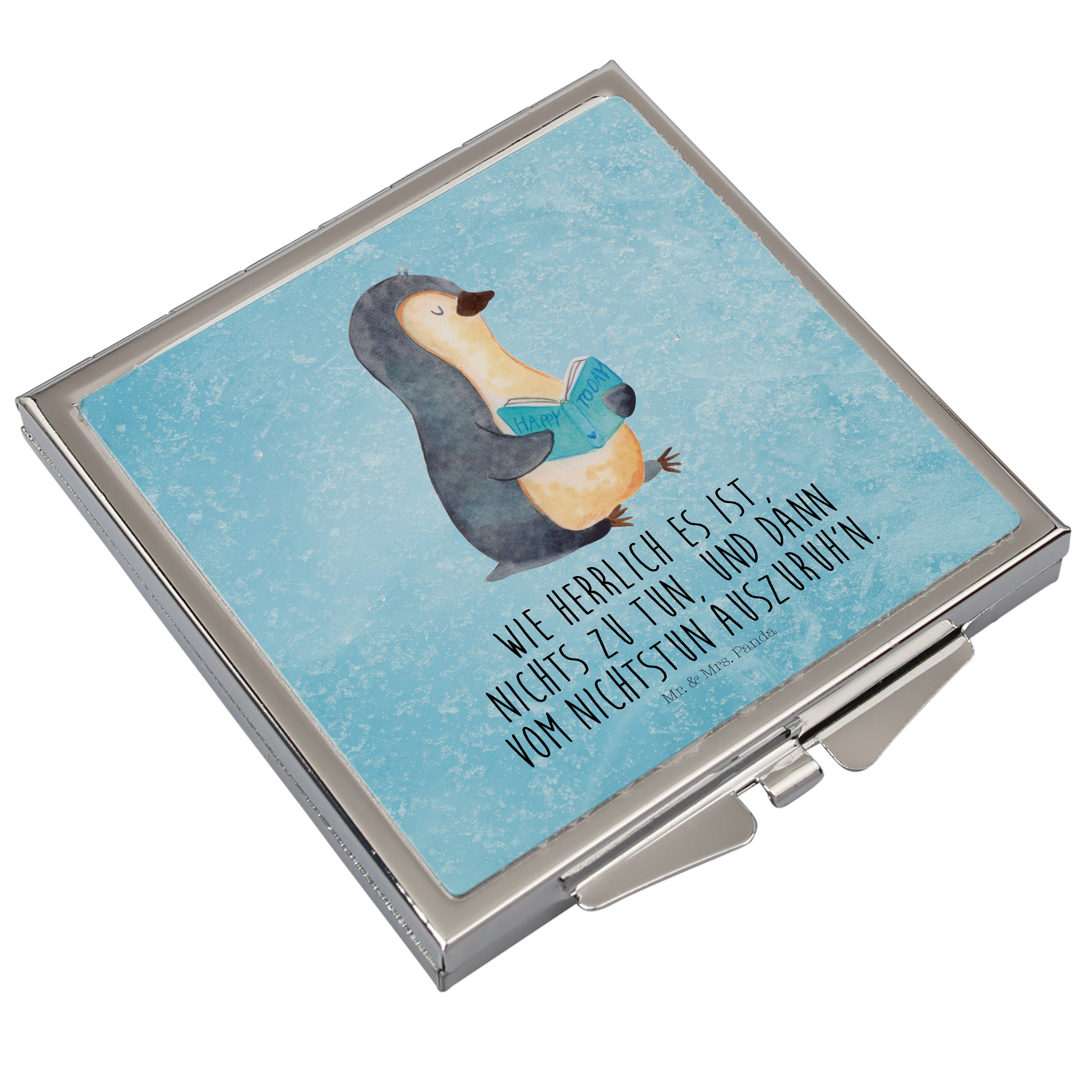 Handtaschenspiegel quadratisch Pinguin Buch - mit Spruch - Eisblau
