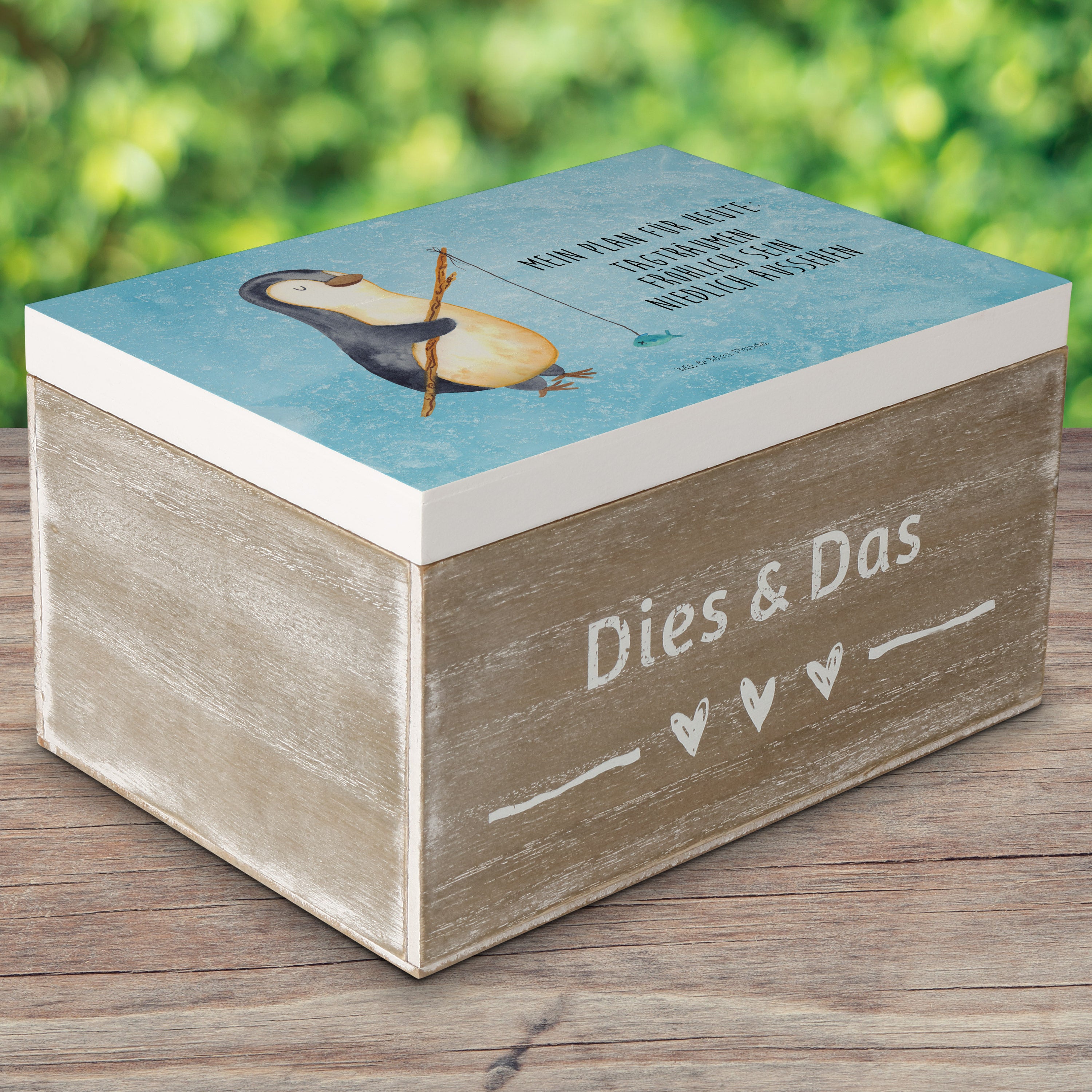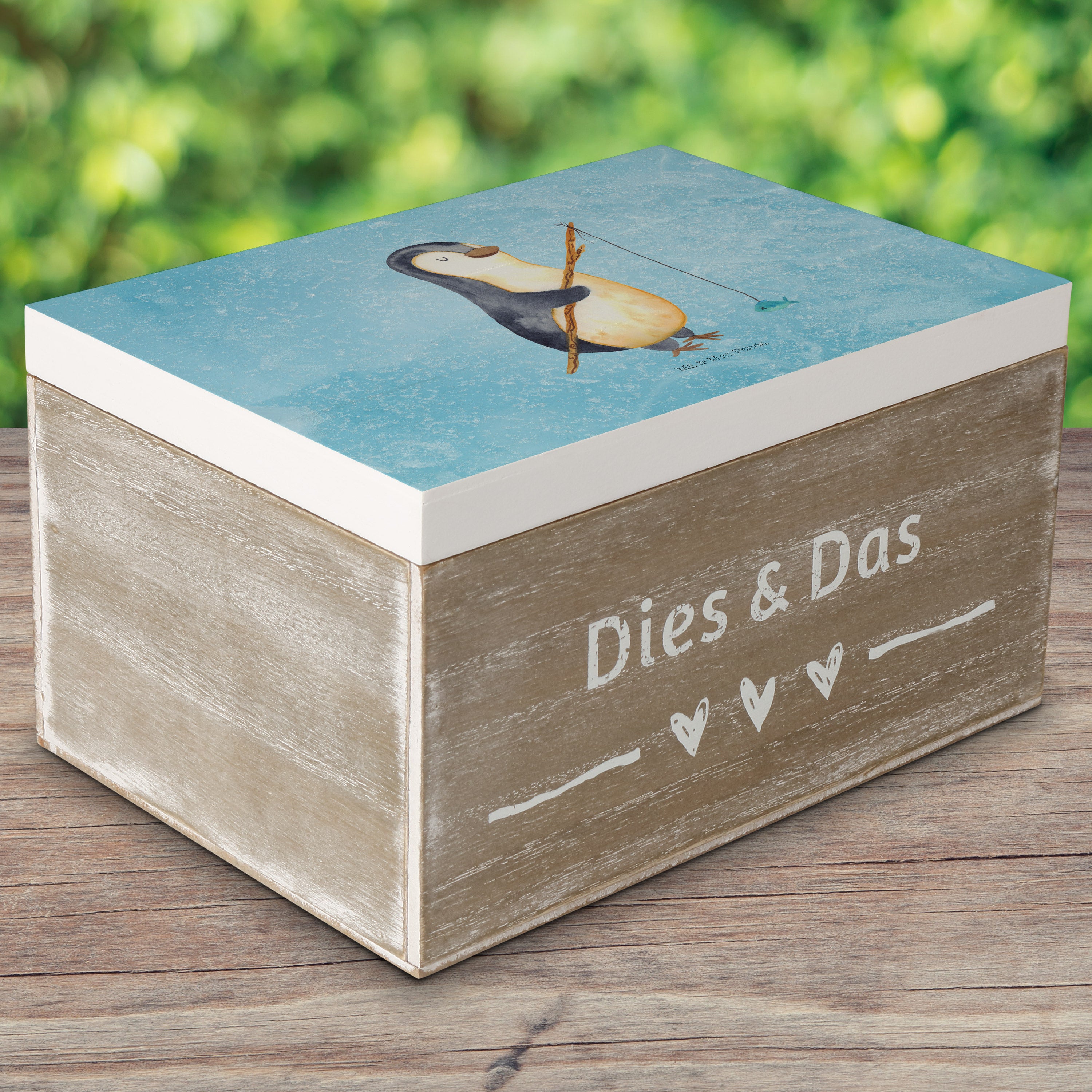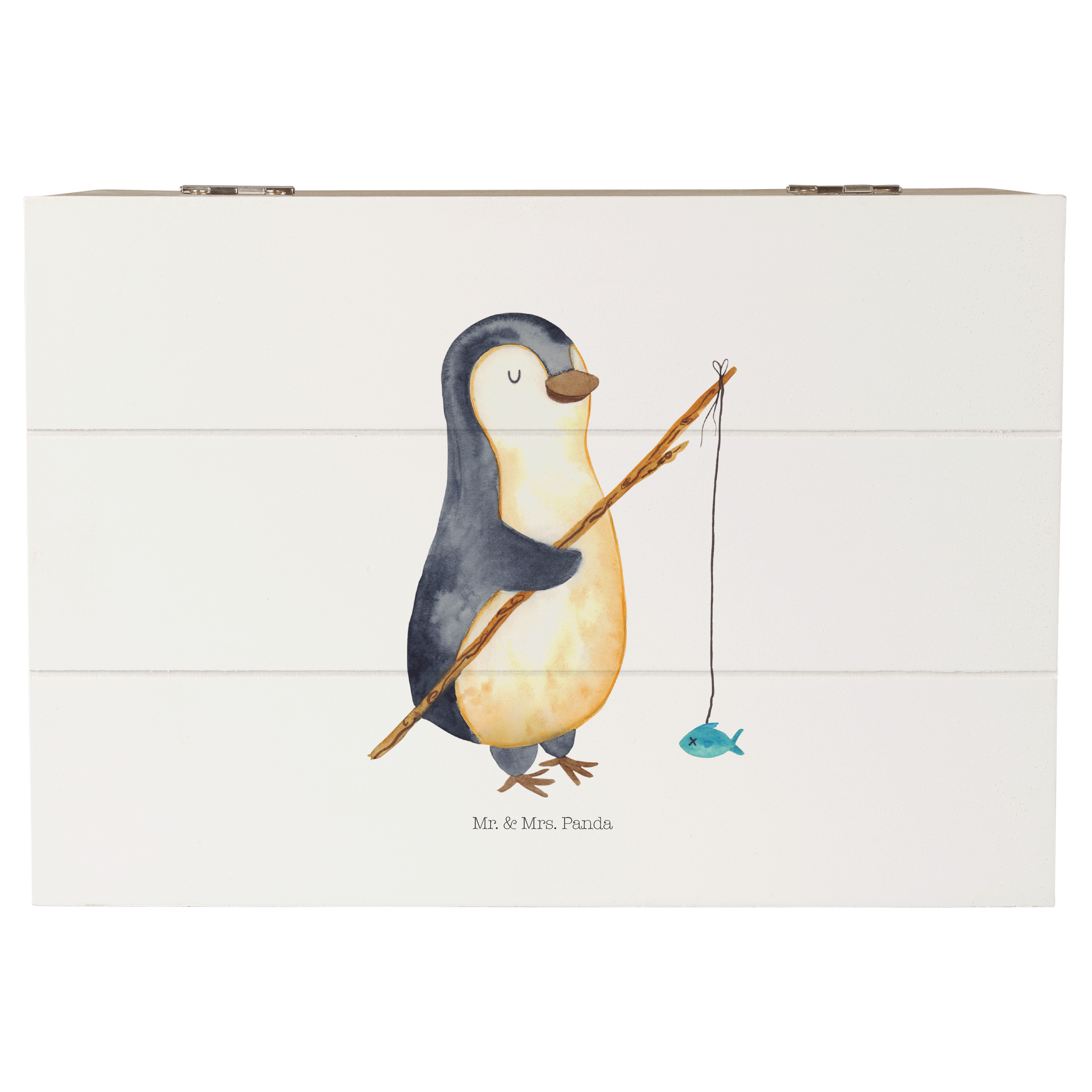 Holzkiste Pinguin Angler - 25 x 18 cm - mit Spruch - Weiß