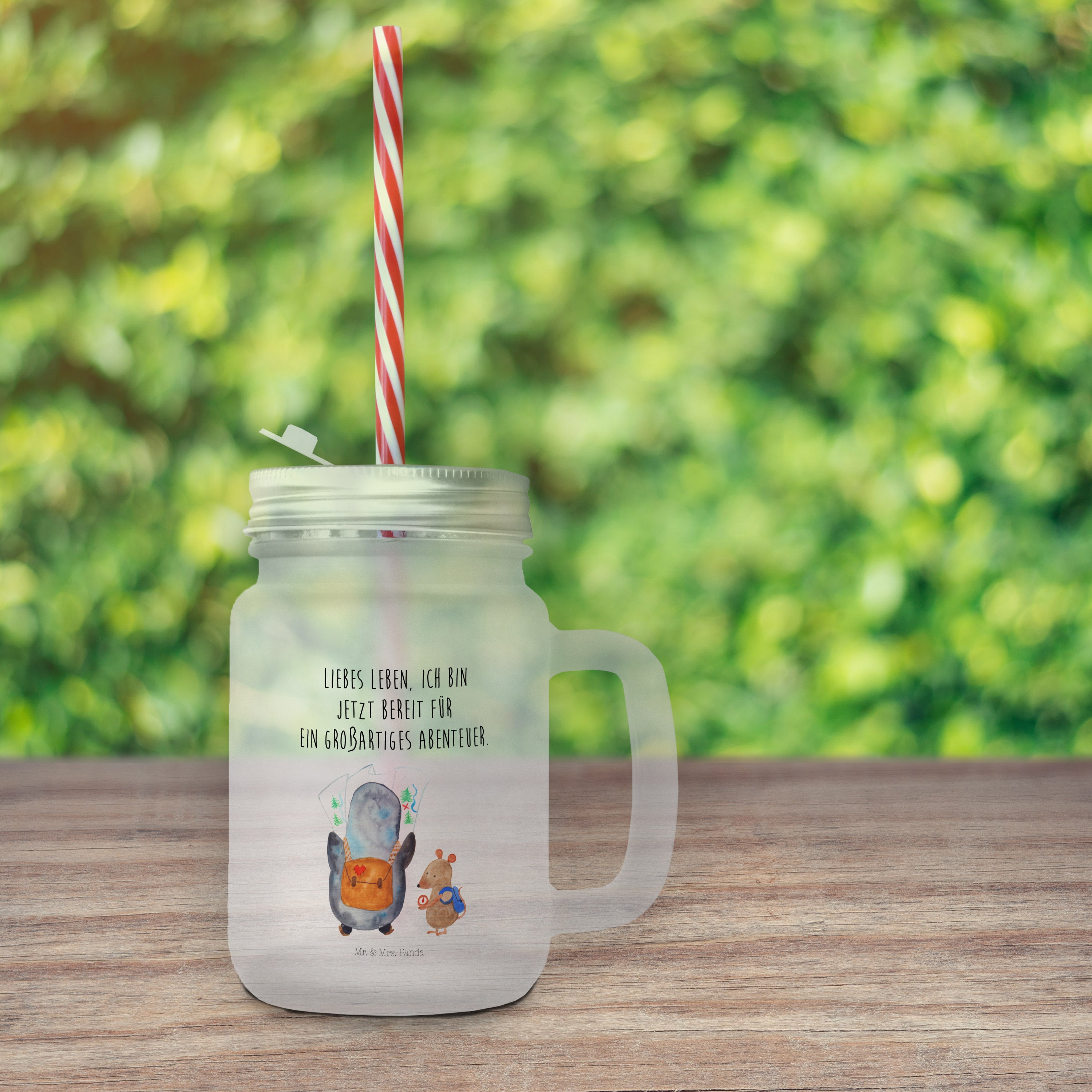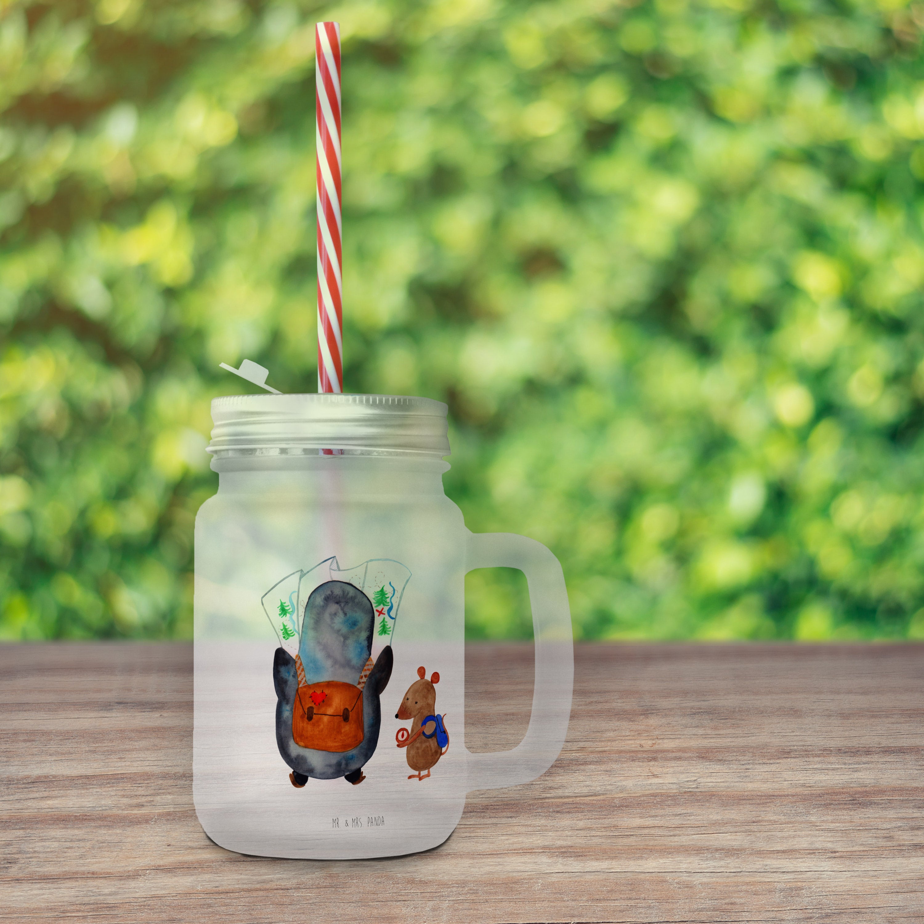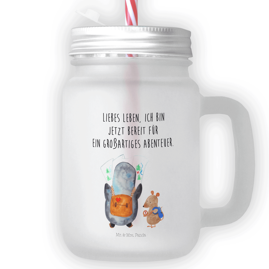 Trinkglas Mason Jar Pinguin & Maus Wanderer Mason Jar, Glas, Trinkglas, Henkelglas, Sommerglas, Einmachglas, Cocktailglas, Cocktail-Glas, Mason Jar Trinkglas, Satiniertes Glas, Retro-Glas, Strohhalm Glas, Schraubdeckel Glas, Sommerparty Einrichtung, Pinguin, Pinguine, Abenteurer, Abenteuer, Roadtrip, Ausflug, Wanderlust, wandern
