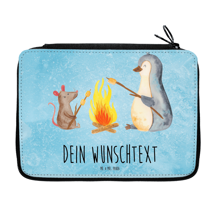 Personalisierte Federmappe Pinguin Lagerfeuer - Eisblau