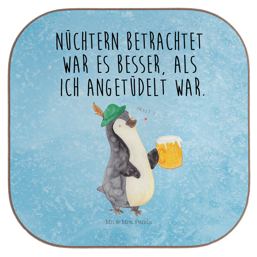 Quadratische Untersetzer Pinguin Bier - mit Spruch - Eisblau