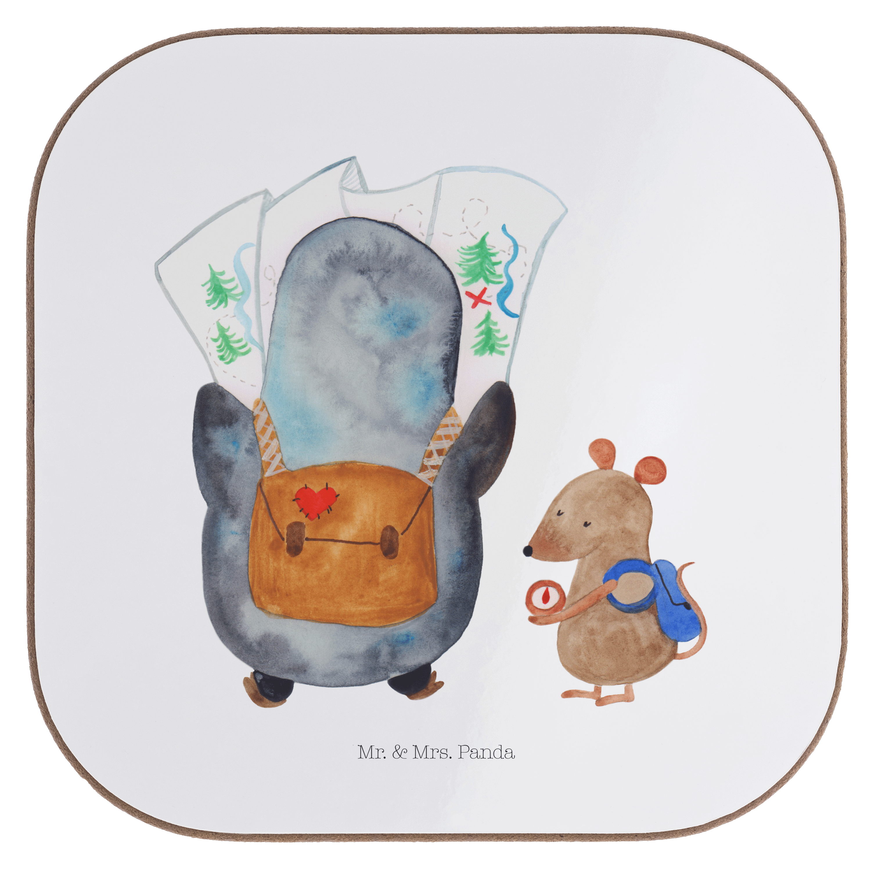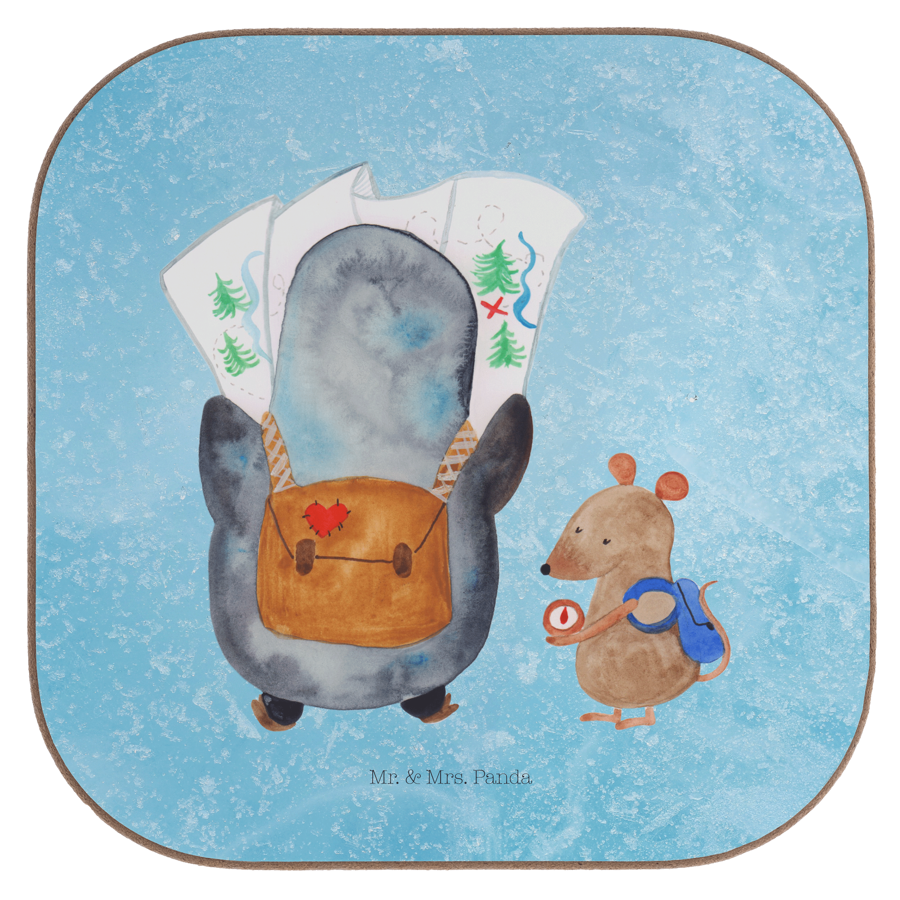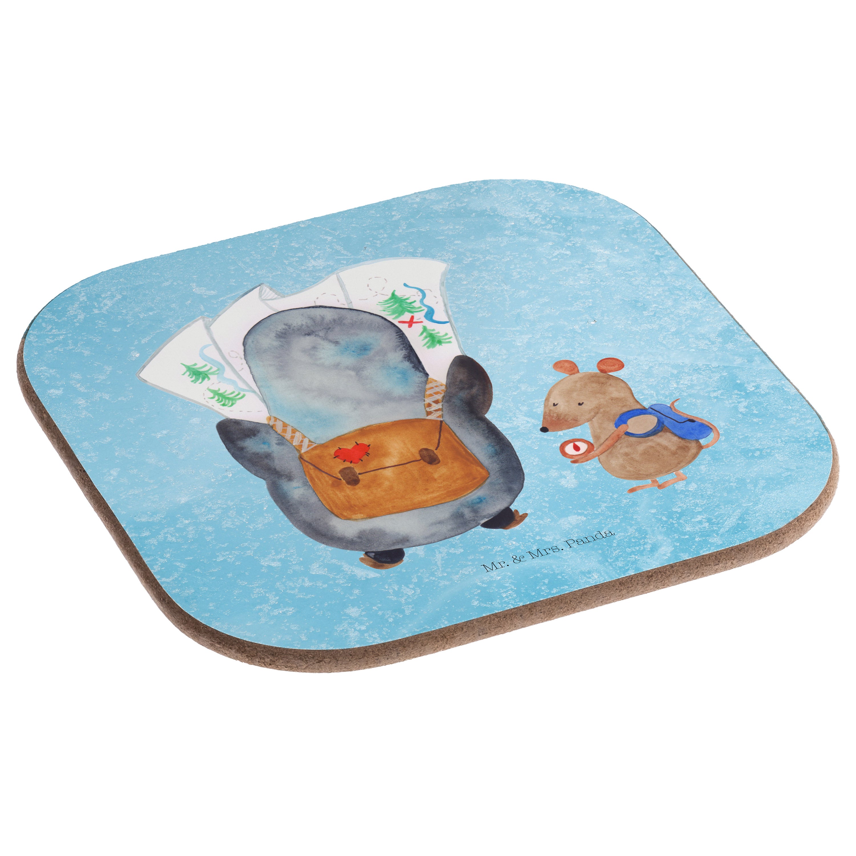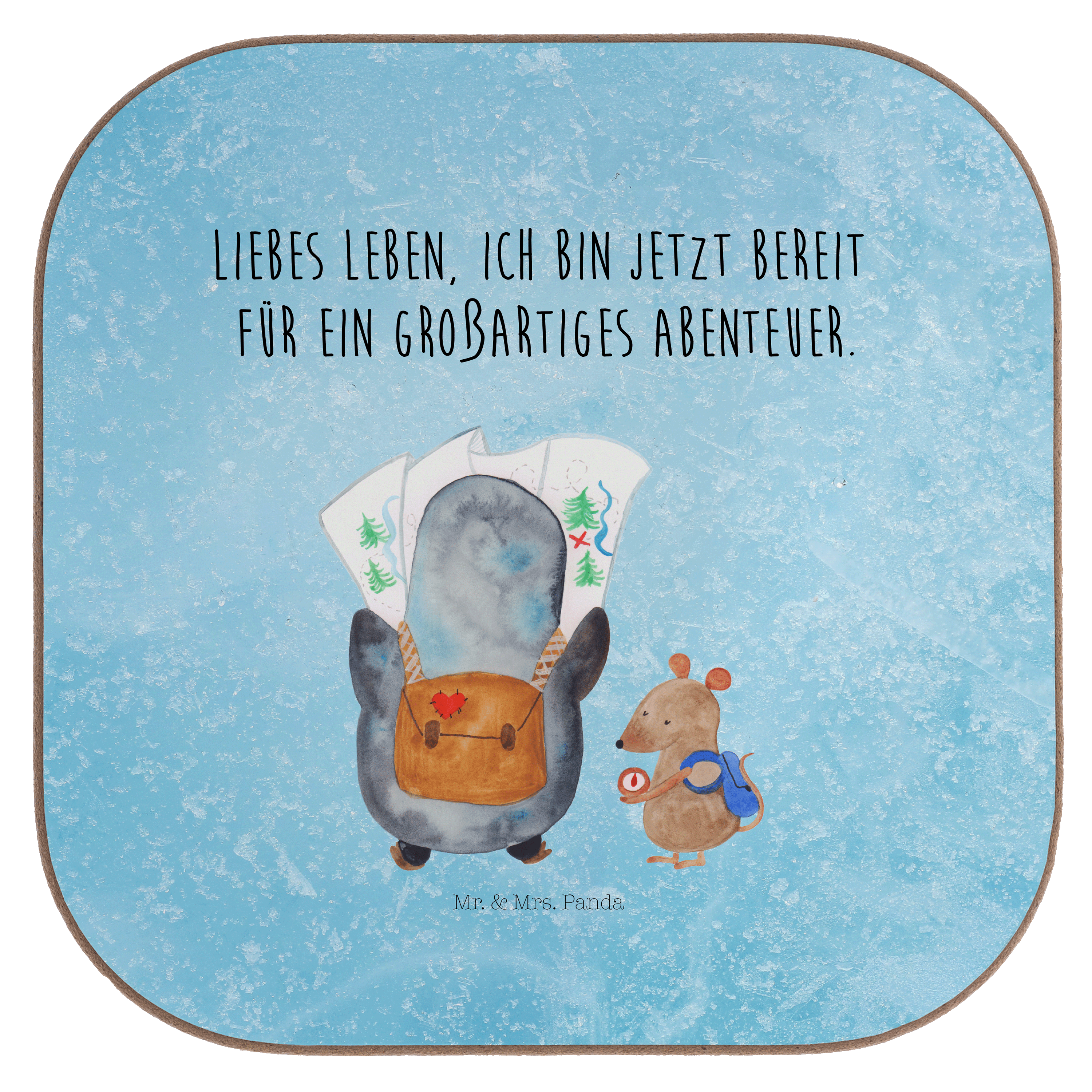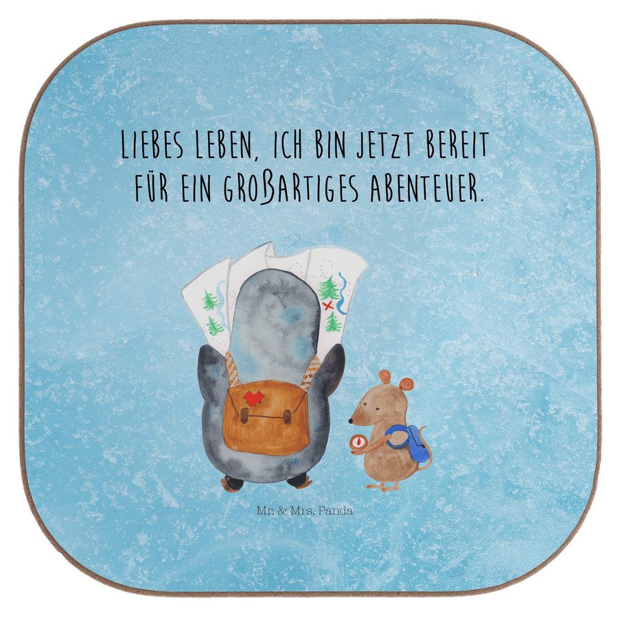 Quadratische Untersetzer Pinguin & Maus Wanderer - mit Spruch - Eisblau