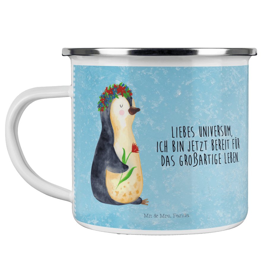 Camping Emaille Tasse Pinguin Blumenkranz - mit Spruch - Eisblau