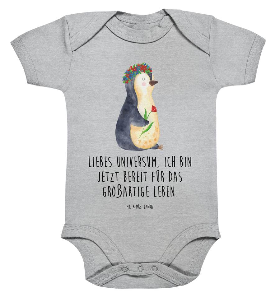 Organic Baby Body Pinguin Blumenkranz - 3. - 6. Monat - mit Spruch - Heather Grey